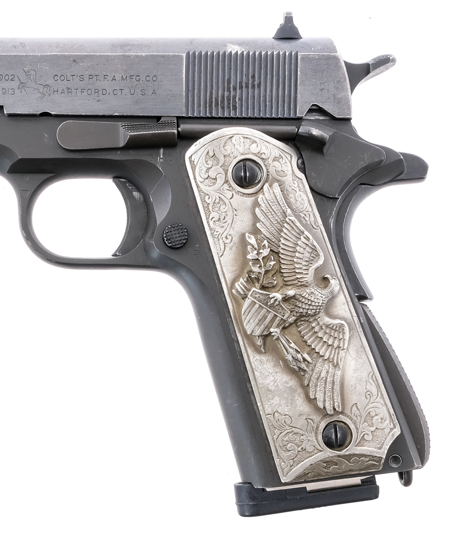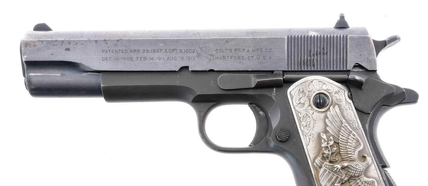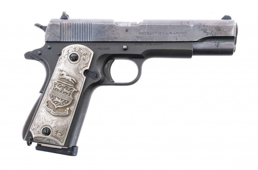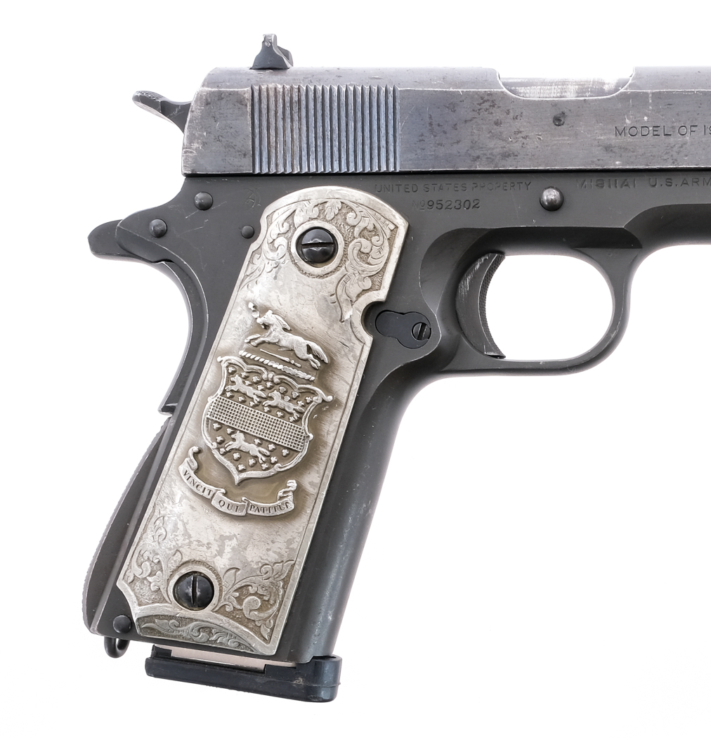 Description Colt 1911 A1 in .45 caliber with one, seven round removable magazine and a 5″ barrel. Metal aftermarket grips with a American Eagle on one side and a Latin phrase on the other that says, ” He Who Suffers Wins”. Parkerized frame and checkered solid trigger. Blued checkered hammer and serrated slide. Magwell located lanyard loop. Left side of frame checkered slide release and slide stop safety. Lower left side of frame checkered magazine release button. Backstrap grip depression safety. Front and rear white DOT fixed sights. G.H.D. inspector proof marked frame. Comes with one Wilson Combat magazine. Must ship to a C&R or FFL holder. Condition: Good/Very good with mismatched slide, finish wear/loss and touches of metal oxidation. Clean rifled bore. Barrel Length: 5″ Serial: 952302 Manufacturer: Colt Year: 1943 Caliber: .45 ACP Model: 1911A1 Book# 8-835