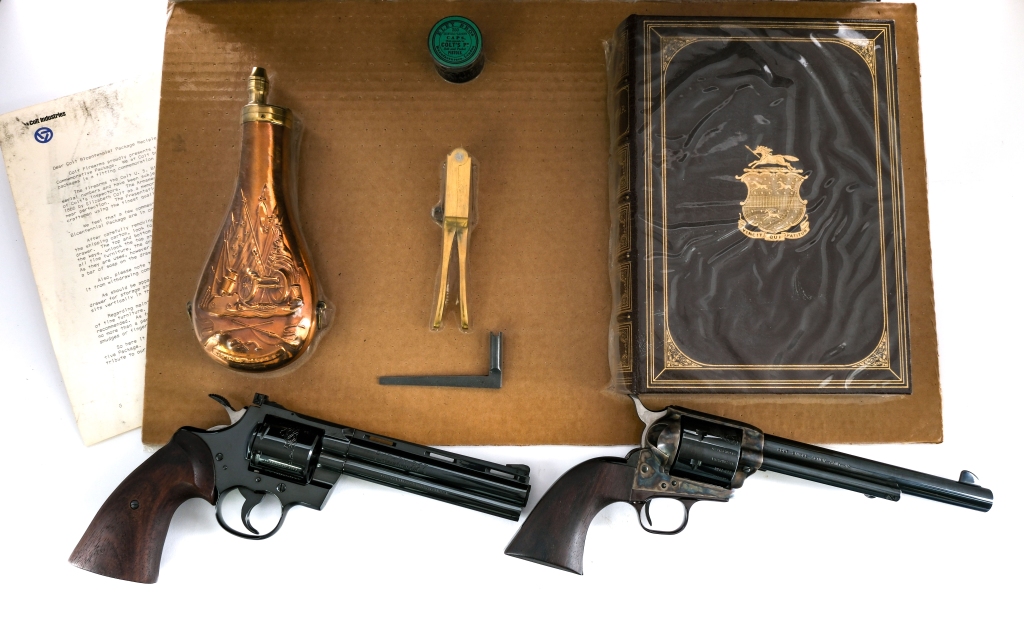 Description Colt U.S. Bicentennial 1776-1976 Cased and matched set comprised of three revolvers from different eras. First is a Single Action Army chambered in .45 Colt with a six-shot cylinder and a 7.5″ barrel. Glossy blued barrel, unfluted cylinder, single action trigger, hammer, and grip frame. Case colored frame. Smooth walnut grips with Presidential Seal. Rear notch and fixed front blade sights. The left side of the barrel is stamped “1776 – U.S.A. BICENTENNIAL – 1976”. The top of the barrel is marked “COLTS PT. F.A. MFG CO. HARTFORD CT. U.S.A.”. The cylinder is marked with the U.S. flag and the names of the first thirteen states. Serial number 0072PM. The second revolver is a Colt Python chambered in .357 Magnum with a six-shot cylinder and a 6″ vented rib barrel. Full glossy blued finish. Smooth wood grips with Presidential Seal. Adjustable rear notch and fixed ramped front blade. The left side of the barrel is marked “1776 – U.S.A. BICENTENNIAL – 1976”. The cylinder is unfluted and marked with the U.S. Capitol, Statue of Liberty, and the Liberty Bell, among multiple U.S. Mottos. Serial number 0072PY. The third and final revolver is a Colt 3rd Model Dragoon Percussion revolver chambered in .44 Caliber with a 7.5″ barrel. Blued barrel, wedge, engraved receiver, and single action trigger. Case colored ram rod, frame, and hammer. Silver grip frame and trigger guard. Smooth wood grips with Presidential Seal. Rear notch and front bead sights. The left side of the barrel is marked “1776 – U.S.A. BICENTENNIAL – 1976”. Includes brass powder flask, Colt nipple container, nipple wrench, and bullet mold. Serial number 0072DG. This set comes essentially how it was delivered from the factory, Including its outer shipping box. Comes with Comes in its Walnut display case with three lockable compartments for each revolver and red velvet interior. Comes with factory paper work and sealed copy of “Armsmear: the Home, the Arm, and the Armory of Samuel Colt. A Memorial.”, powder flask, nipple wrench, bullet mold, and percussion cap case. Also included is the Colt Styrofoam case/cardboard boxes for each revolver. The SAA and Python must ship to a FFL holder. The Dragoon can ship directly to buyers home in MOST states if requested. Additional shipping charge, due to multiple revolvers and wood case. Condition: New in its original shipping having been unused/unfired and well stored. The revolvers appear to have been handled very little. The silver frame of the dragoon has darkened and patinated a bit with age. The SAA frame looks to have a little bit of pluming from storage/age. All three have bright and clean bores with strong rifling. The wood case is in great shape with very little handling wear. The case does show one small puncture in the wood and the rear, likely from shipping. The brass handles and fittings on the display case have a few very light spots discoloration/tarnish from age. The original Cardboard boxes have light wear and tear from handling. Barrel Length: 7.5″ Serial: 0072PM 0072PY 0072DG Manufacturer: COLT Year: 1976 Caliber: .45 Colt, .357 Magnum, .44 Model: SAA, Python, Dragoon Book# 08445 08447