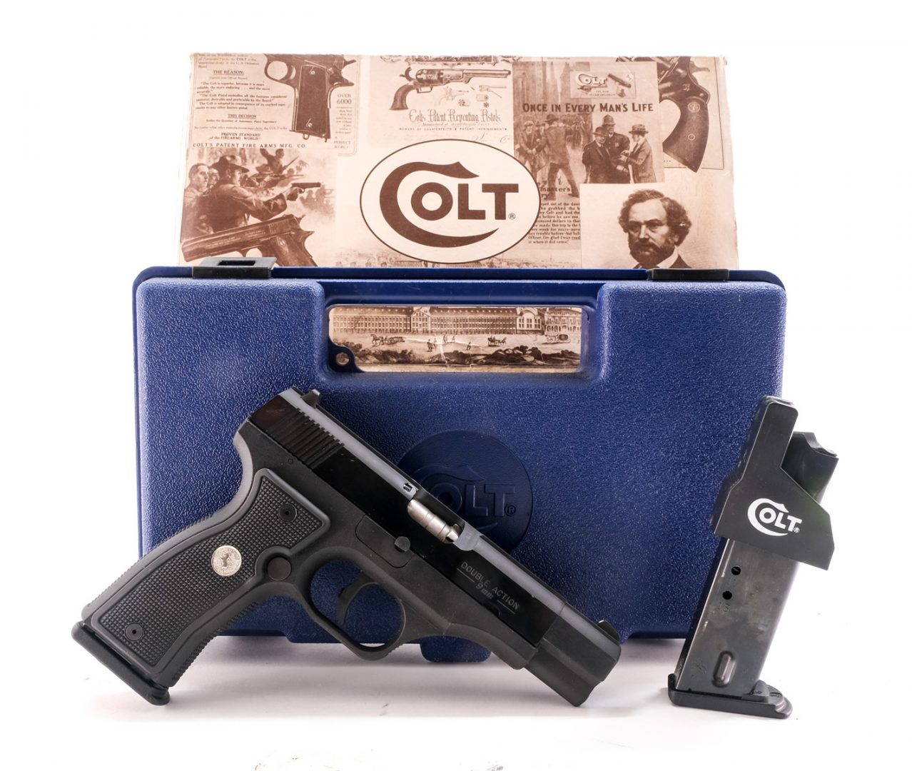Description Colt All American 2000 in 9mm with two, fifteen round (High Capacity) removable magazines with a 4.5″ barrel. Checkered Colt composite grip plates. Black finished frame and blued serrated slide. Fixed white dot sights. Composite smooth trigger. Left side of frame serrated slide release. Left side of grip magazine release button. Comes with its factory outer box and hard case with matching serial number, instruction manual, speed loading device, allen wrench, cleaning brush and two magazines. Check local/State laws on (High Capacity) magazines before bidding. This semi-automatic pistol must ship to a FFL holder.