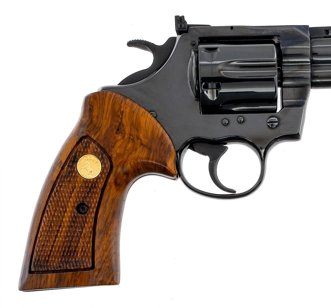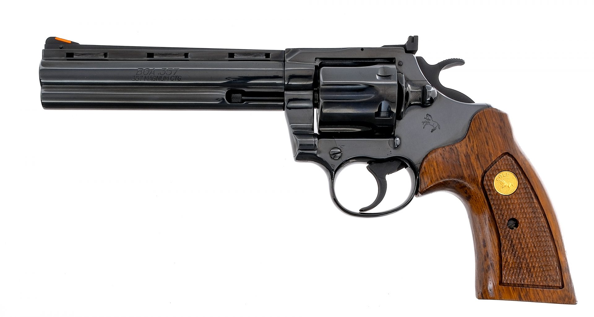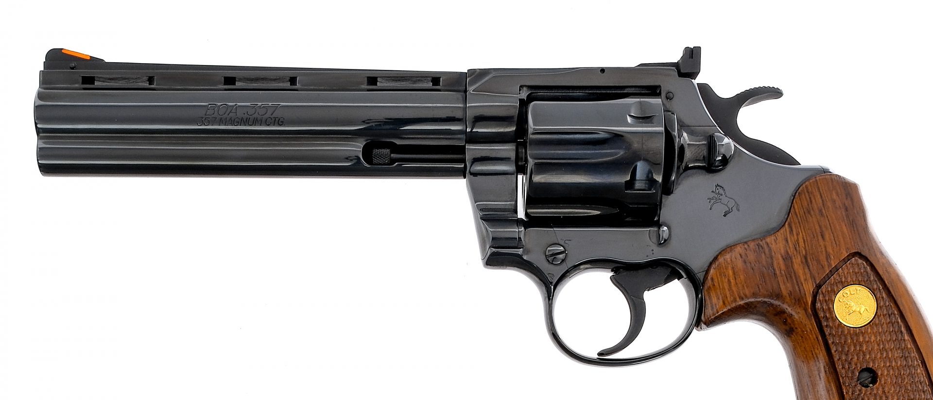 Description Colt BOA chambered in .357 Magnum with a six-shot cylinder and a 6″ vented rib barrel. Manufactured in the only year of production, 1985, as a limited run with serial number BOA1196. Making this revolver 1 of only 1200 total Colt BOA’s produced and 1 of only 600 with a 6″ barrel configuration. Python style BOA barrel on Trooper MK V style frame with glossy blue finish. Matte blue finished double action trigger and hammer. Checkered wood grips with gold Rampant Colt medallions. Adjustable U-notch rear sight and fixed red ramp front blade sight. Comes in its factory Colt box with matching serial number and factory paperwork. Condition: Like new with tags, showing 99% plus original finish aside from a faint cylinder turn line. Very little handling wear mainly from operating the cylinder and appears to show no signs of being fired. Grips are in fantastic condition with noticeable wear. The bore is very bright/clean with strong rifling. The original box is in great condition with some light scratches/tears and bent/worn edges/corners. Barrel Length: 6″ Serial: BOA1196 Manufacturer: COLT Year: 1985 Caliber: .357 Magnum Model: BOA V5061 Book# 02683