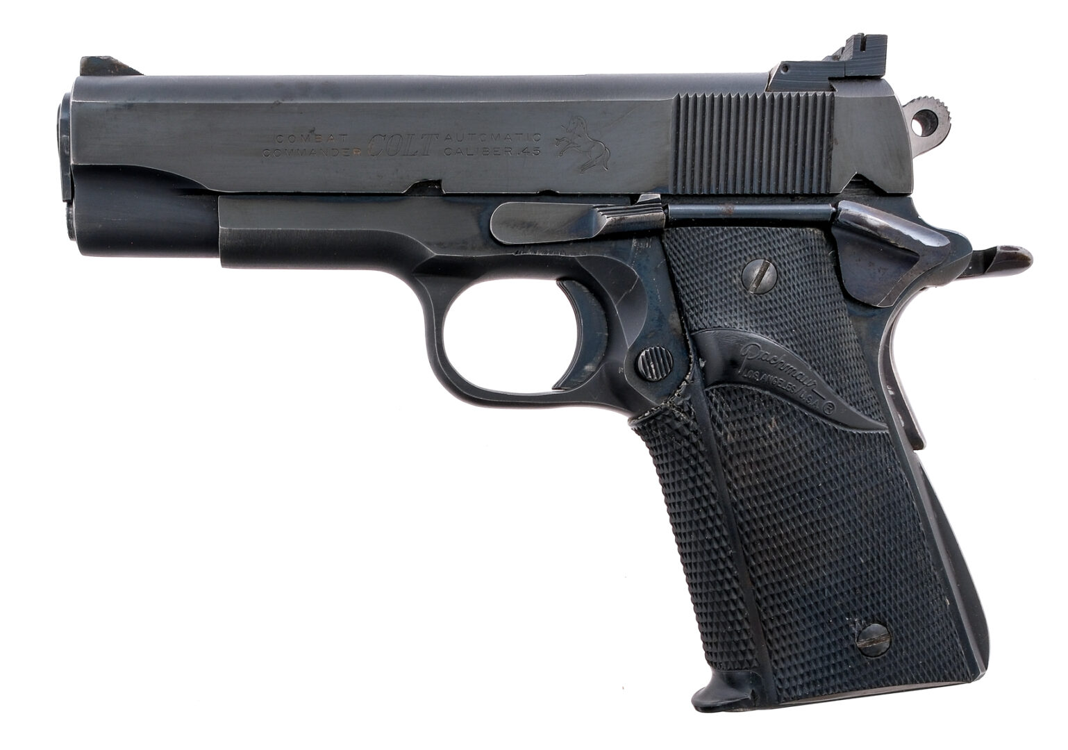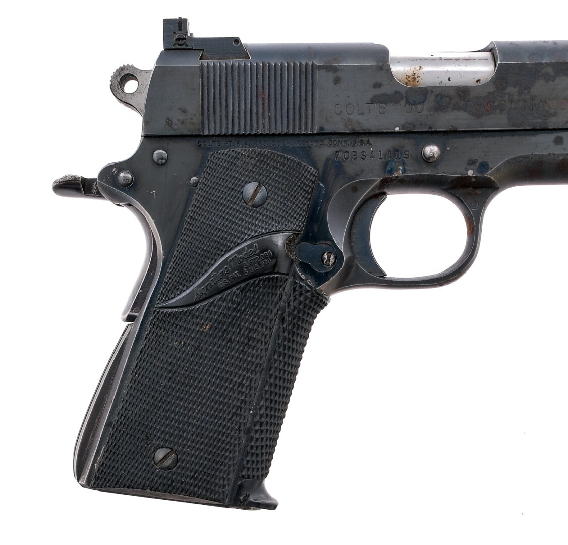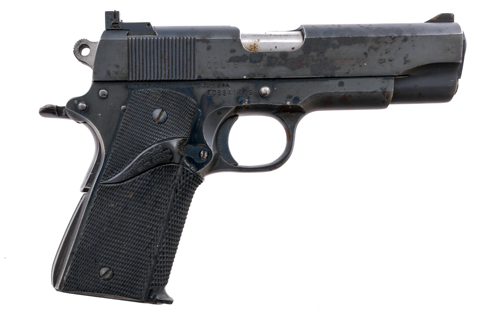 Description Colt Combat Commander in .45 caliber with one, eight round removable magazine and a 4.5″ barrel. Checkered rubber pachmayr wrap around grip. Blued frame, serrated trigger, hammer and slide. Left side of frame serrated magazine release, slide release and slide stop safety. Rear adjustable and front fixed blade sight. Large aftermarket grip safety with large beavertail. Must ship to a FFL holder. Condition: Fair with spots of rust mostly on the right side of pistol and handling wear. Clean rifled bore. Barrel Length: 4.5″ Serial: 70BS41419 Manufacturer: Colt Year: 1976 Caliber: .45 ACP Model: Combat Commander Book# 01126