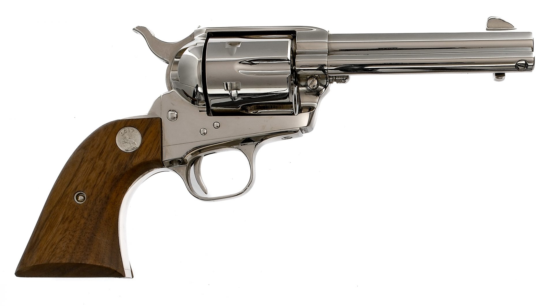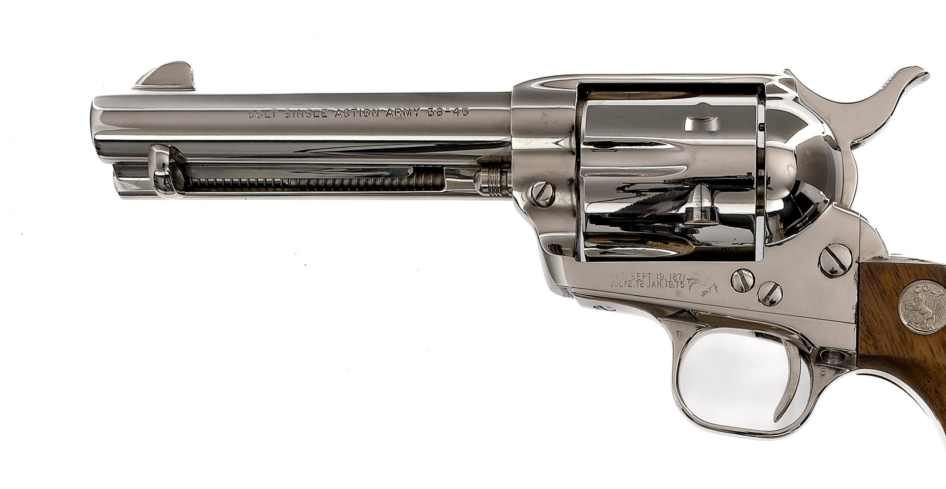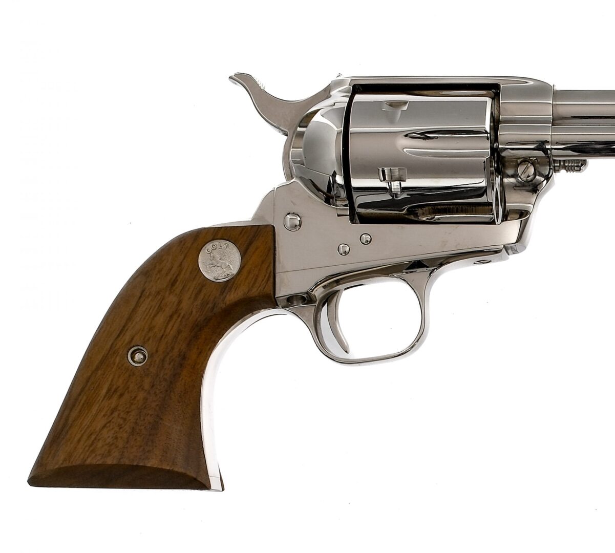 Description Colt Single Action Army in .38-40 with a six round capacity and a 4.75″ barrel. Smooth wood grip plates. Nickel finished trigger guard, trigger, frame, cylinder, hammer and barrel. Right side of frame loading gate. Under barrel cylinder release pin and extractor rod/housing. Comes in its factory box with matching serial number and instruction manual. Must ship to a FFL holder. Condition: New with tags. Clean rifled bore. Barrel Length: 4.75″ Serial: S05500A Manufacturer: Colt Year: 1993 Caliber: .38-40 Model: SAA Book# 02546
