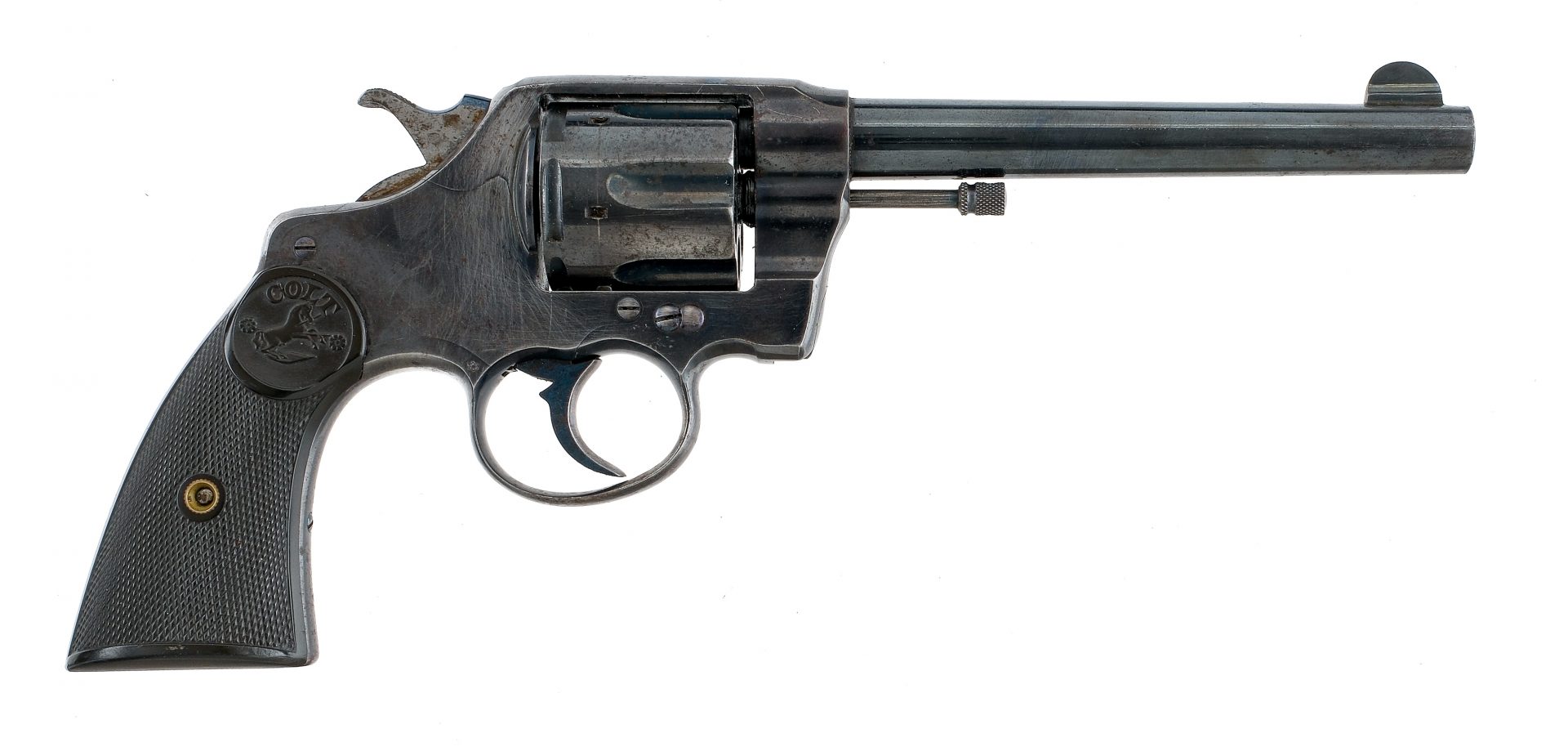 Description Colt Double Action 38 New Army in .38 Long Colt with a six round capacity and a 6″ barrel. Checkered composite grip plates. Blued trigger, frame, cylinder, checkered hammer and barrel. Left side of frame cylinder release. Rear notch and front fixed blade sight. Matching serial number on the bottom of pistol grip and underside of barrel. Matching production number on the crane, cylinder release lever and inside frame. Small six point star on the right rear of frame. Must ship to a C&R or FFL holder. Condition: Fair with scratches, finish wear/loss and spots of rust. The rifled bore has spots of rust. Barrel Length: 6″ Serial: 289211 Manufacturer: Colt Year: 1907 Caliber: .38 LC Model: DA 38 New Army Book# 04880