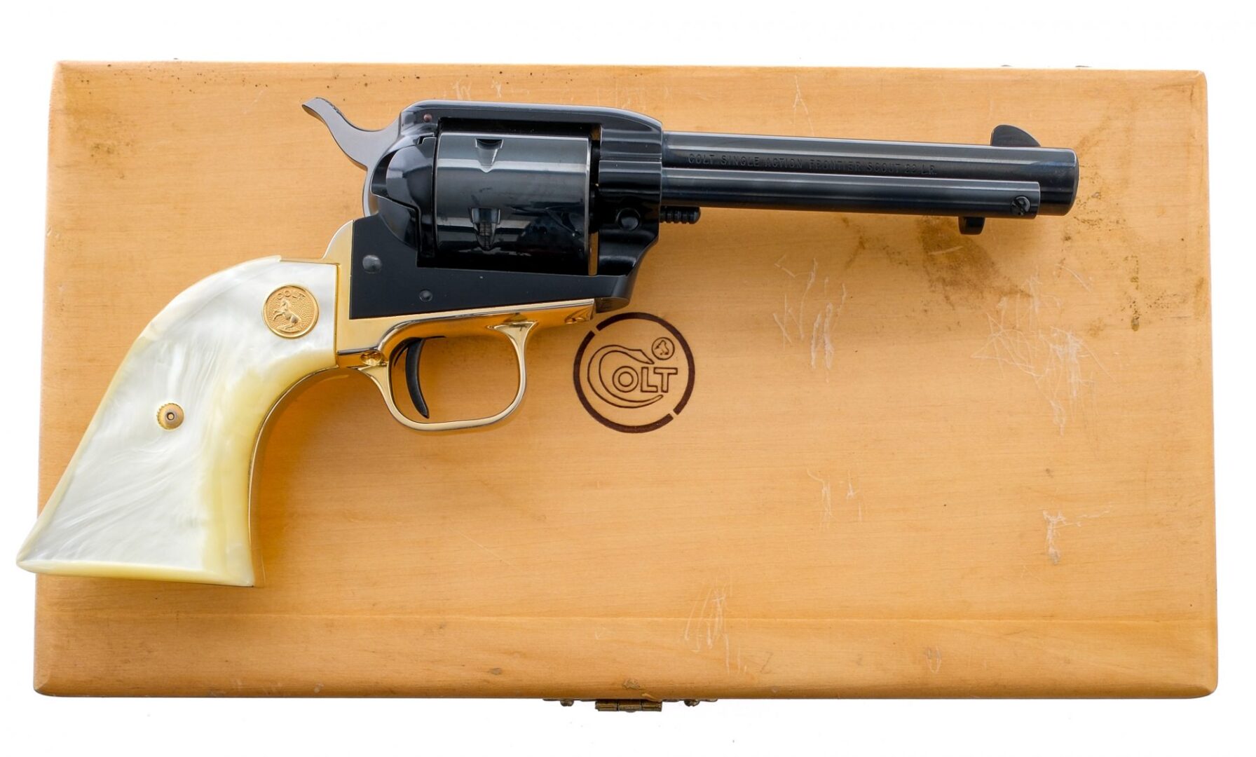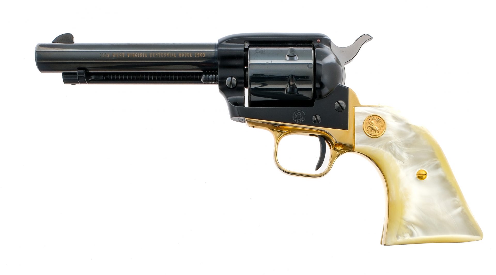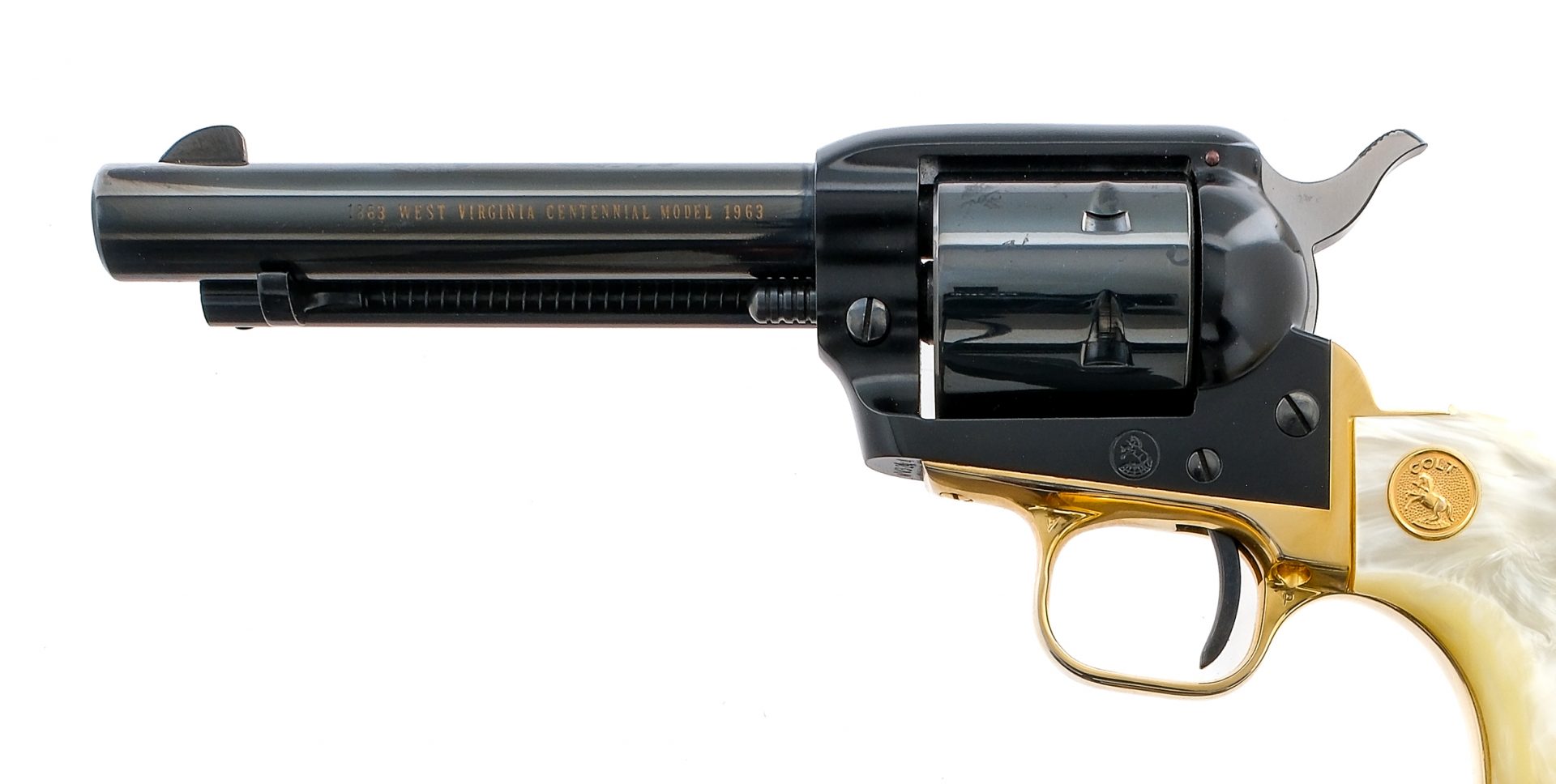 Description Colt Frontier Scout West Virginia Centennial .22 long rifle with a six-shot cylinder and a 4.75″ barrel. Blued barrel and unfluted cylinder with black finished frame. Gold plated trigger guard and grip frame. Faux pearl grips with gold plated Rampant Colt medallions. Single action trigger and hammer. Rear notch and fixed front blade. Left side of the barrel reads “1863 WEST VIRGINIA CENTENNIAL MODEL 1963”. Comes in a wood Colt case with yellow velvet lining. Must ship to FFL or C&R holder. Condition: Very Good/Excellent with light scratches and wear from normal handling and operation. Very light cylinder turn line. Some adhesive on both sides of the frame. Clean rifled bore. Barrel Length: 4.75″ Serial: WV3244 Manufacturer: COLT Caliber: .22 Long Rifle Model: Frontier Scout West Virginia Book# 02263