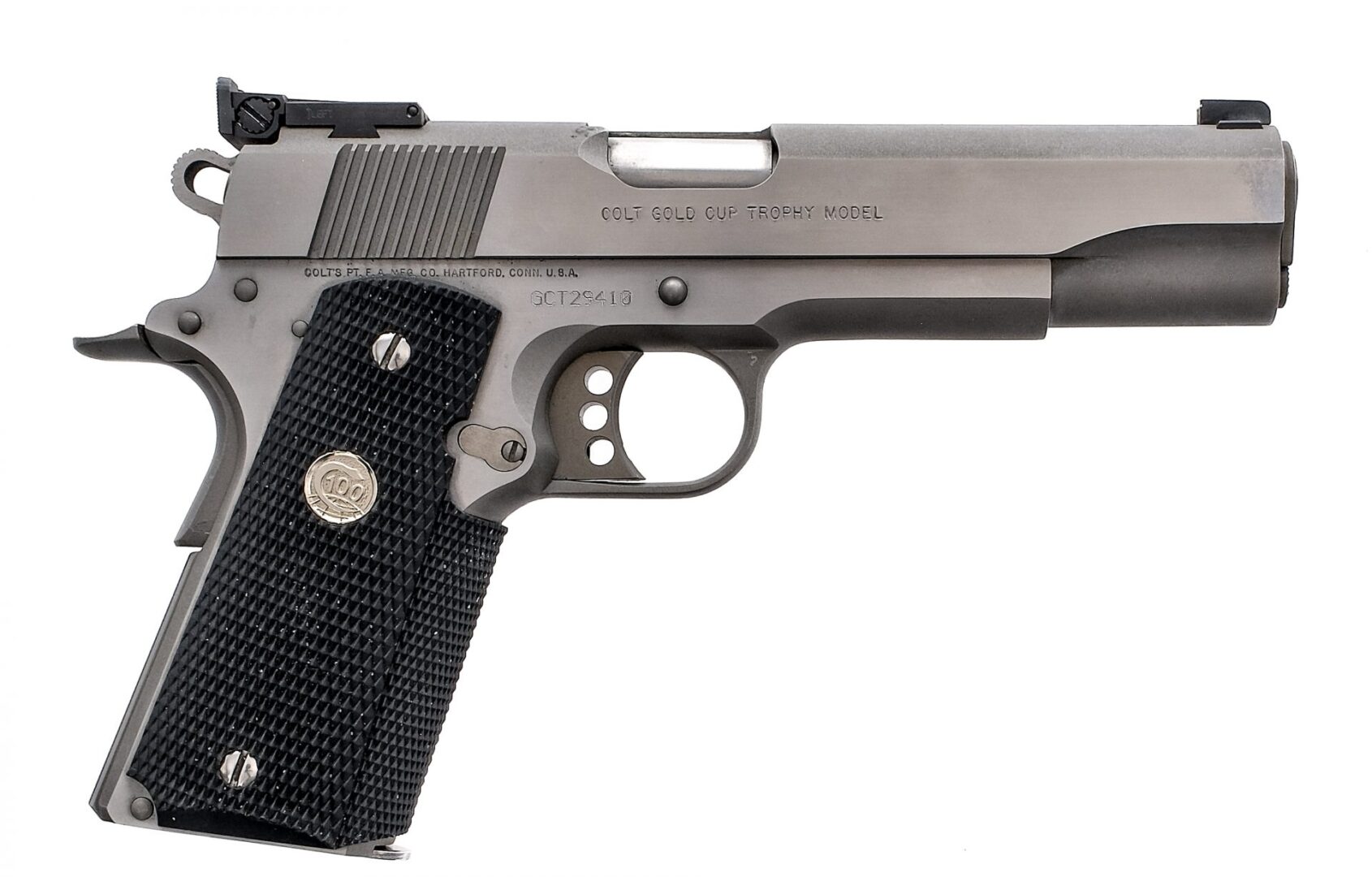 Description Colt Gold Cup Trophy chambered in .45 ACP with two, eight round removable Colt magazines and a 5″ NM barrel. Manufactured in 2011 with serial number GCT29410. Stainless steel frame with checkered rubber wrap around grips with silver Colt 100 medallions. Manual thumb safety and beavertail grip safety. Single action three hole trigger and skeletonized hammer. Stainless steel serrated slide with polished flats. Adjustable rear sight and fixed front blade. The front and rear sight have been painted white after marked. Comes in its factory box with matching serial number, manual, cable lock, barrel bushing tool, extra spring, and two magazines. Must ship to a FFL holder. Condition: Very Good with light scratches and wear from normal handling, operation, and firing. Clean rifled bore. Barrel Length: 5″ Serial: GCT29410 Manufacturer: COLT Year: 2011 Caliber: .45 ACP Model: Gold Cup Trophy Book# 02140