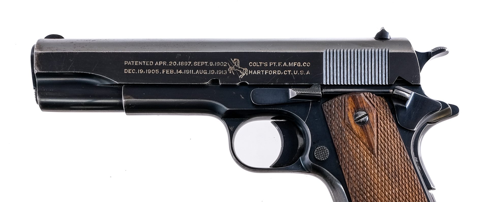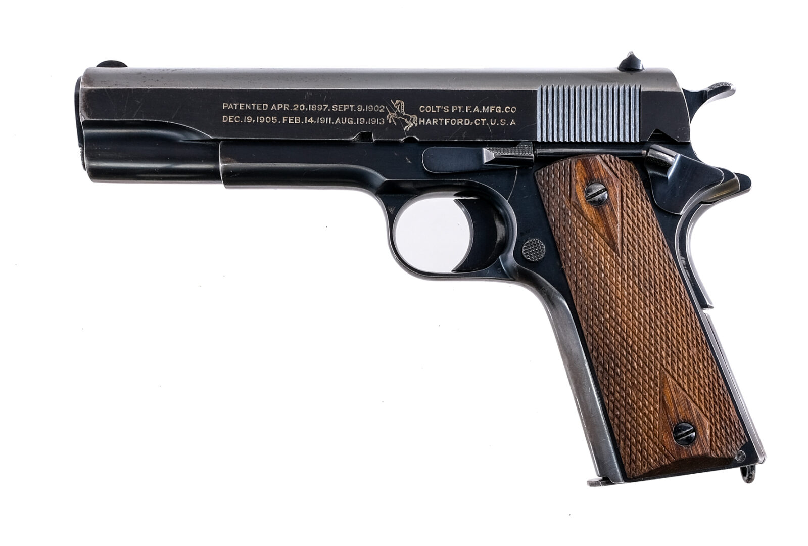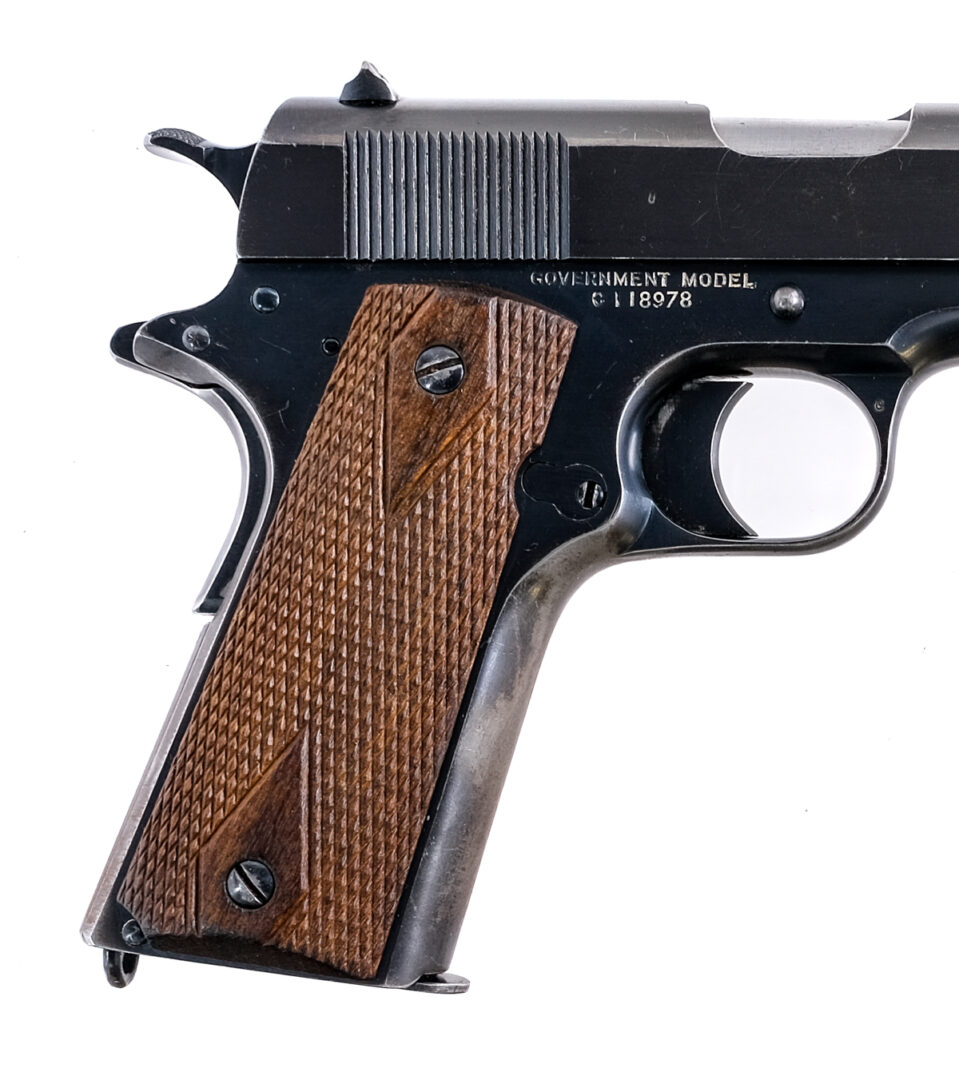 Description Pre World War II Colt Government model semi auto pistol chambered in .45 caliber with one seven round removable magazine and a 5″ barrel. Dating to 1919 this example features a polished chamber marked “P” forward of the lug, long smooth trigger, wide checkered hammer, heart shape grip frame, checkered slide catch, safety, and magazine catch, smooth flat mainspring housing with a lanyard loop, diamond pattern checkered grips and an unmarked two-tone magazine with a two pin base. The left side of the slide is roll marked with a two-line, two-block address/patent dates followed by the Rampant Colt logo and the “COLT AUTOMATIC / CALIBRE 45” on the right. The left side of the trigger guard is stamped “VP” and “5” and the right is stamped “C”. The right side of the frame is stamped GEVERNMENT MODEL” over the serial number “C118978”. Ships to FFLC&R Only. Condition: Overall Very Good with finish loss on the high points and more substantially on the front and rear grip areas. There are a few scattered marks from handling. The bore is clean with just a slight hint of frosting and strong rifling and the action functions as expected. Barrel Length: 5″ Serial: C118978 Manufacturer: Colt Year: 1919 Caliber: .45 ACP Model: Government
