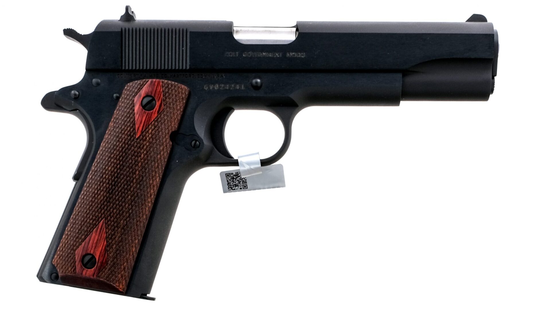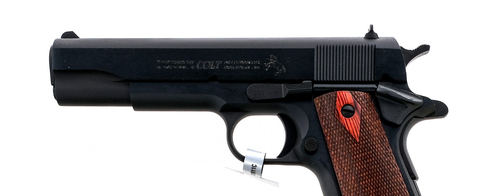 Description Colt Government Model O Series 70 chambered in .45 with two, eight round removable magazines and a 5″ national match barrel. Blued finished frame, slide, and controls with checkered rosewood grips. Manual thumb safety and backstrap safety. Serrated solid trigger, magazine release, slide release, and hammer. Fixed iron sights. Comes in its factory box with factory paperwork, cable lock, and two magazines. Must ship to FFL holder. Condition: New in box with tags. Barrel Length: 5″ Serial: GV024241 Manufacturer: COLT Caliber: .45 ACP Model: Government Model MKIV Series 70 Model O
