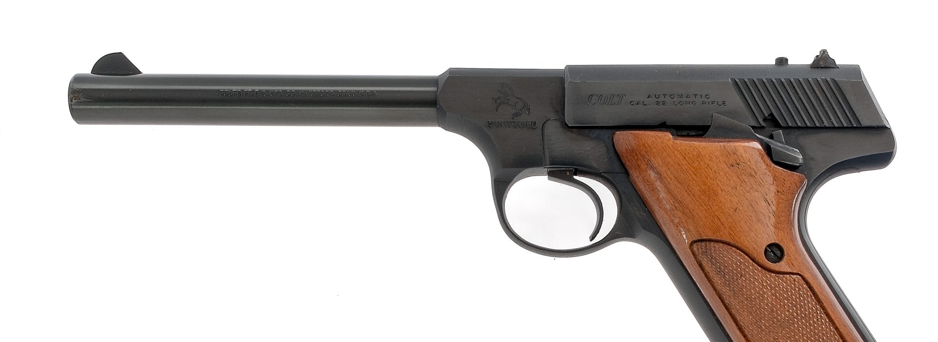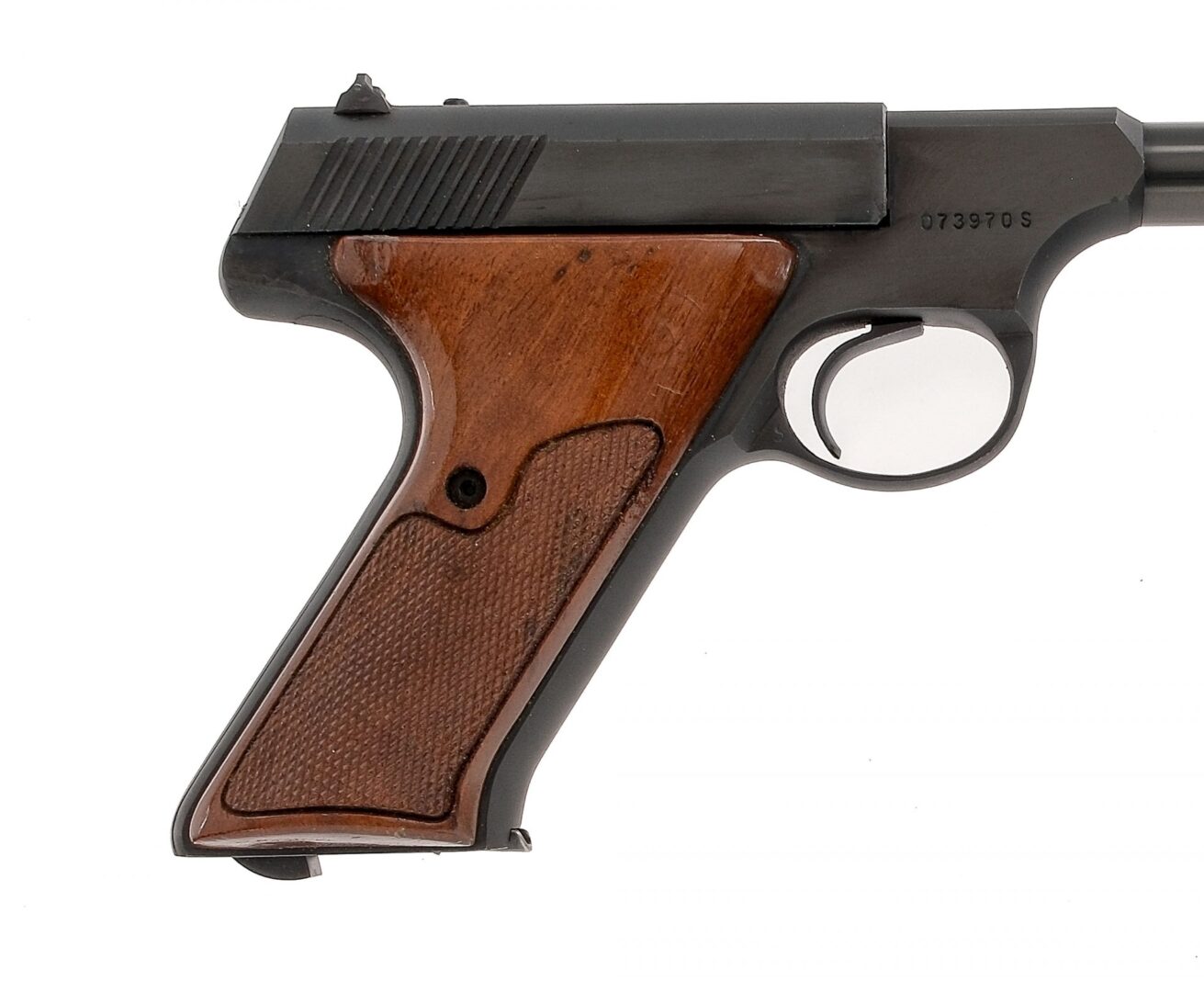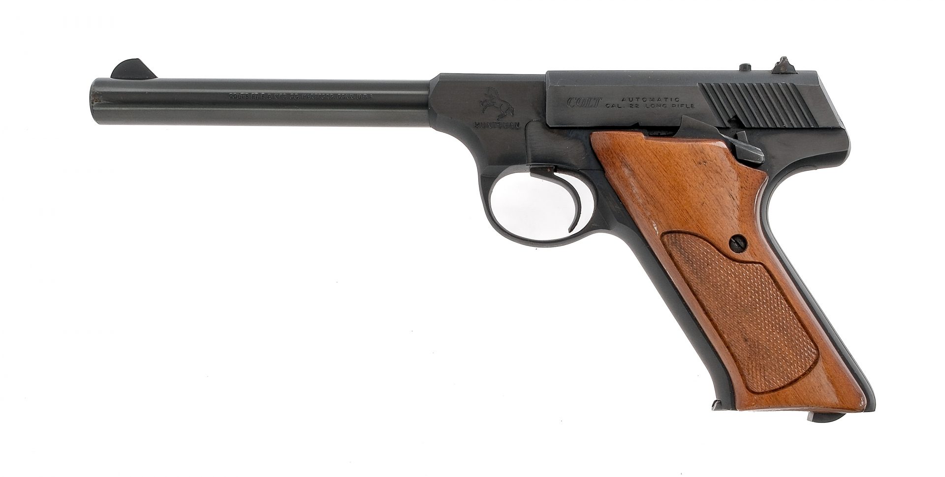 Description Colt Huntsman chambered in .22 long rifle with two, ten round removable magazines and a 6″ barrel. Manufactured in 1975 with serial number 073970S. Blued steel frame with heel magazine release and checkered wood grips. Manual frame mounted thumb safety. Blued barrel and serrated slide. Fixed iron sights. Comes in its factory box with matching serial number, factory paperwork, and two magazines. Must ship to a FFL holder. Condition: Very Good with light scratches and handling wear. Some small touches of metal oxidation. Light scratches and dings on the grips. Bright and clean bore with strong rifling. Barrel Length: 6″ Serial: 073970S Manufacturer: COLT Year: 1975 Caliber: .22 Long Rifle Model: Huntsman Book# 03330