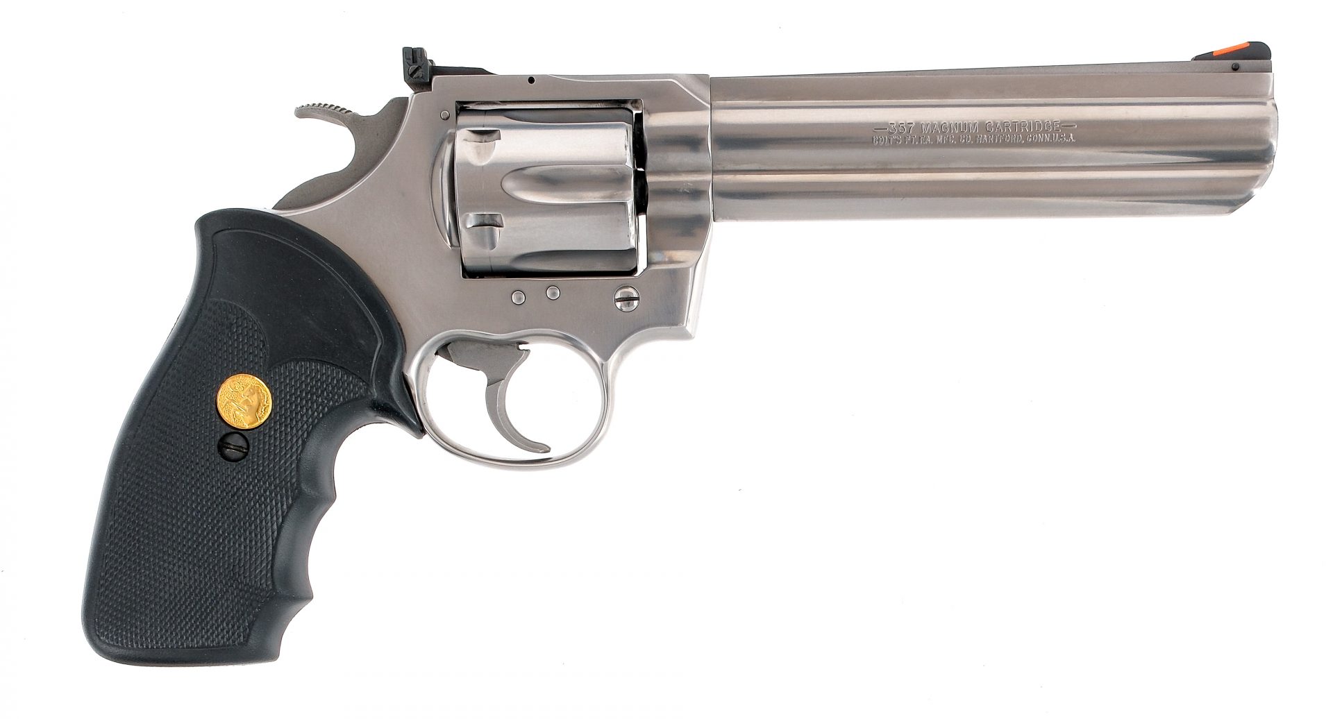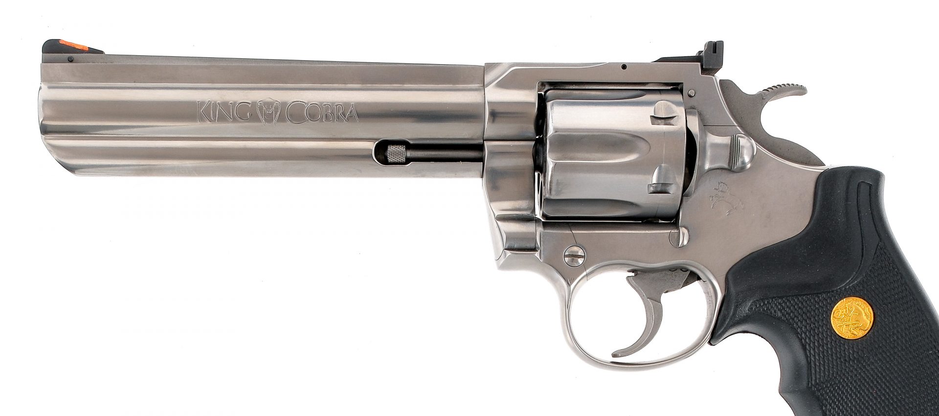 Description Colt King Cobra chambered in .357 Magnum with a six-shot cylinder and a 6″ barrel. Stainless steel barrel, frame, fluted cylinder, and cylinder release. Double action trigger and hammer. Checkered rubber grips with gold Rampant Colt Medallions. Adjustable rear U-notch sight and red ramp front blade sight. Comes with extra rubber checkered grips with silver Rampant Col Medallions. Must ship to a FFL holder. Condition: Very good with light scratches and normal handling wear. Burn marks on the cylinder from firing. Wear on the moving parts/internals from normal operation. Cylinder turn line. Bright and clean bore with strong rifling. Barrel Length: 6″ Serial: KU5012 Manufacturer: COLT Caliber: .357 Magnum Model: King Cobra Book# 04613