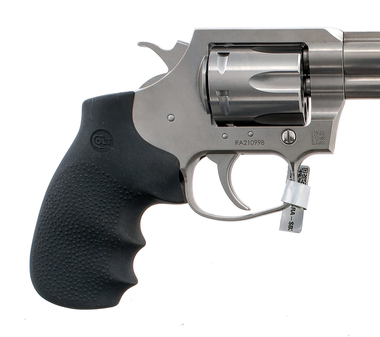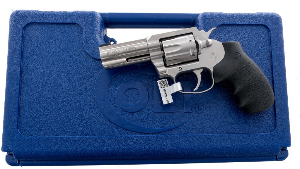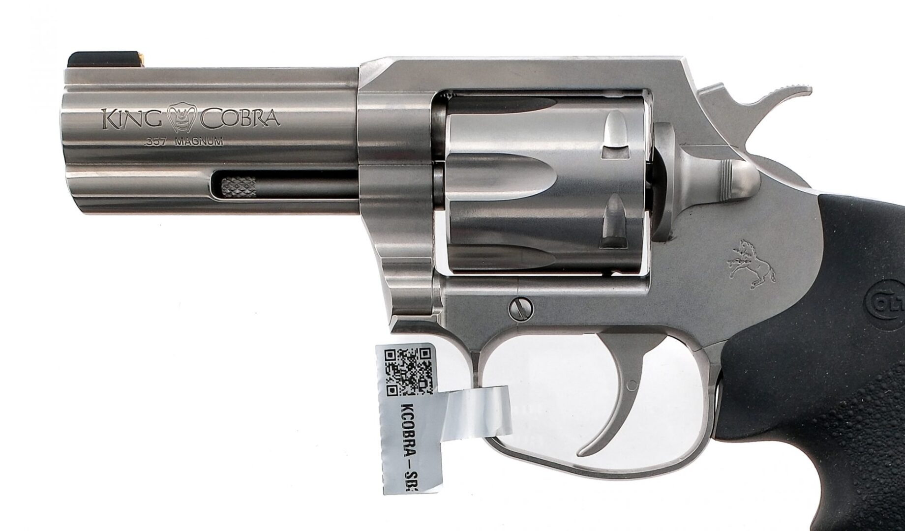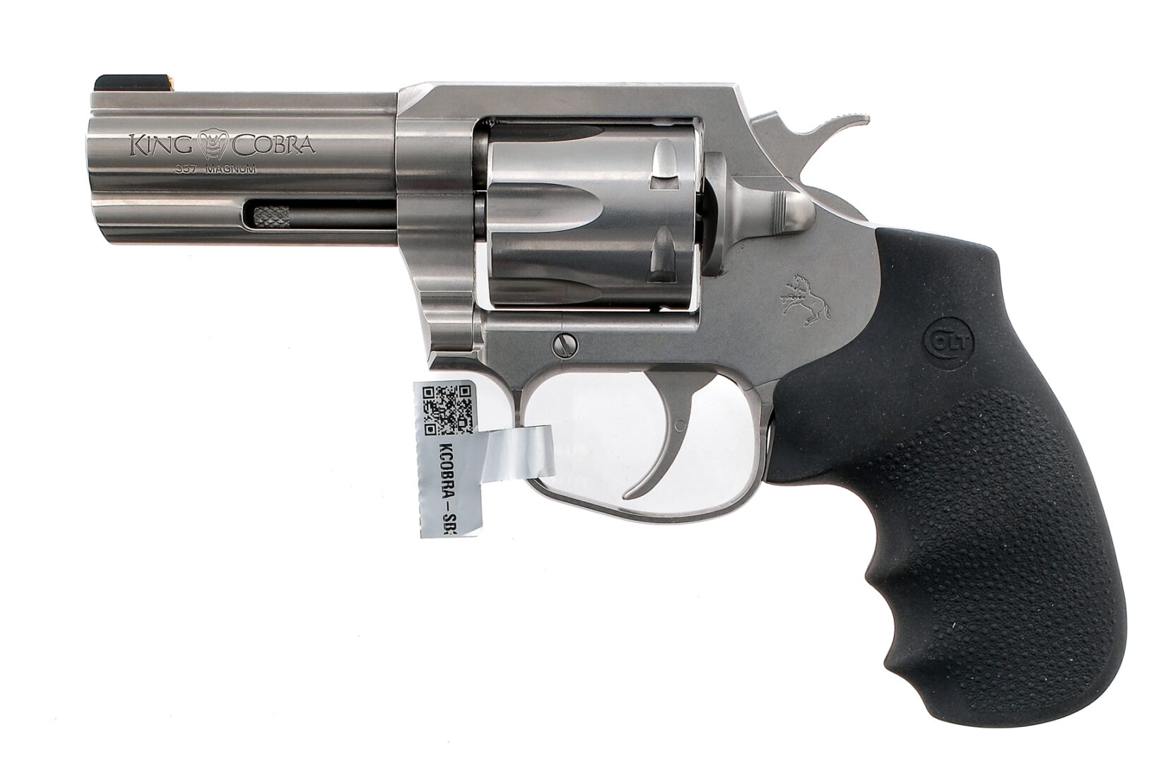 Description Colt King Cobra chambered in .357 magnum with a six-shot cylinder and a 3″ barrel. Stainless steel barrel, frame, fluted cylinder, cylinder release, double action hammer, and trigger. Colt pebble textured rubber Hogue grips. Rear notch and fixed front blade with white dot insert. Comes in its factory box with cable lock and keys. Must ship to FFL holder. Condition: Like new with very little handling wear and a very light cylinder turn line. Clean rifled bore. Barrel Length: 3″ Serial: RA210998 Manufacturer: COLT Caliber: .357 Magnum Model: King Cobra Book# 02035
