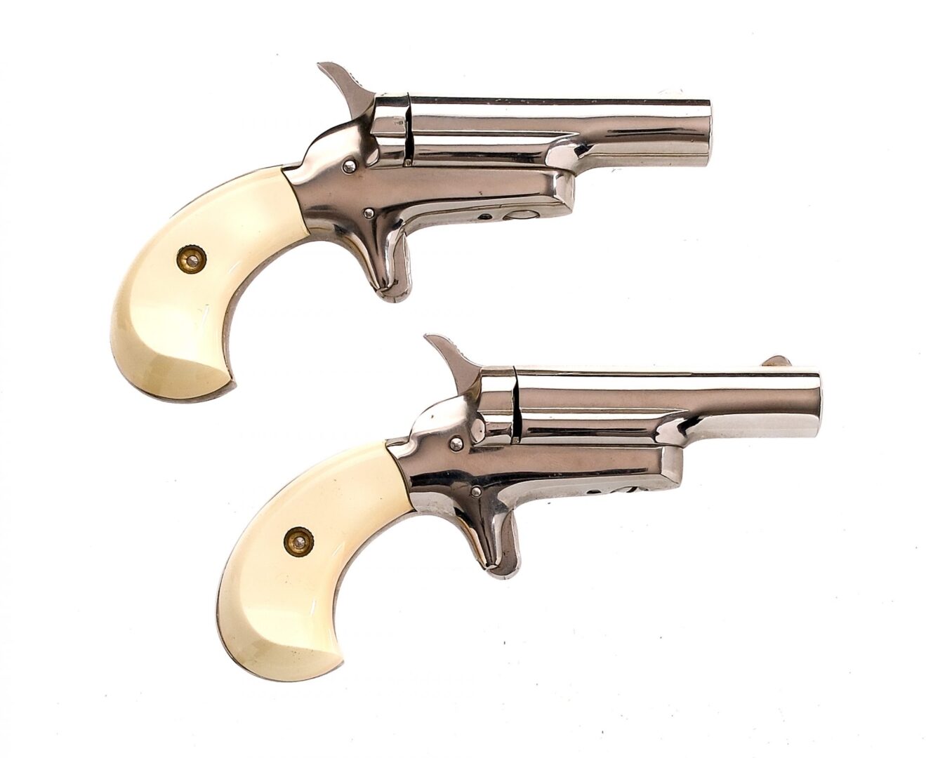 Description Colt Limited Edition Derringer Book Set, both chambered in .22 short with single shot capacity and 2.5″ barrels. Sequential pair of Derringers with serial numbers 5214N and 5215N. Both pistols feature a nickel finished barrel, frame, single action trigger, and hammer. Smooth white polymer grip plates. Fixed iron sights with rear notch and fixed low profile front blade. The sides of the barrels are marked “22 CAL.SHORT COLT’S P.F.A. MFG. CO. INC. HTFD.,CT.,U.S.A.”. Comes in its factory Colt book case, the front is marked “A LIMITED EDITON BY COLT” and the spine is marked “COLT DERRINGERS” “LIMITED EDITION” “1836-1960”. Must ship to a FFL or C&R holder. Condition: Good/Very good with scratches and wear from normal handling/operation. The nickel finish could use a polish with some tarnish on the finish, mostly on the side that was facing up in the case. Some small specks of metal oxidation. Some scratches and wear on the grips. Bright and clean rifled bores. Barrel Length: 2.5″ Serial: 5214N 5215N Manufacturer: COLT Caliber: .22 Short Model: Limited Edition Derringer Bookcase Book# 03808