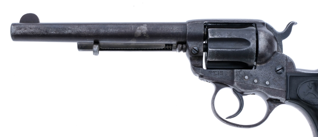 Description Colt M1877 Lightning chambered in .38 Long Colt with a six-shot cylinder and a 6″ barrel. Blued barrel, frame, fluted cylinder, double action trigger, and hammer. Checkered polymer Colt grips. Rear notch and rounded front blade sights. Serial number matching frame, trigger guard, and grip frame. COLT. D.A. 38″. The top of the barrel is marked “COLT’S PT.F.A. MFG.Co” ,”HARTFORD. CT. U.S.A.”. Must ship to a FFL or C&R holder. Condition: Fair/Good with most of the finish being heavily patinated with finish thinning and loss. Spots of metal oxidation throughout. Scratches and handling wear. Light scratches and wear on the grips with worn checkering. The bore is decently bright with spots of metal oxidation. Strong visible rifling. The action appears to function as expected. Barrel Length: 6″ Serial: 139974 Manufacturer: COLT Caliber: .38 Long Colt Model: M1877 Lightning Book# 05702