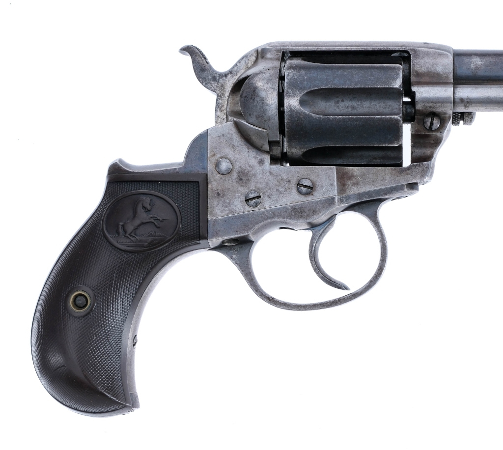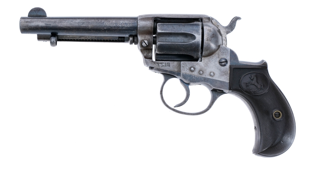 Description Colt M1877 Lightning chambered in .38 Long Colt with a six-shot cylinder and a 4.5″ barrel. Manufactured in 1903 with serial number 142410. Blued barrel, cylinder, trigger guard, and double action trigger. Mostly in the white frame and hammer. Checkered polymer Colt grips. Rear notch and rounded front blade sights. Serial number matching frame, trigger guard, and grip frame. COLT. D.A. 38″. The top of the barrel is marked “COLT’S PT.F.A. MFG.Co” ,”HARTFORD. CT. U.S.A.”. Must ship to a FFL or C&R holder. Condition: Fair mainly due to issue likely with the trigger spring not working in single action and only working in double action. Some of the parts are mostly in the white. Spots of finish thinning, patina, and metal oxidation throughout. Light wear on the grips and some worn checkering. Bright bore with a few light spots of metal oxidation. Strong visible rifling. Barrel Length: 4.8″ Serial: 142410 Manufacturer: COLT Year: 1903 Caliber: .38 Long Colt Model: M1877 Lightning Book# 05714