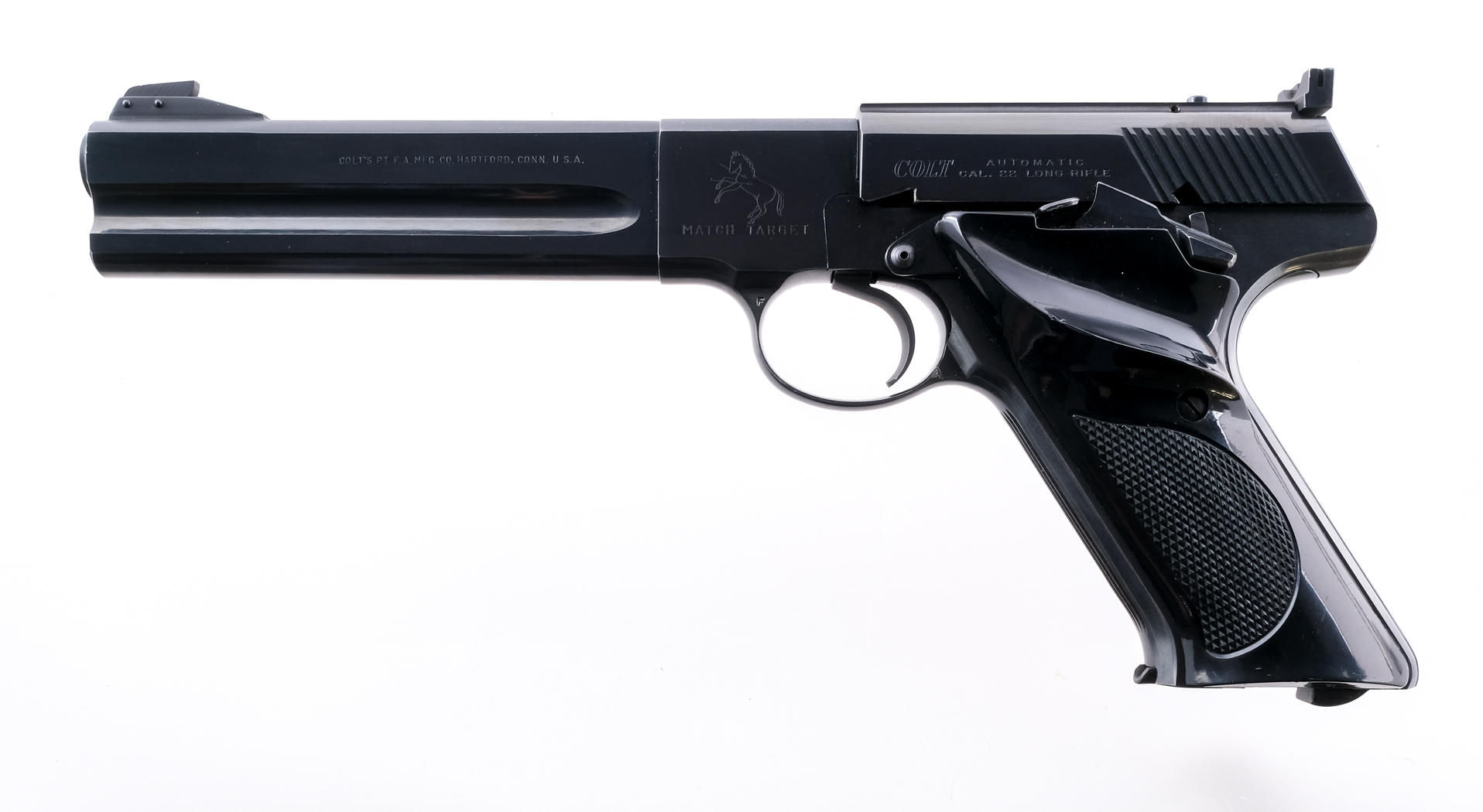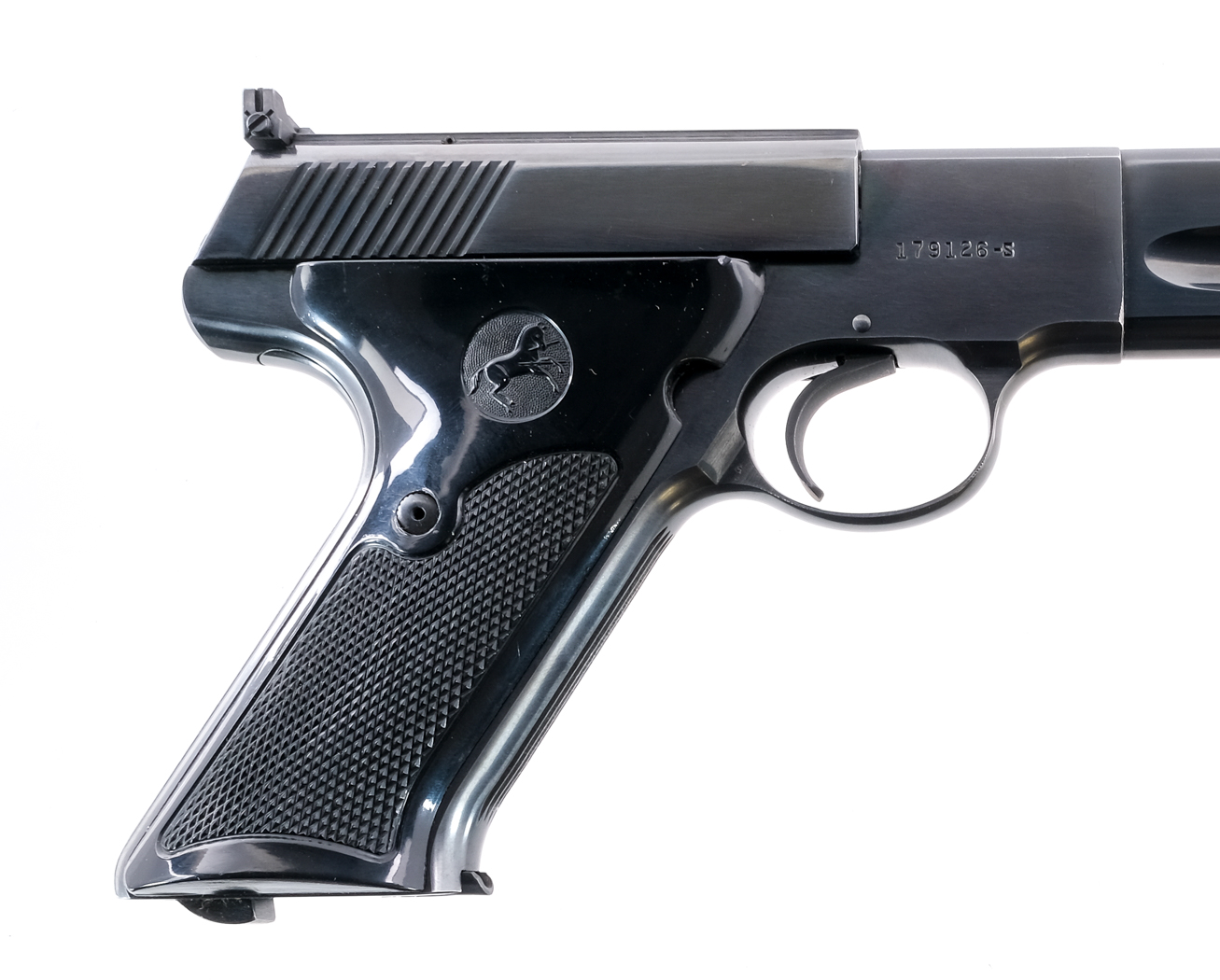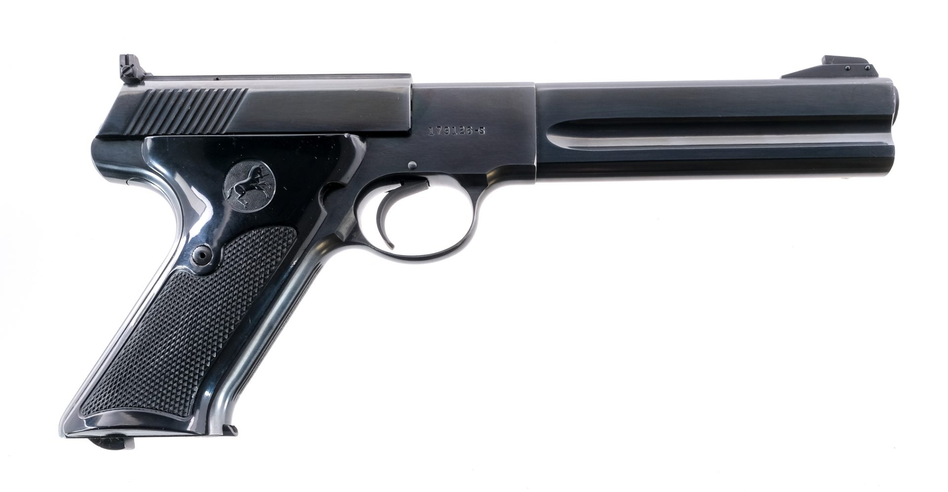 Description Colt Match Target in .22 Long Rifle with one, ten round removable magazine and a 6″ barrel. Checkered contoured composite grip plates. Blued frame, untextured trigger, serrated slide and barrel. Left side of frame slide release and slide stop safety. Magwell located magazine release. Rear adjustable and front fixed blade sight. Must ship to a C&R or FFL holder. Condition: Very Good/Excellent with light scuffs and handling wear. Clean rifled bore. Barrel Length: 6″ Serial: 179126-S Manufacturer: Colt Year: 1957 Caliber: .22 LR Model: Match Target Book# 9-476