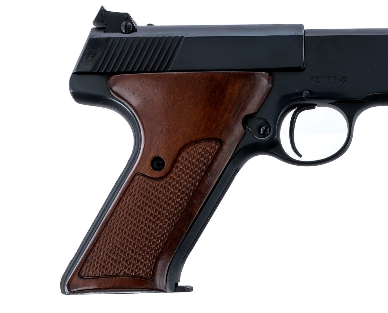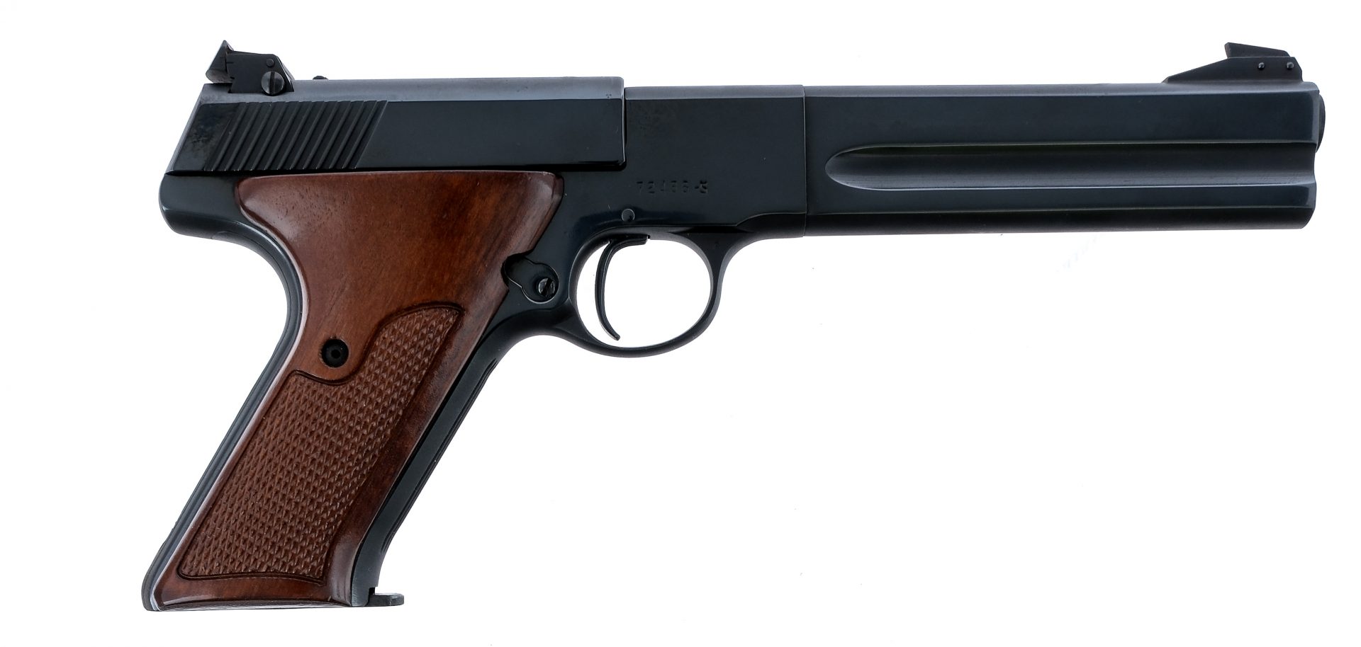 Description Colt Match Target chambered in .22 long rifle with two, ten round removable magazines and a 6″ barrel. Manufactured in 1950 with serial number 72486-S. Glossy blued barrel, frame, and serrated slide. Checkered wood grips. Frame mounted manual thumb safety. Adjustable rear sight and fixed front blade. Comes in a non matching Colt box for a 1911. Must ship to a FFL or C&R holder. Condition: Good having been reblued with visible buffing marks and pitting under the finish. The lettering and stampings are duller. Light scratches and handling wear. Clean rifled bore. Barrel Length: 6″ Serial: 72486-S Manufacturer: COLT Year: 1950 Caliber: .22 Long Rifle Model: Match Target Book# 05410