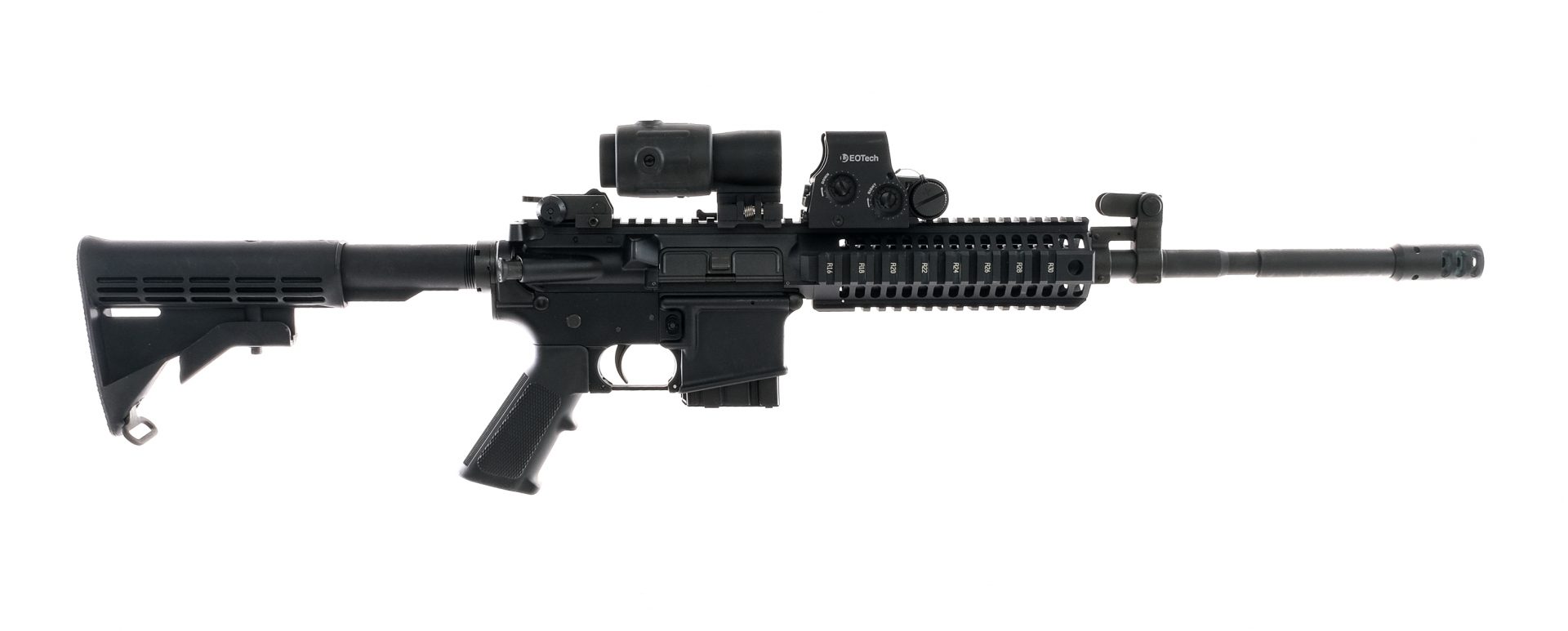 Description Colt Match Target M4 Carbine chambered in .223 Remington with one, ten round removable magazine and a 18″ 5.56 NATO Colt barrel including the pinned and welded muzzle break. Front gas block with flip up adjustable front sight post. Aluminum picatinny quad rail handguard. Flat top upper receiver with EOTECH XPS holographic sight and EOTECH magnifier. Adjustable rear flip up peep sight. Standard AR15 upper receiver parts. Colt Match Target M4 Carbine lower receiver with standard AR15 controls and a A2 style pistol grip. Pinned polymer carbine stock. Must ship to FFL holder. Check local laws regarding “Assault Weapons” BEFORE bidding. Condition: Very Good with light scratches and wear from normal handling and operation. Clean rifled bore. Barrel Length: 18″ Serial: 407818 Manufacturer: COLT Caliber: 5.56x45mm NATO Model: Match Target M4 Carbine Book# 02045