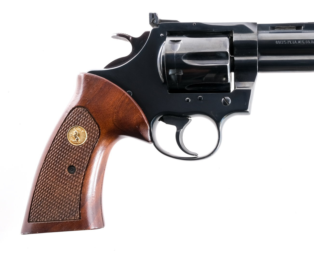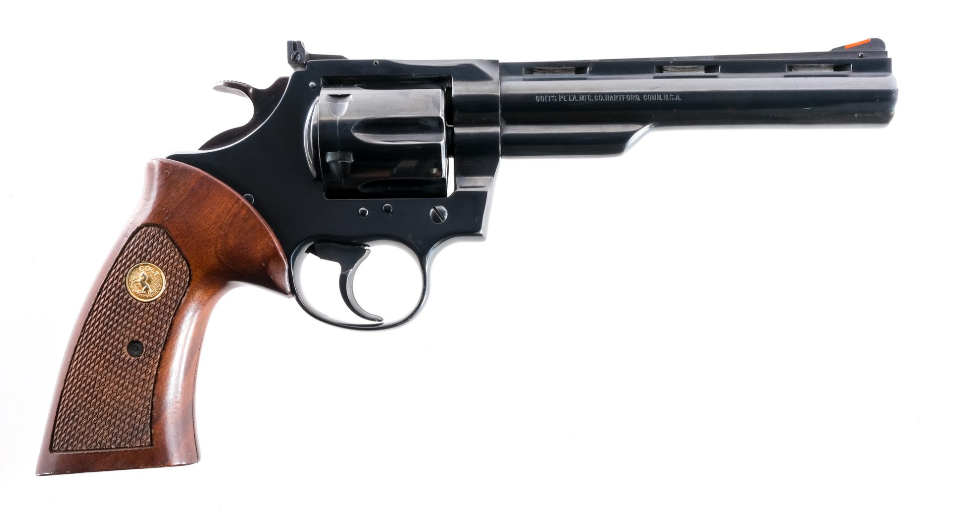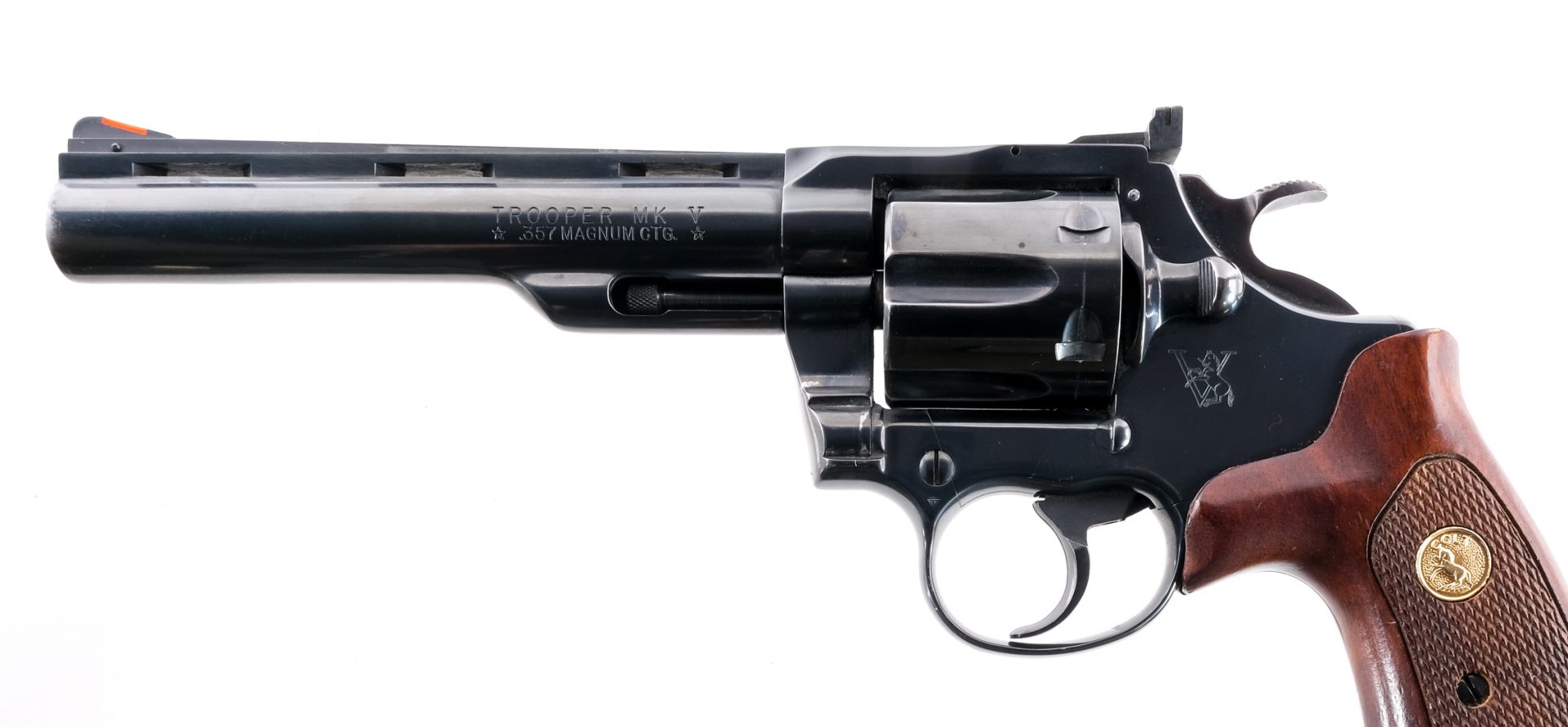 Description Colt MK V Trooper in .357 Magnum with a six round capacity and a 6″ top rib vented barrel. Checkered wood grip plates. Blued frame, serrated trigger, serrated hammer, cylinder and barrel. Left side of frame cylinder release. Rear adjustable and front fixed blade sight. Must ship to a FFL holder. Condition: Very Good with light muzzle/holster wear. Clean rifled bore. Barrel Length: 6″ Serial: 07684V Manufacturer: Colt Caliber: .357 Mag Model: MK V Trooper Book# 9-007
