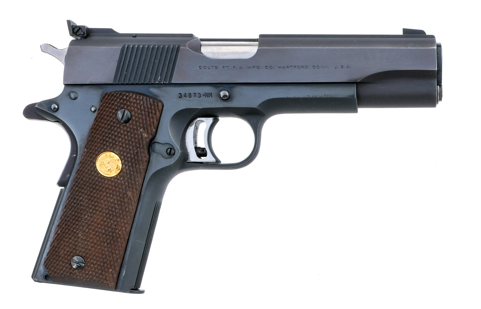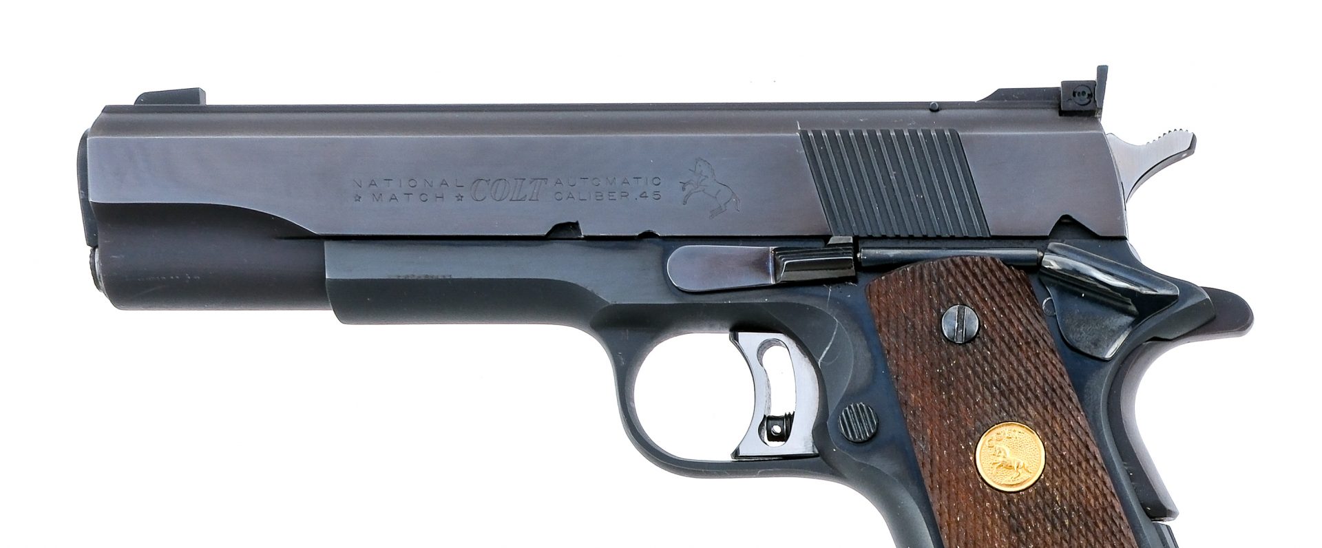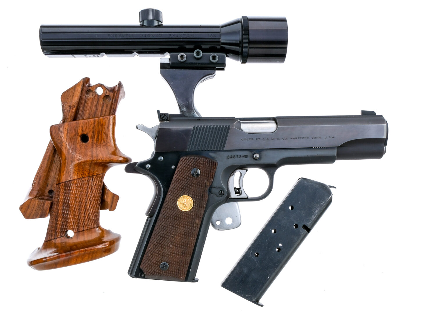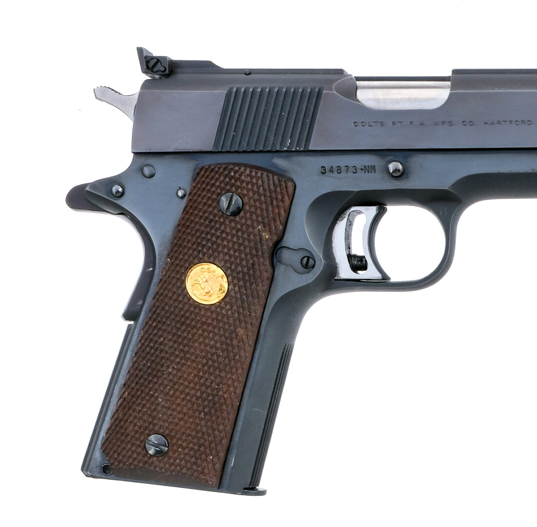 Description Colt National Match chambered in .45 ACP with two, seven round removable magazines and a 5″ NM barrel. Manufactured in 1969 with serial number 34873-NM. Blued steel frame with checkered wood grips with gold Rampant Colt medallions. Single action skeletonized adjustable trigger. Frame mounted manual thumb safety and grip depression safety. Blued serrated slide with adjustable rear sight and fixed front blade. Comes with Herretts checkered wood rips and a dove tail optics mount. The mount has a Bushnell Magnum Phantom 1.3x pistol scope. The previous owner made three small drilled and tapped holes both in the mount and on the frame, likely to hold a better zero. The drilled and tapped holes are hidden under the grips. Must ship to a FFL or C&R holder. Condition: Very Good with light scratches, sharp edge wear, and general cosmetic wear from handling/disassembly. Some wear on the internal/moving parts from operation and firing. Some light scratches and wear on the grips. Drilled and tapped holes on the frame. Bright and clean bore with strong rifling. Barrel Length: 5″ Serial: 34873-NM Manufacturer: COLT Year: 1969 Caliber: .45 ACP Model: National Match Book# 06177