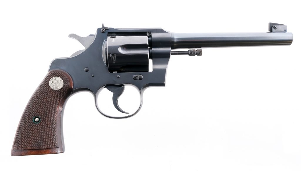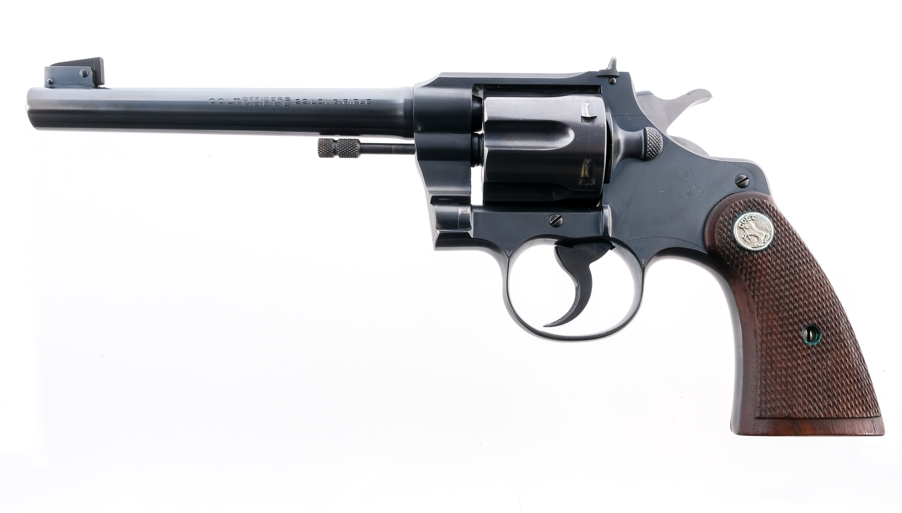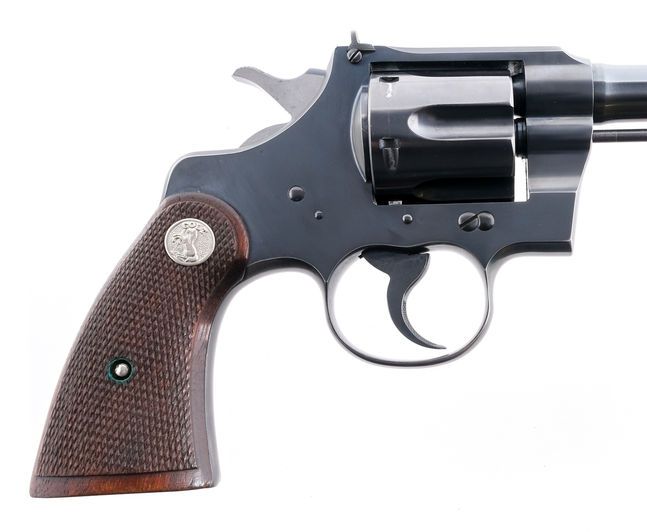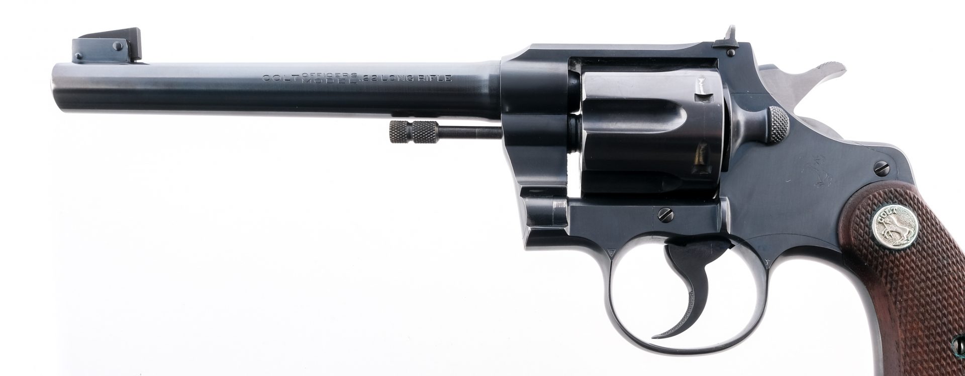 Description Colt Officers Model in .22 Long Rifle with a six round capacity and a 6″ barrel. Checkered Colt wood grip plates. Blued frame, serrated trigger, checkered hammer, cylinder and barrel. Left side of frame cylinder release. Front and rear fixed sights. Must ship to a C&R or FFL holder. Condition: Very Good/Excellent with light scuffs and handling wear. A very light turn line on the cylinder. Clean rifled bore. Barrel Length: 6″ Serial: 23640 Manufacturer: Colt Year: 1941 Caliber: 22 LR Model: Officers Model Book# 9-482