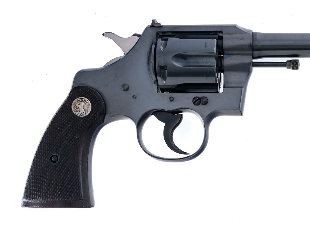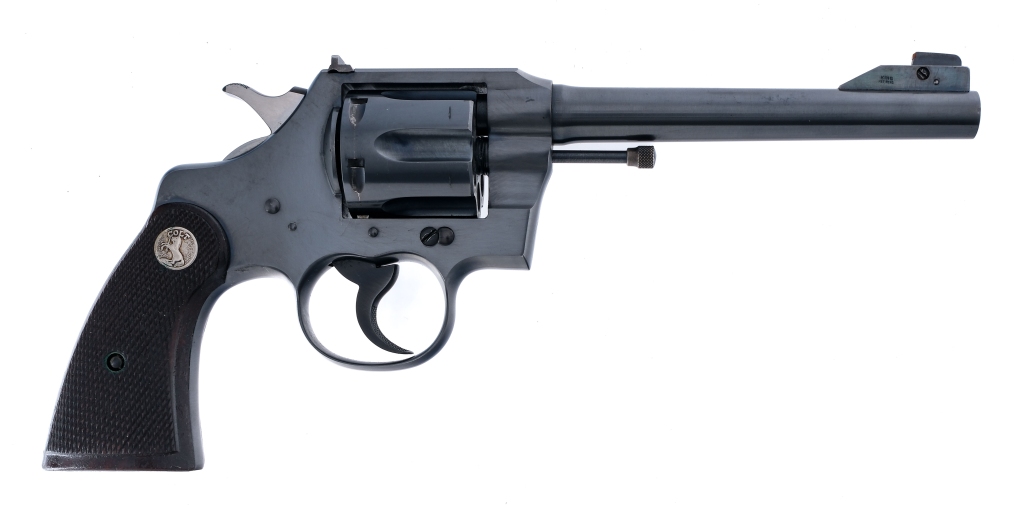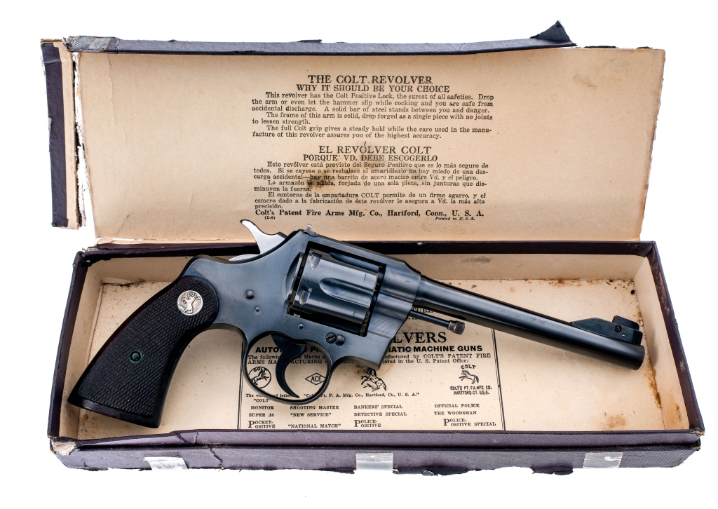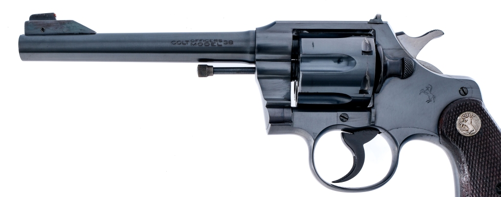 Description Colt Officers Model 38 in .38 Special with a six round capacity and a 6″ barrel. Made in Hartford Connecticut in 1931. Checkered wood grip plates. Blued frame, knurled trigger, hammer, cylinder and barrel. Left side of frame cylinder release. Front and rear King fixed sights. Comes in a factory box with written serial number on the underside in pen. Must ship to a C&R or FFL holder. Condition: Good with light scuffs, handling wear and spots of rust on the cylinder. Clean rifled bore. Barrel Length: 6″ Serial: 570333 Manufacturer: Colt Year: 1931 Caliber: .38 Spl Model: Officers Model 38 Book# 05725