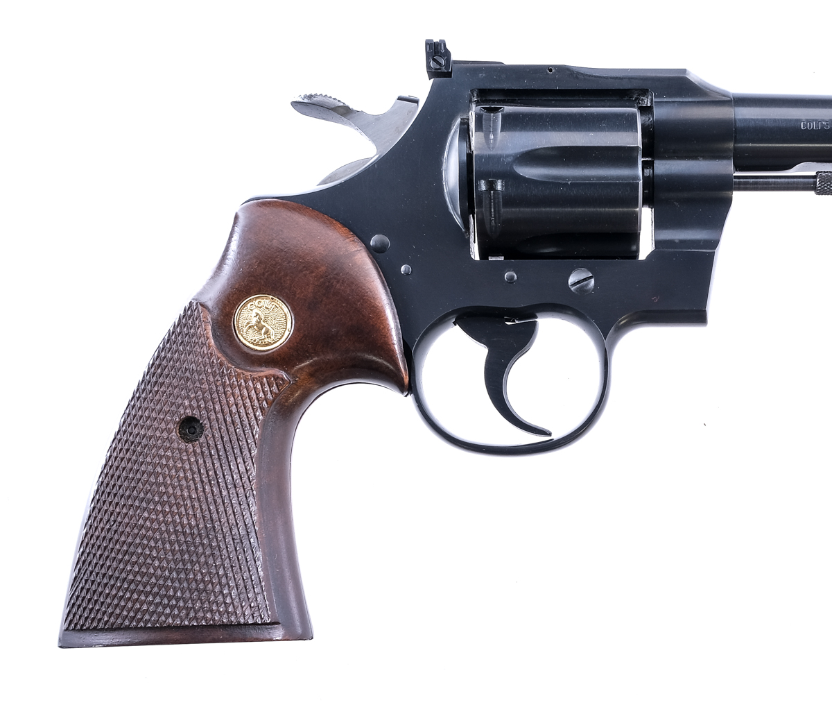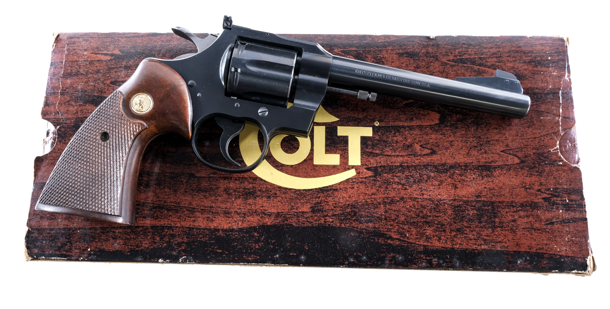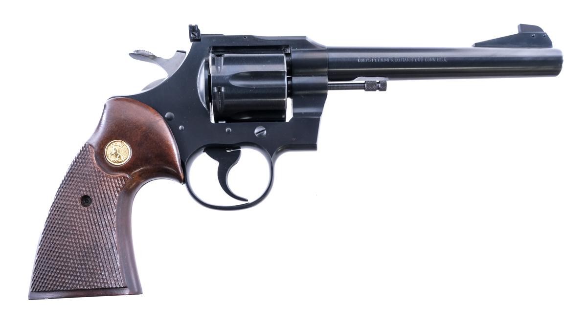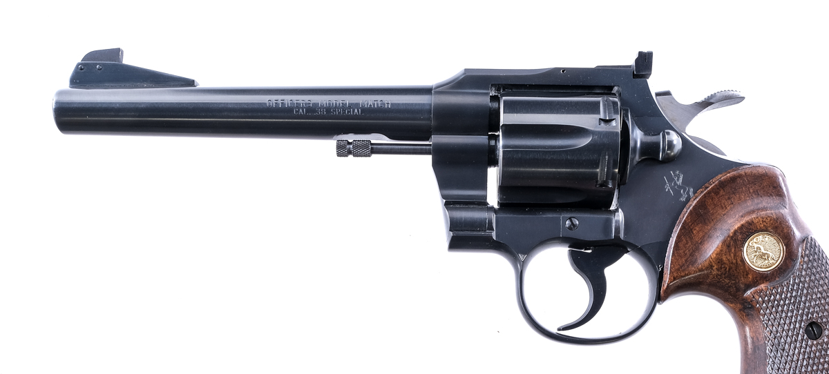 Description Colt Officers Model Match in .38 Special with a six round capacity and a 6″ barrel. Checkered wood grip plates. Blued trigger guard, serrated trigger, checkered hammer, frame, cylinder and barrel. Left side of frame cylinder release. Rear adjustable and front fixed blade sight. Comes in a Colt box with no serial number. Must ship to a C&R or FFL holder. Condition: Like New with light handling wear. Clean rifled bore. Barrel Length: 6″ Serial: 928960 Manufacturer: Colt Caliber: .38 Spl Model: Officers Model Match Year-Range 1964-1967 Book# 190