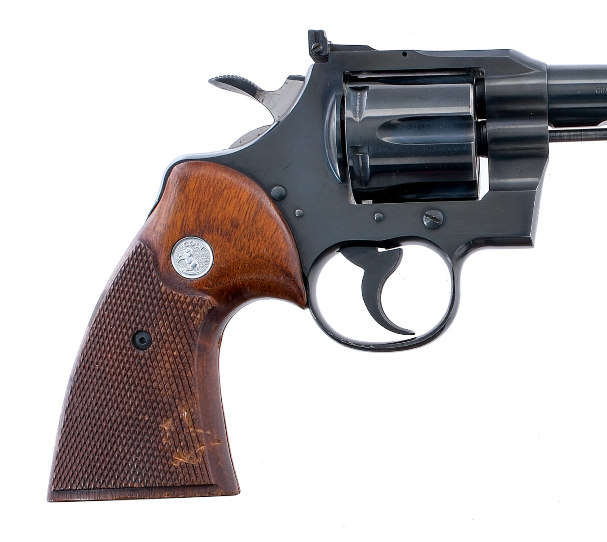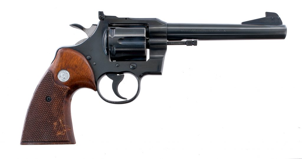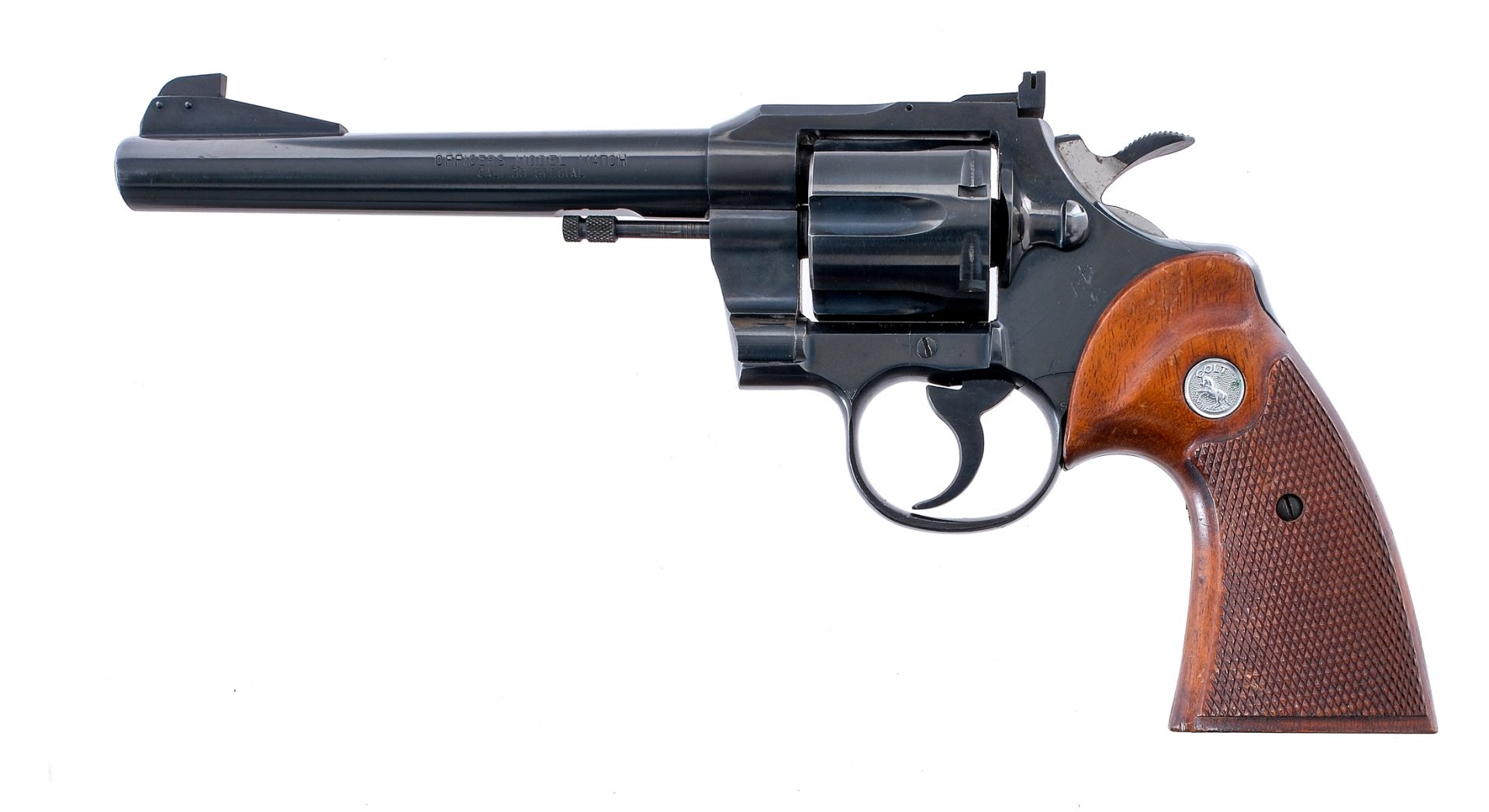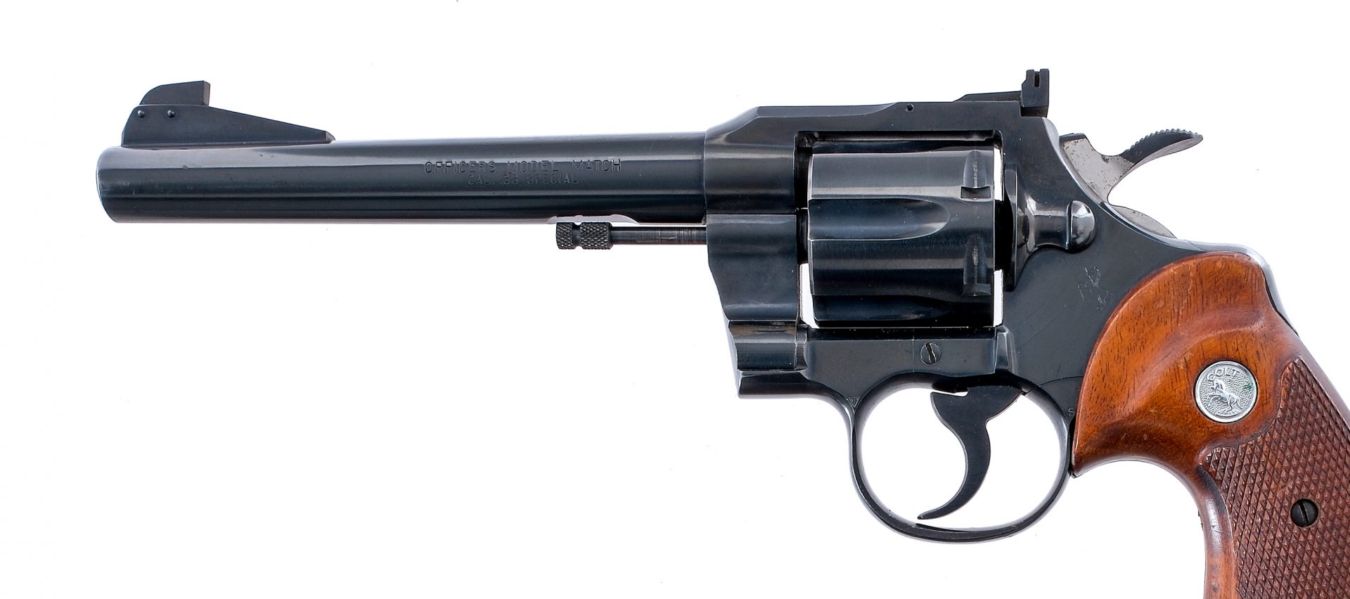 Description Colt Officers Model Match chambered in .38 special with a six-shot cylinder and a 6″ barrel. Blued barrel, frame, fluted cylinder, and controls. Double action trigger and hammer. Diamond checkered target grips with Rampant Colt medallions. Adjustable rear sight and fixed front blade. Must ship to FFL or C&R holder. Condition: Good/Very Good with some scratches, muzzle wear, and general wear from handling and operation. The grips retain most the sharp checkering with some worn spots and shows general, scratches, dings, and edge wear on the wood. Clean rifled bore. Barrel Length: 6″ Serial: 934747 Manufacturer: COLT Caliber: .38 Special Model: Officers Model Match Book# 02347