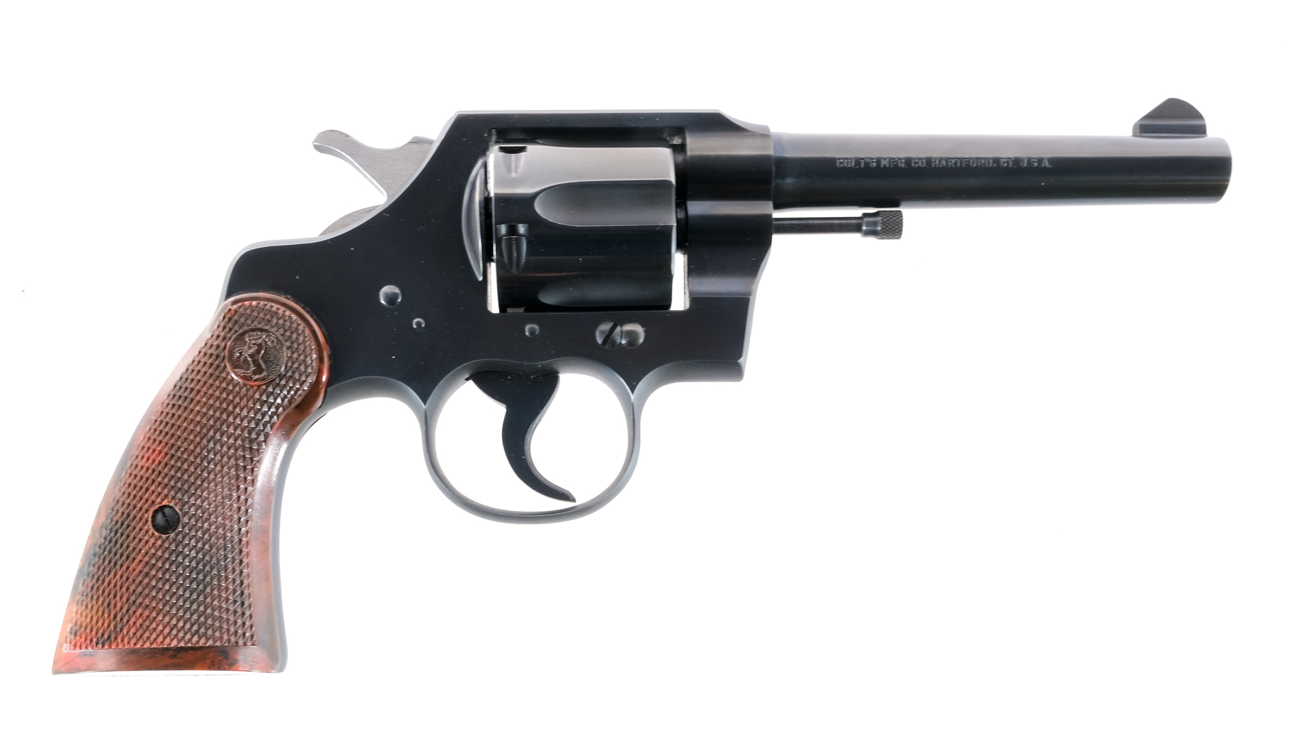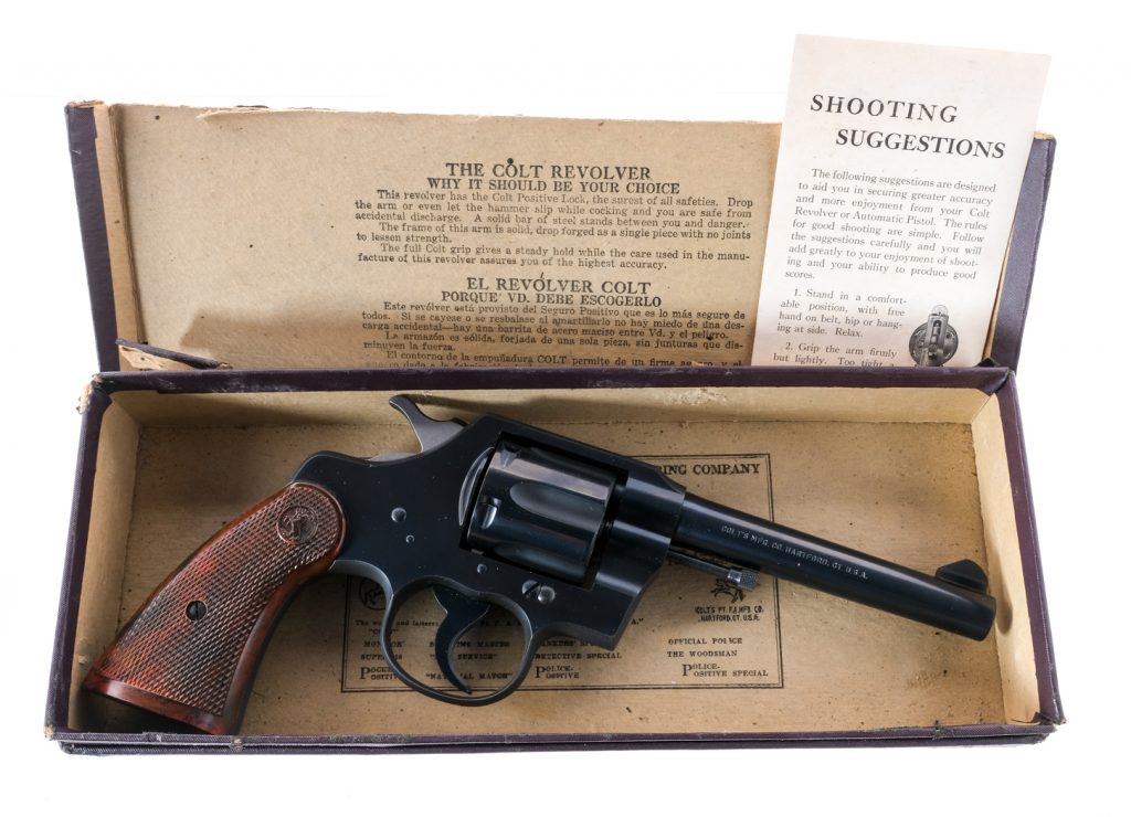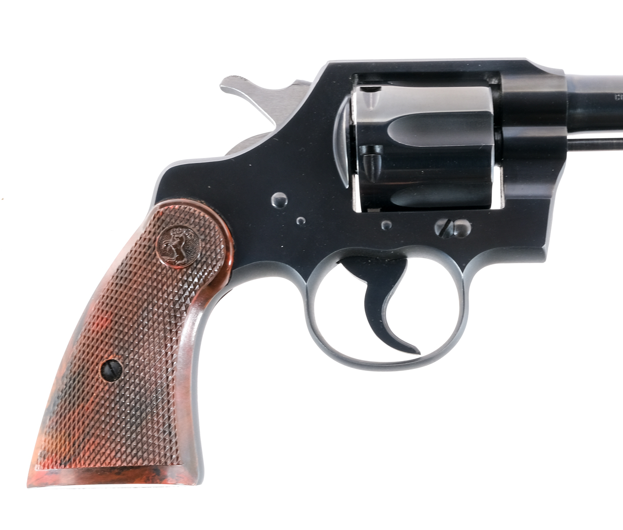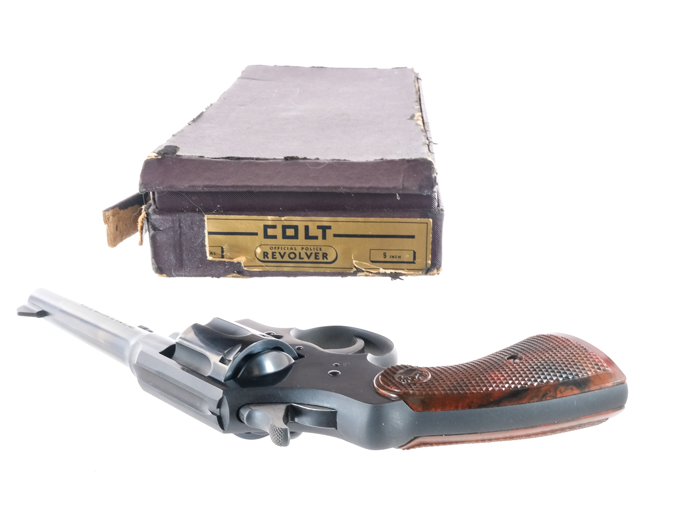 Description Colt Official Police in .38 Special with a six round capacity and a 5″ barrel. Checkered composite grip plates. Blued frame, serrated trigger, cylinder, checkered hammer and barrel. Left side of frame cylinder release. Front and rear fixed sights. Comes with a factory box with matching serial number in pencil on bottom of box. Must ship to a C&R or FFL holder. Condition: Like New with light handling wear. Clean rifle bore. Barrel Length: 5″ Serial: 760919 Manufacturer: Colt Year: 1949 Caliber: .38 Spl Model: Official Police Book# 9-686