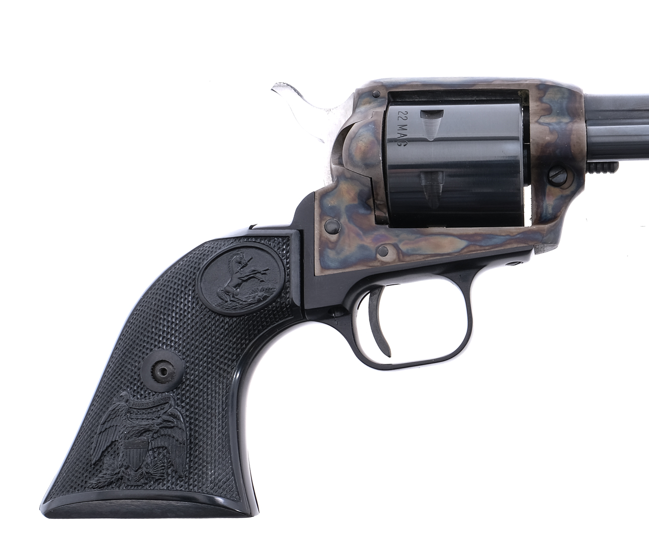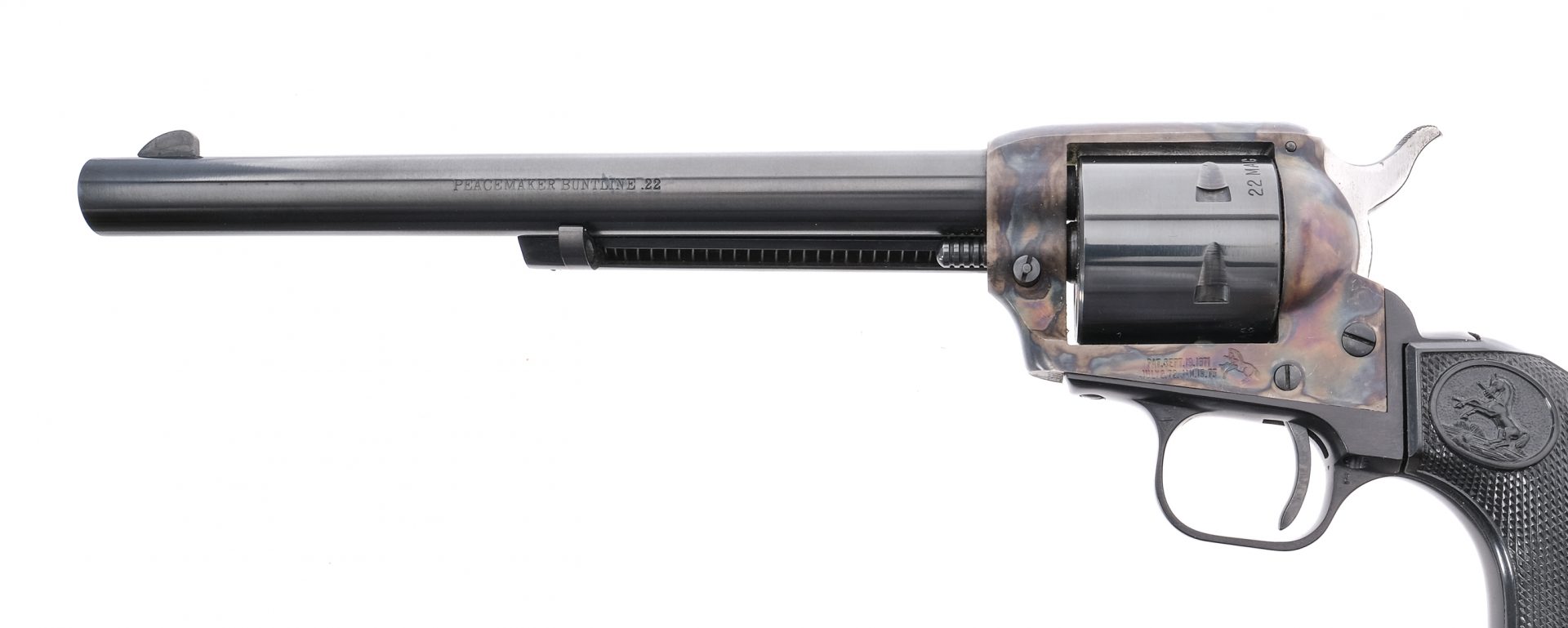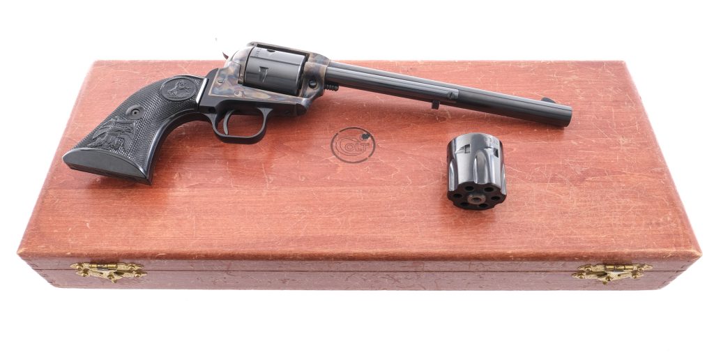 Description Colt Peacemaker Buntline with two, six-shot cylinders one chambered in .22 long rifle and one chambered in .22 magnum, and a 7.5″ barrel. Black finished barrel, cylinders, trigger, and backstrap. Case colored frame. Stainless and blued textured trigger. Diamond checkered composite Colt grips. Engraved heel. Rear notch and front fixed blade sights. Comes in its factory wood Colt case with instruction manual and two cylinders. Must ship to FFL holder. Condition: Like new with trigger tag and no turn line on either cylinder. The outside of the wood case is covered in scratches and marks. Barrel Length: 7.5″ Serial: G156631 Manufacturer: COLT Year: 1975 Caliber: .22 Long Rifle .22 Magnum Model: Peacemaker Buntline Book# 10-300