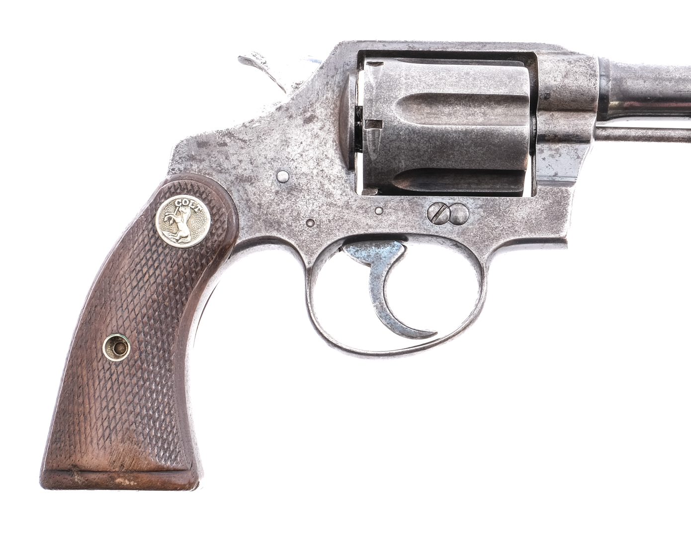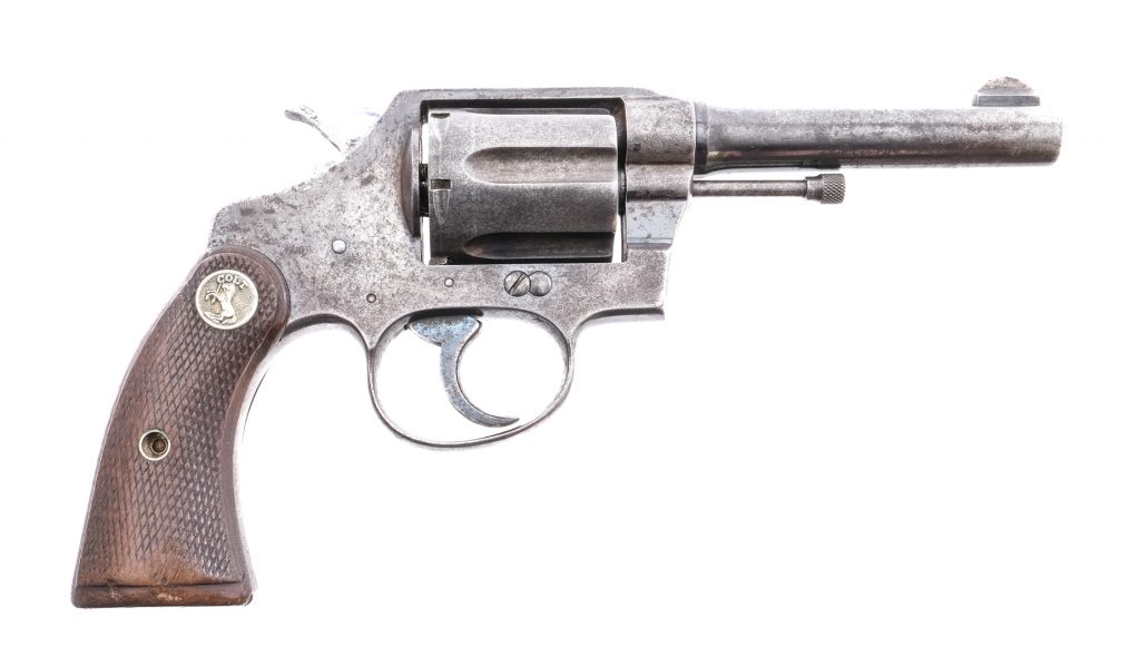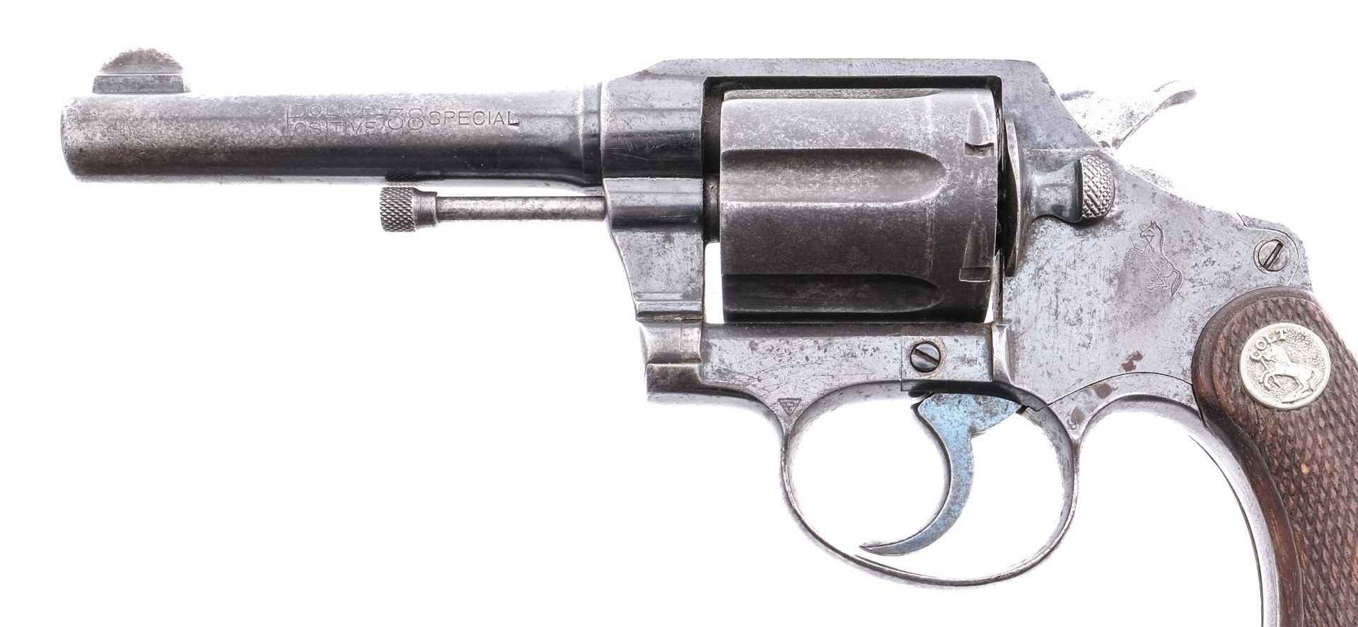 Description Colt Police Positive in .38 Special with a six round capacity and a 4″ barrel. Checkered wood grip plates. Blued frame, untextured trigger, checkered hammer, cylinder and barrel. Left side of frame checkered cylinder release. Front fixed blade sight. Must ship to a C&R or FFL holder. Condition: Fair with finish wear/loss, rust/pitting, scratches and handling wear. he rifled bore has spots of rust with visible rifling. Barrel Length: 4″ Serial: 76484 Manufacturer: Colt Year: 1914 Caliber: .38 Spl Model: Police Positive Book# X-298