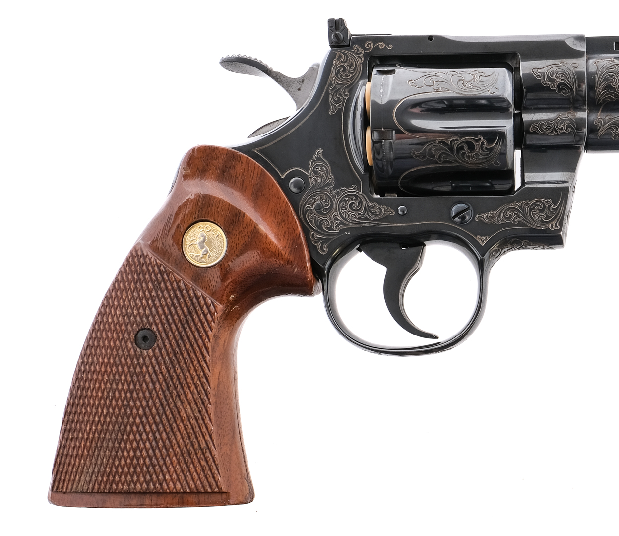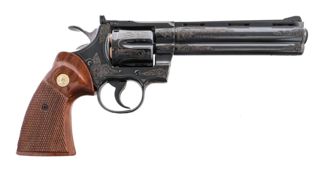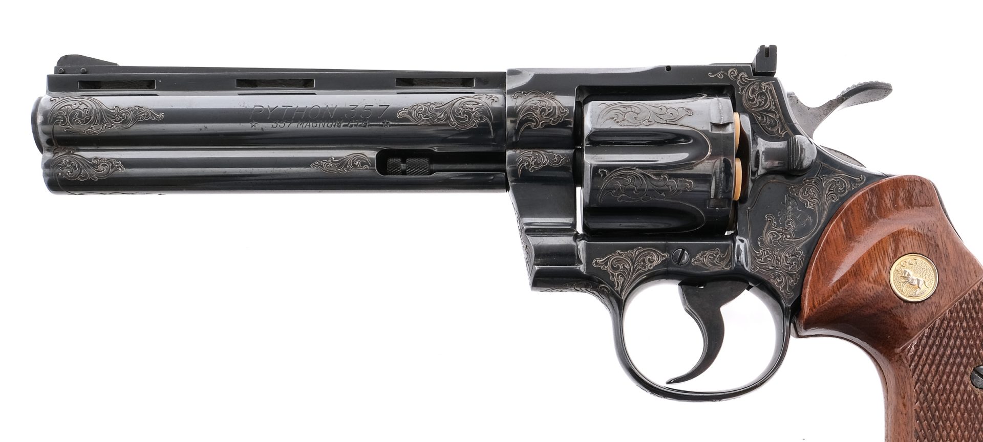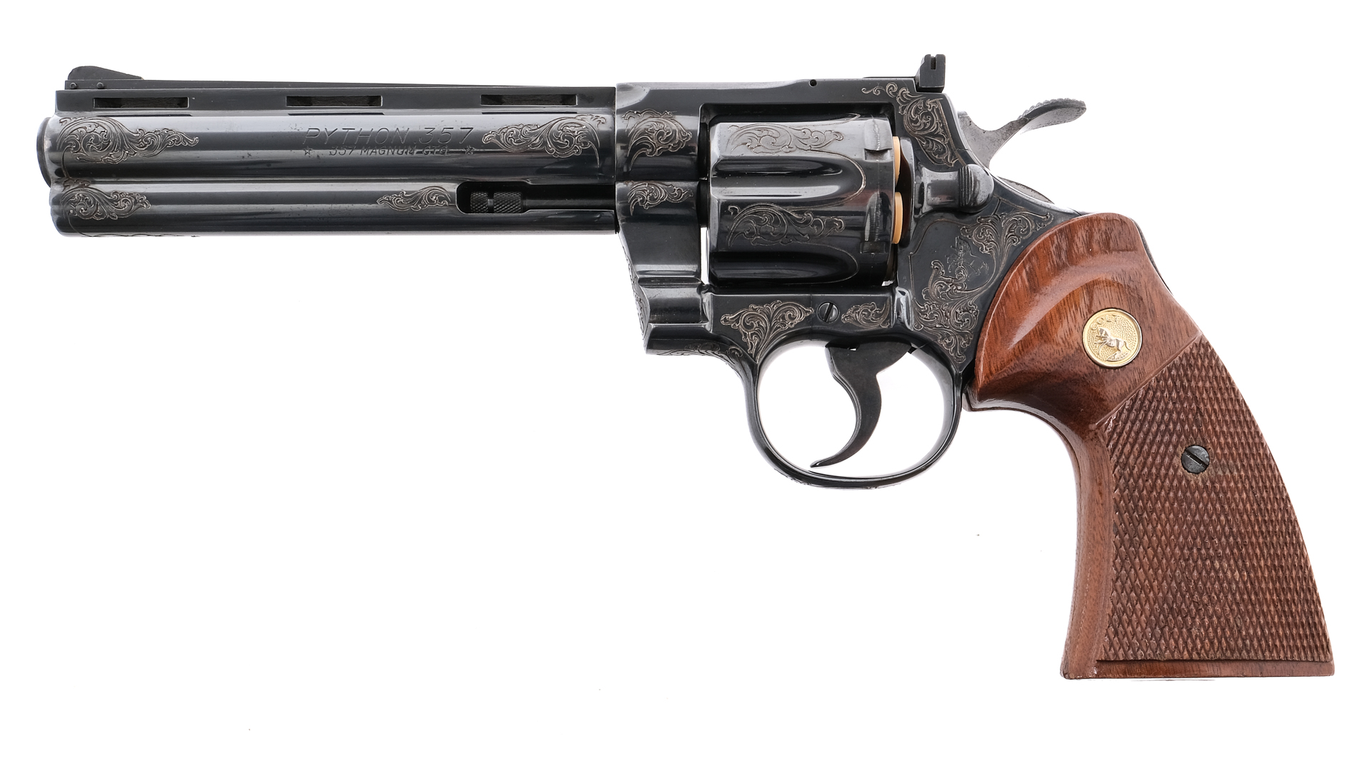 Description Colt Python in .357 Magnum with a six round capacity and a 6″ barrel. Checkered wood grip plates. Engraved blued frame, cylinder, serrated Target trigger, checkered Target hammer and barrel. Left side of frame serrated cylinder release. Rear adjustable and front fixed blade sight. Comes with six snap caps. Must ship to a FFL holder. Condition: Very Good with light scratches and touches of finish wear. Aftermarket engraving. Clean rifled bore. Barrel Length: 6″ Serial: T18342 Manufacturer: Colt Year: 1983 Caliber: .357 Mag Model: Python 357 Book# 10-481
