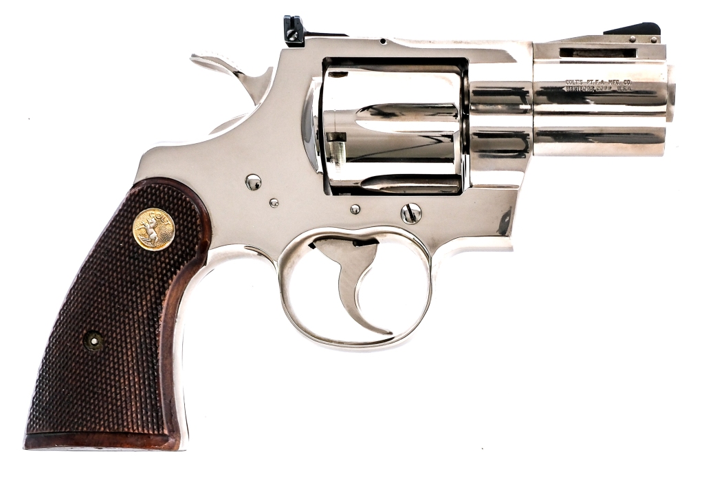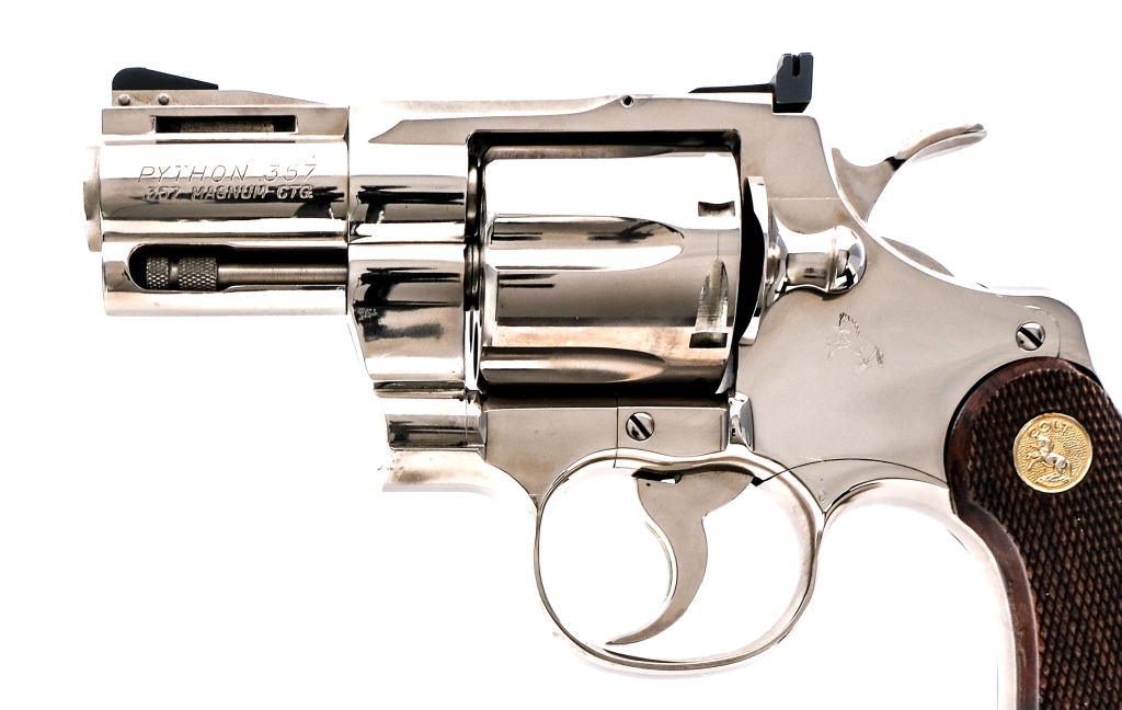 Description Colt Python chambered in .357 magnum with a six-shot cylinder capacity and a 2.5″ vented rib barrel. Made in Hartford Connecticut in 1974. Checkered wood grips with gold Rampant Colt medallions. Nickel finished barrel, frame, fluted cylinder, textured double action trigger, and hammer. Rear adjustable and front fixed blade sight. Comes in its factory box with matching serial number. Must ship to a C&R or FFL holder. Condition: Like New with light handling wear. Clean rifled bore. Barrel Length: 2.5″ Serial: E62167 Manufacturer: Colt Year: 1974 Caliber: .357 Mag Model: Python Book# 08521