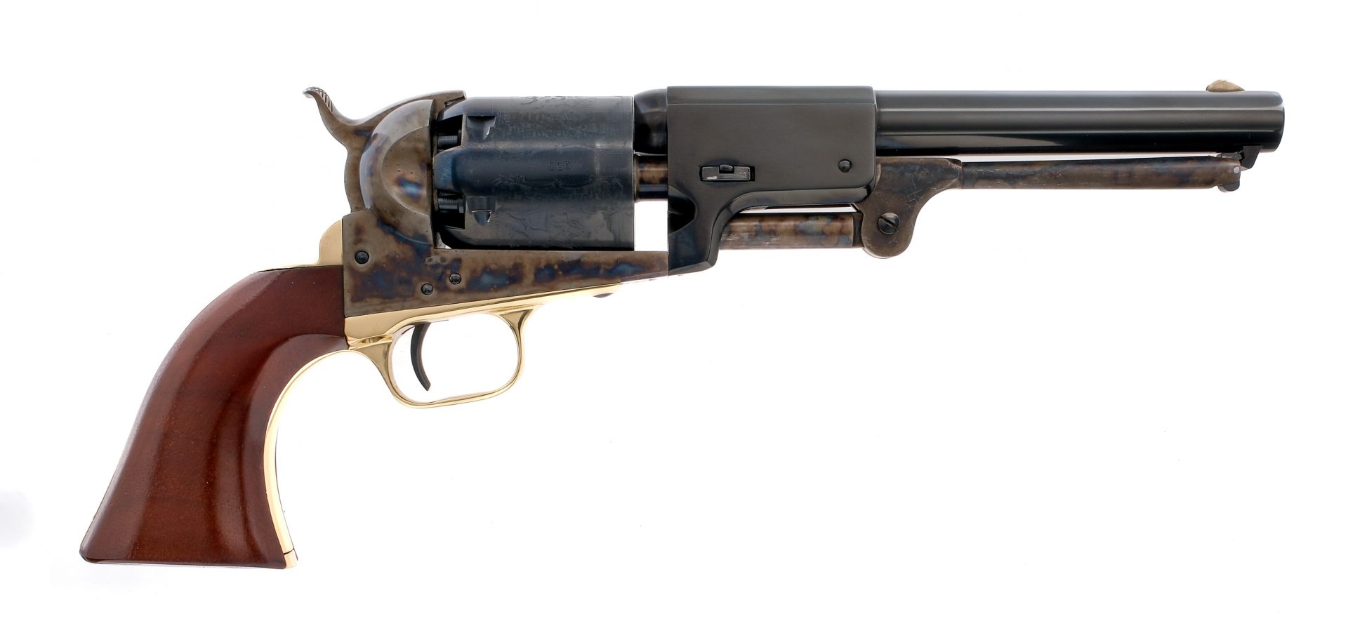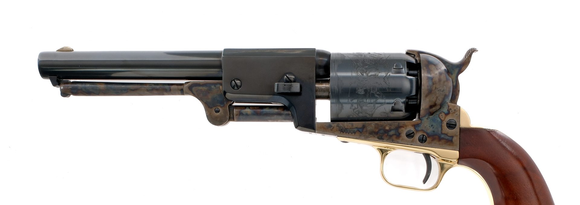 Description Colt signature series 3rd model Dragoon cap & ball black powder revolver in .44 caliber and a 6-shot capacity. Round, blued 7 1/2″ barrel and blued cylinder. Case colored frame, ram rod, and checkered hammer. Gold colored trigger guard and backstrap. Comes in it’s Colt box with white shipping box. Condition: Like-new in box with light spotting of rust on both sides of the frame from storage. Rifled bore is bright and clean. Barrel Length: 7.5″ Serial: 34693 Manufacturer: COLT Caliber: .44 Model: Dragoon