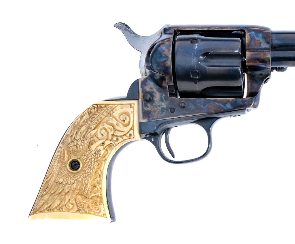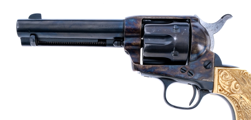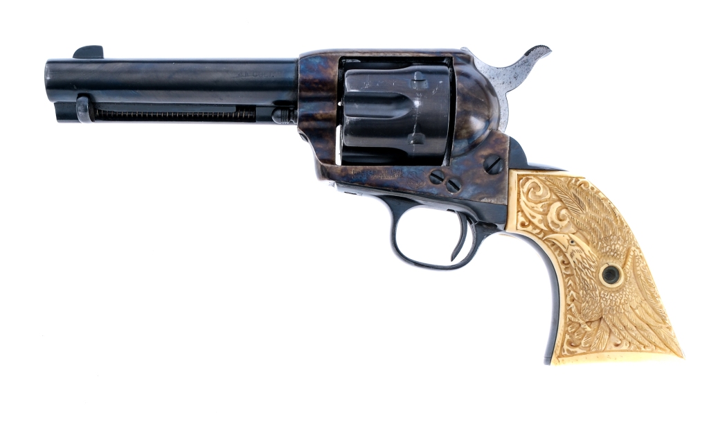 Description First generation Colt Single Action Army chambered in .41Long Colt with a 4.75″ barrel and a six round capacity cylinder. Features natural carved eagle grips, case colored frame, blued barrel, trigger guard, case ejector housing, and untextured trigger. Hammer spur is knurled with four distinct clicks during operation. Cylinder is scalloped, rear notch sight, and front blade sight. Colt patent date and rampant colt is visible on frame but Colt manufacturing mark on top of the barrel mostly faded but slightly visible. This SAA is an antique and can ship to most customers, please check local laws. Condition: Good, with complete refinishing of the entire revolver, serial numbers are worn down but visible. Operation still functions without hiccup. Some oxidation on sides of hammer. Minor scratches on barrel, and visible turn line. Bore is slightly worn with some oxidation, rifling still visible. Barrel Length: 4.75″ Serial: 137437 Manufacturer: Colt Year: 1891 Caliber: .41 Long Colt Model: Single Action Army Other: 05711