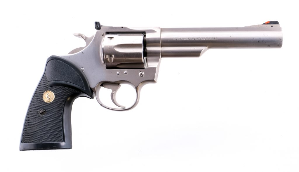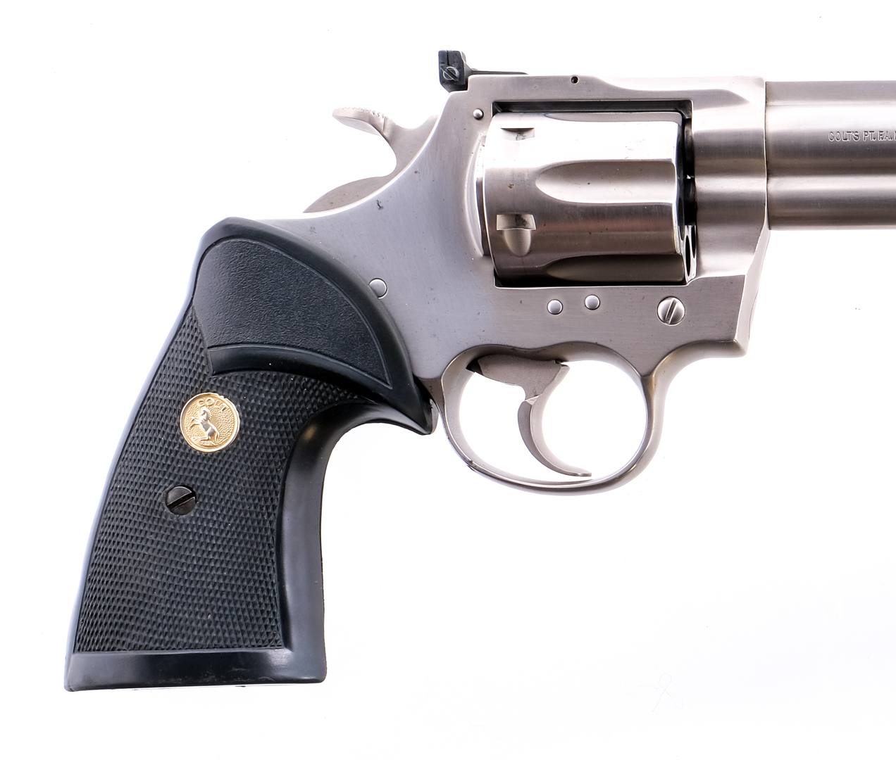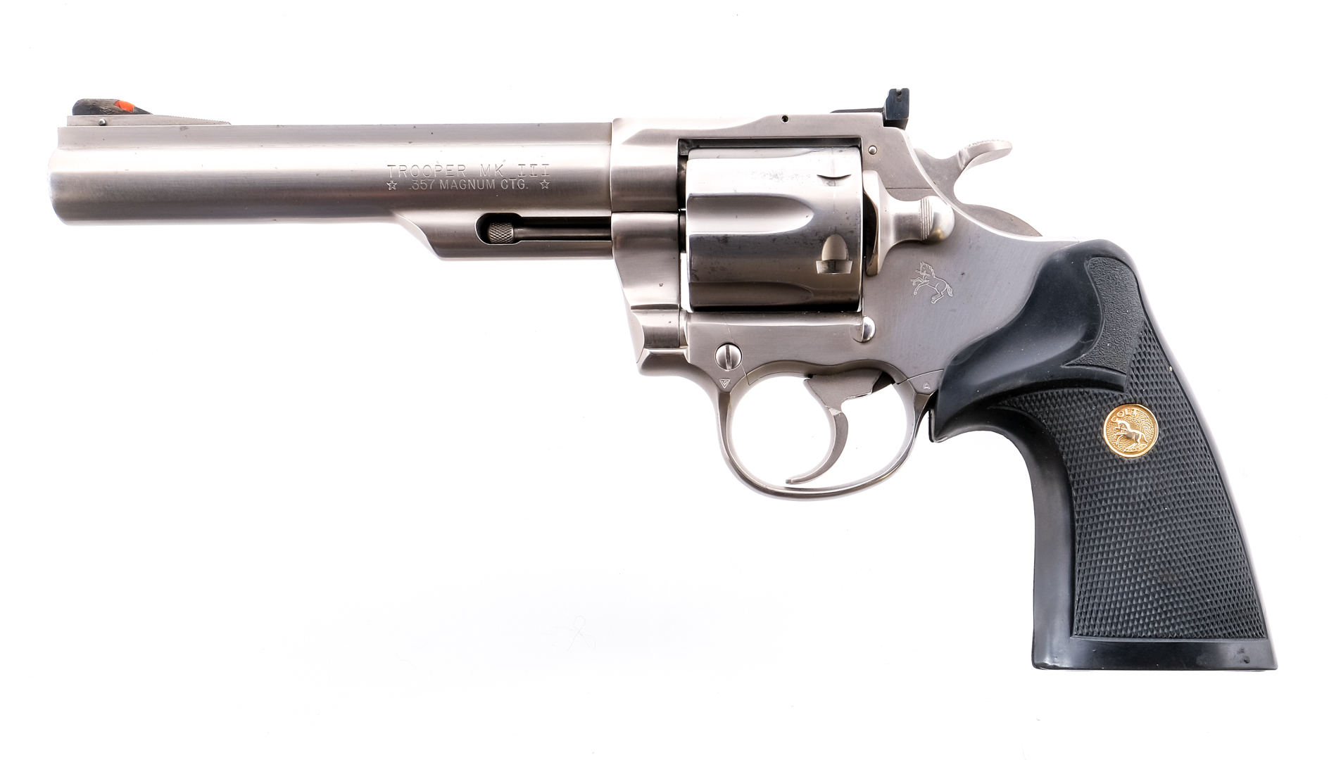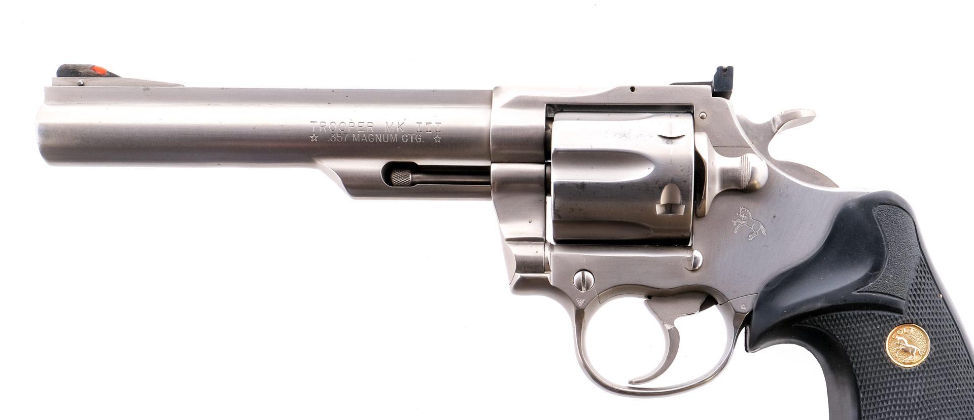 Description Colt Trooper MK III in .357 Magnum with a six round capacity and a 6″ barrel. Checkered rubber Pachmayr grip plates. Polished stainless steel frame, cylinder and barrel. Untextured trigger and checkered hammer. Left side of frame cylinder release. Rear adjustable and front fixed blade sight. Must ship to a FFL holder. Condition: Good with light scratches and metal pitting. The cylinder and crane fall out and are missing the small retention pin. Clean rifled bore. Barrel Length: 6″ Serial: 66447L Manufacturer: Colt Year: 1980 Caliber: .357 Mag Model: Trooper MK III Book# X-198
