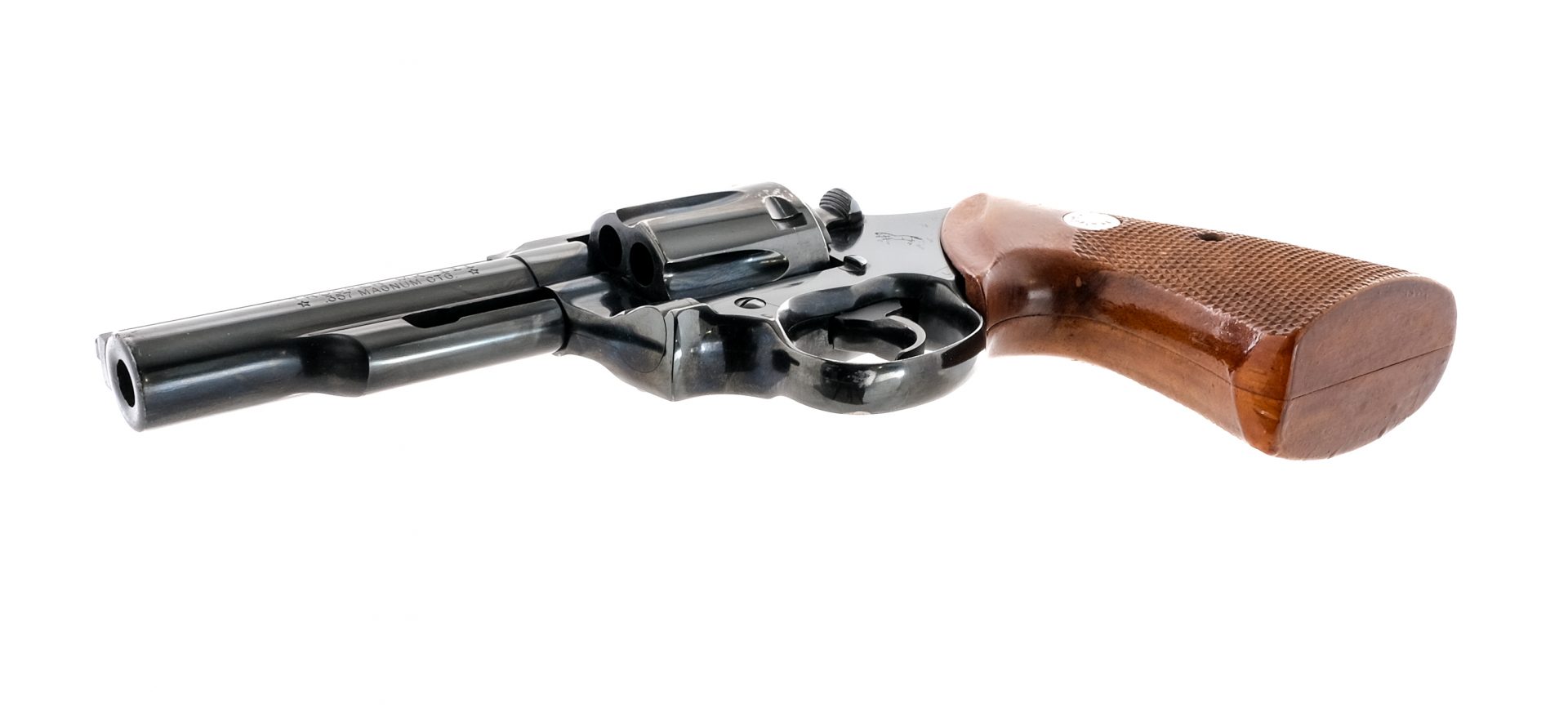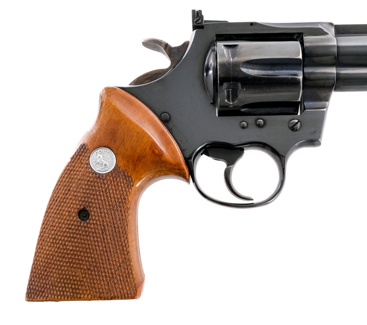 Description Colt Trooper Mk III double action revolver chambered in .357 Magnum with 4″ barrel a 6 shot capacity. Colt checkered grip plates. Blued frame, barrel and cylinder. Case colored target checkered hammer. Blued smooth target trigger. Fixed ramp front sight. Adjustable rear notch sight. Will ship to a C&R or FFL holder. Condition: Very Good with touches of finish loss and oxidation on the trigger guard, cylinder and muzzle. Bottom have frame has a small rust patch. Scratches and pitting under the grip plates by the thumb rests. Visible turn line. Contact marks on left side of the muzzle. Rifled bore is very clean and bright. Barrel Length: 4″ Serial: J63771 Manufacturer: COLT Year: 1971 Caliber: .357 Magnum Model: Trooper Mk III Book# 01828