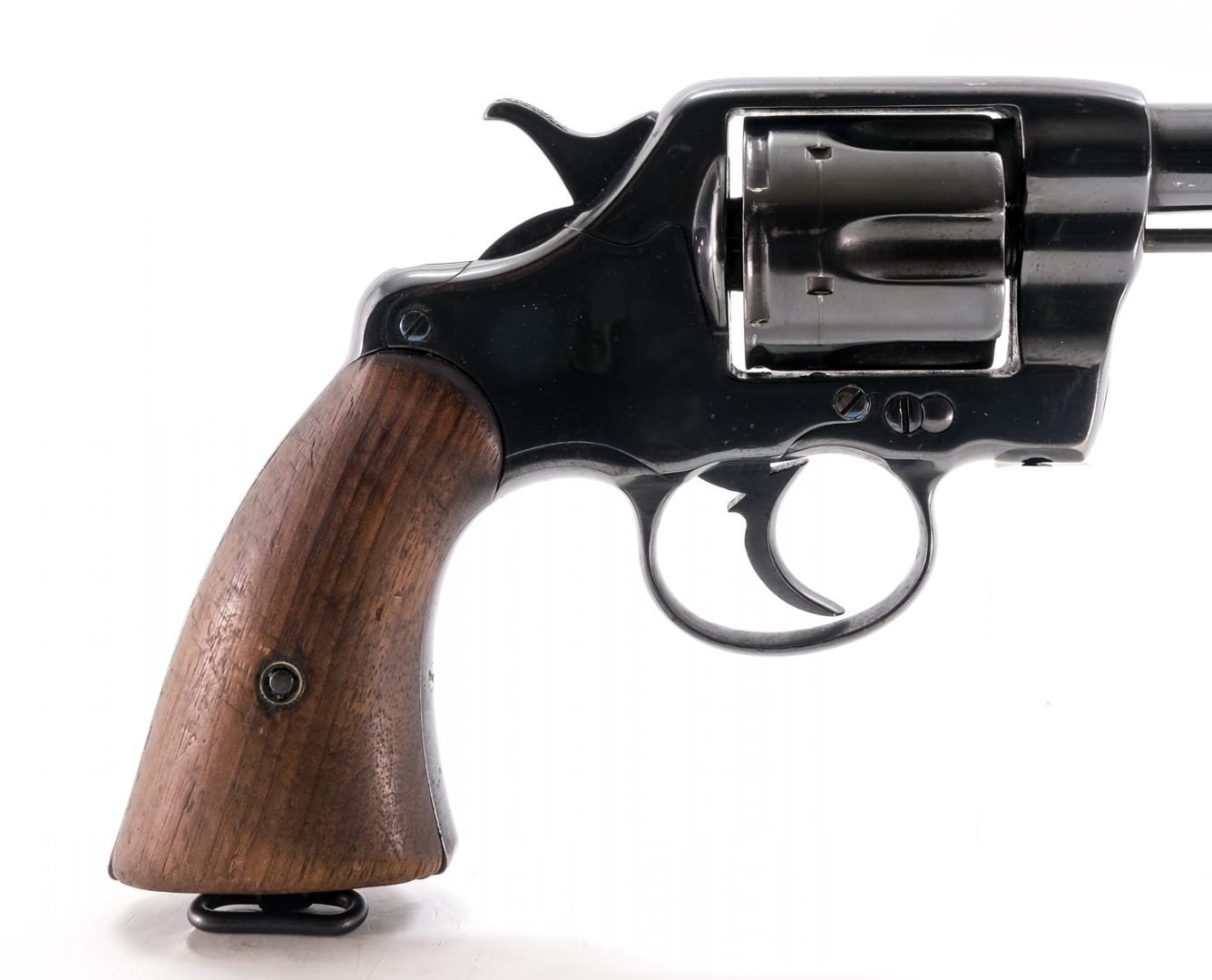 Description Colt M1892 model 1901 in .38 LC (Long Colt) with a six shot capacity and a 6″ barrel. The Model 1892 had improvement request from the Army resulting in small changes and model numbers. This result is this model 1901 which is an improved M1892. Smooth wood grip plates. Blued frame, cylinder, barrel, checkered hammer and smooth trigger. Fixed front blade sight. Left side of frame checkered cylinder release. Heel located metal lanyard loop. Marked on the inside cylinder gate “3 8552″ K 8552”. Marked on the cylinder release button “K 8552”. One the rear left side of frame “R.A.C.” On the inside left side of frame under grips “K 8”. On the cylinder face “R.A.C” This revolver must ship to a C&R or FFL holder.