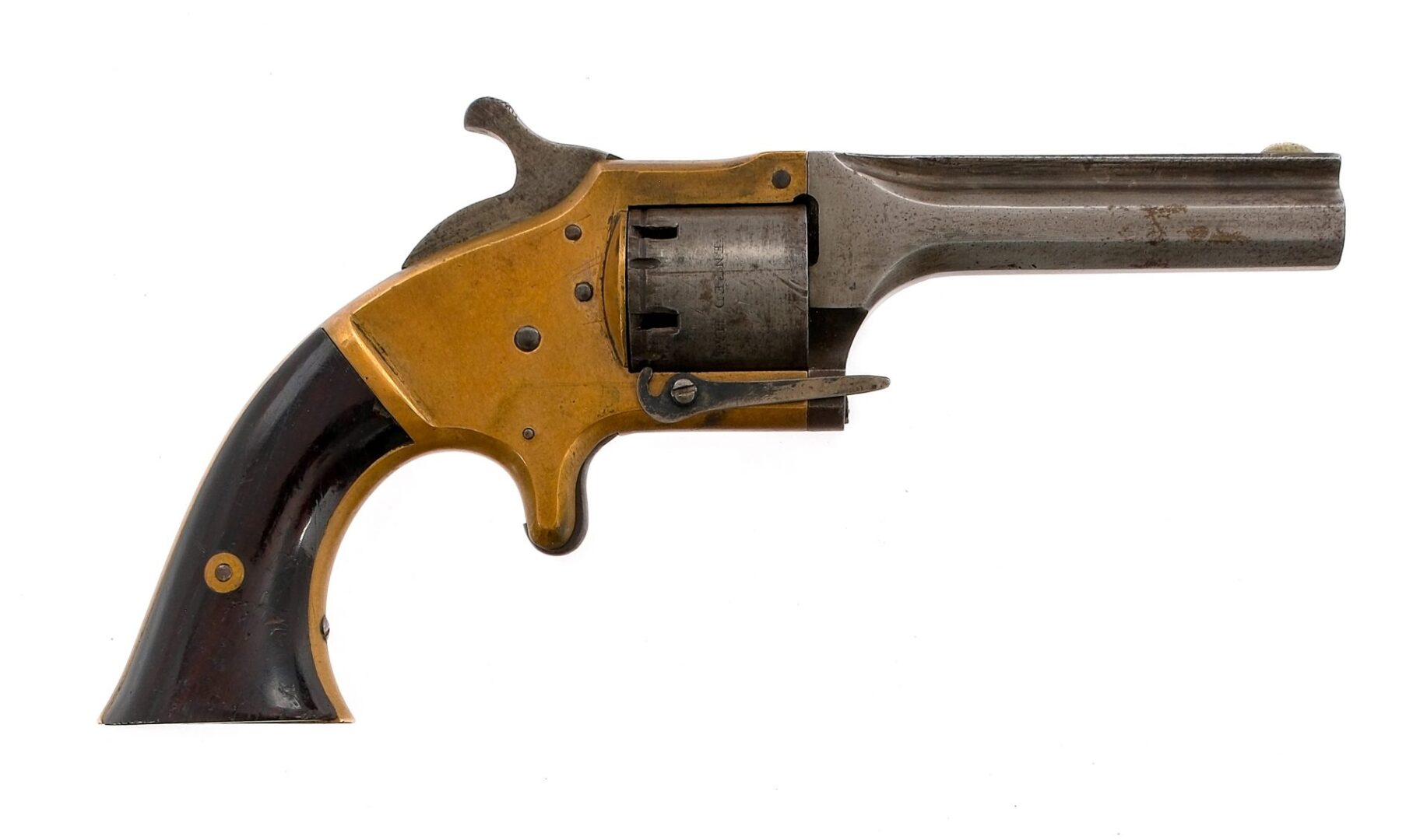 Description Connecticut Arms Company Pocket Pistol in .28 Cup Fire with a six round capacity and a 3″ octagon barrel. Smooth wood grip plates. Finish worn brass frame. Finish worn solid trigger, checkered hammer, cylinder and barrel. Front fixed blade sight. Right side of frame extractor. Antique, No FFL required and ships to MOST buyers homes. Condition: Antique, Very Good with scratches, wood grip damage, finish wear/loss and touches of rust. The rifled bore has rust. Barrel Length: 3″ Serial: 770 Manufacturer: Connecticut Arms Co Caliber: .28 Cup Fire Model: Pocket Pistol