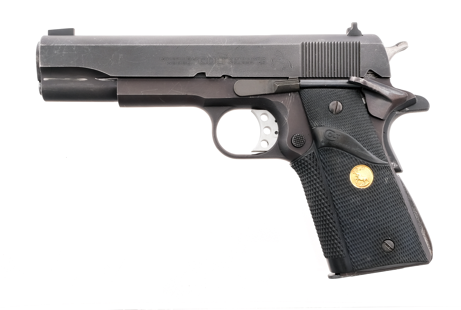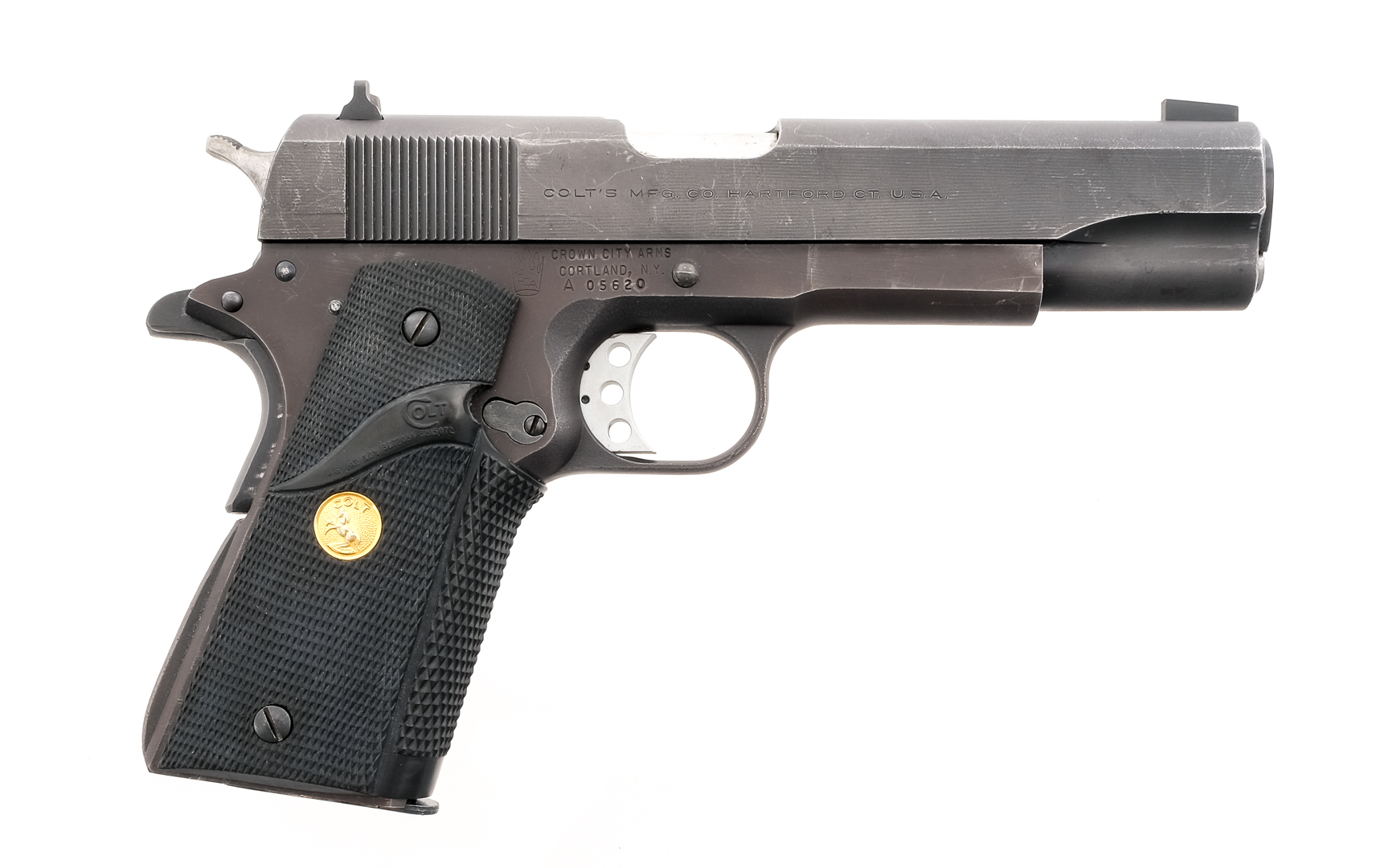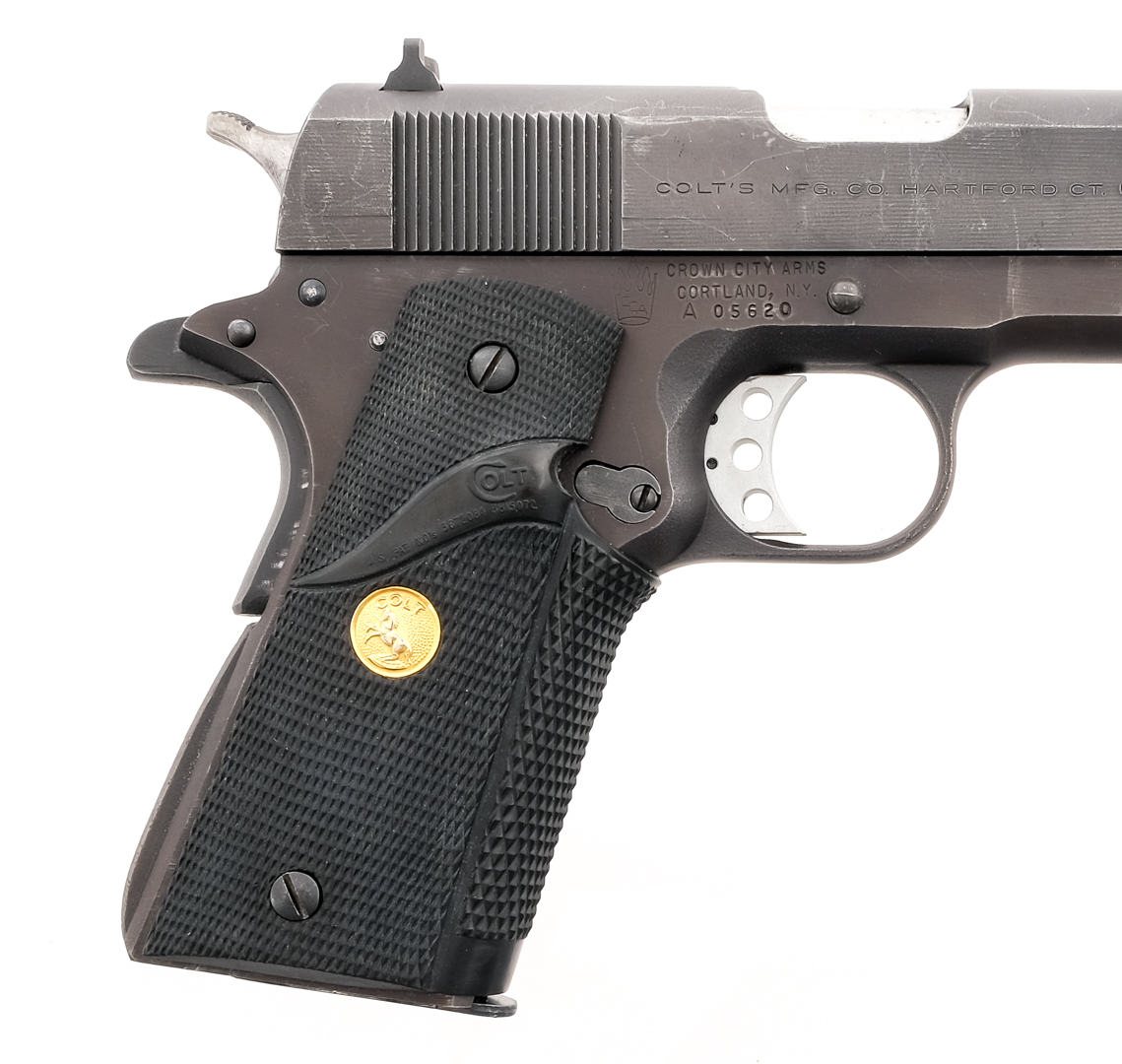 Description Crown City Arms Model 1911 Government Model in .45 ACP with one, seven round removable magazine and a 5″ barrel. Frame made by Crown City Arms of New York and the slide is a Pre 1994 Colt Government Model. Pachmayr checkered rubber grip plates. Parkerized frame and serrated slide. Serrated skeletonized trigger and serrated hammer. Backstrap depression safety. Left side of frame slide release and slide stop safety. Lower left side of frame checkered magazine release button. Front and rear fixed sights. The barrel is marked: C. Must ship to a FFL holder. Condition: Very good with light scratches, dings and handling wear. Bottom of magazine marked: Llama, Omni. Missing the small screw that goes into the top rear of slide. Clean rifled bore. Barrel Length: 5″ Serial: A05620 Manufacturer: Crown City Arms Colt Mfg Caliber: .45 ACP Model: 1911 Government Model Book# 8-423