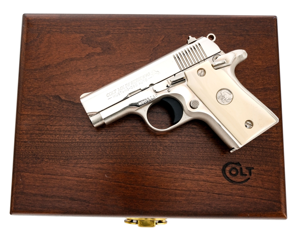 Description Colt Custom Shop Mustang MK IV chambered in .380 ACP with one, six round Colt magazine and a 2 3/4″ barrel. On January 10, 1986 this custom made pistol was shipped to the Colt Firearms Employee Sale Department for Mr. Gary French, the President of Colt at the time. It features a full nickel finish with smooth ivory stocks. The stocks feature nickel colt 150th medallions. “Carolyn Raye” is linecut engraved in script style on the backstrap. Single action trigger and hammer, with frame mounted manual safety. Fixed iron sights. Comes in its factory serial matching Colt Custom Shop box with manual. Also comes with a Colt walnut presentation case, French fitted with Royal Gray velvet interior. This information and more can be found in the included Colt historical letter. Must ship to a FFL holder. Condition: Like new, appearing to have seen very little use. Very light scratches and general wear from handling/storage. Bright and clean bore with strong rifling. Barrel Length: 2 3/4″ Serial: MU05240 Manufacturer: COLT Caliber: .380 ACP Model: Mustang MKIV Series 80′ Book# 07223