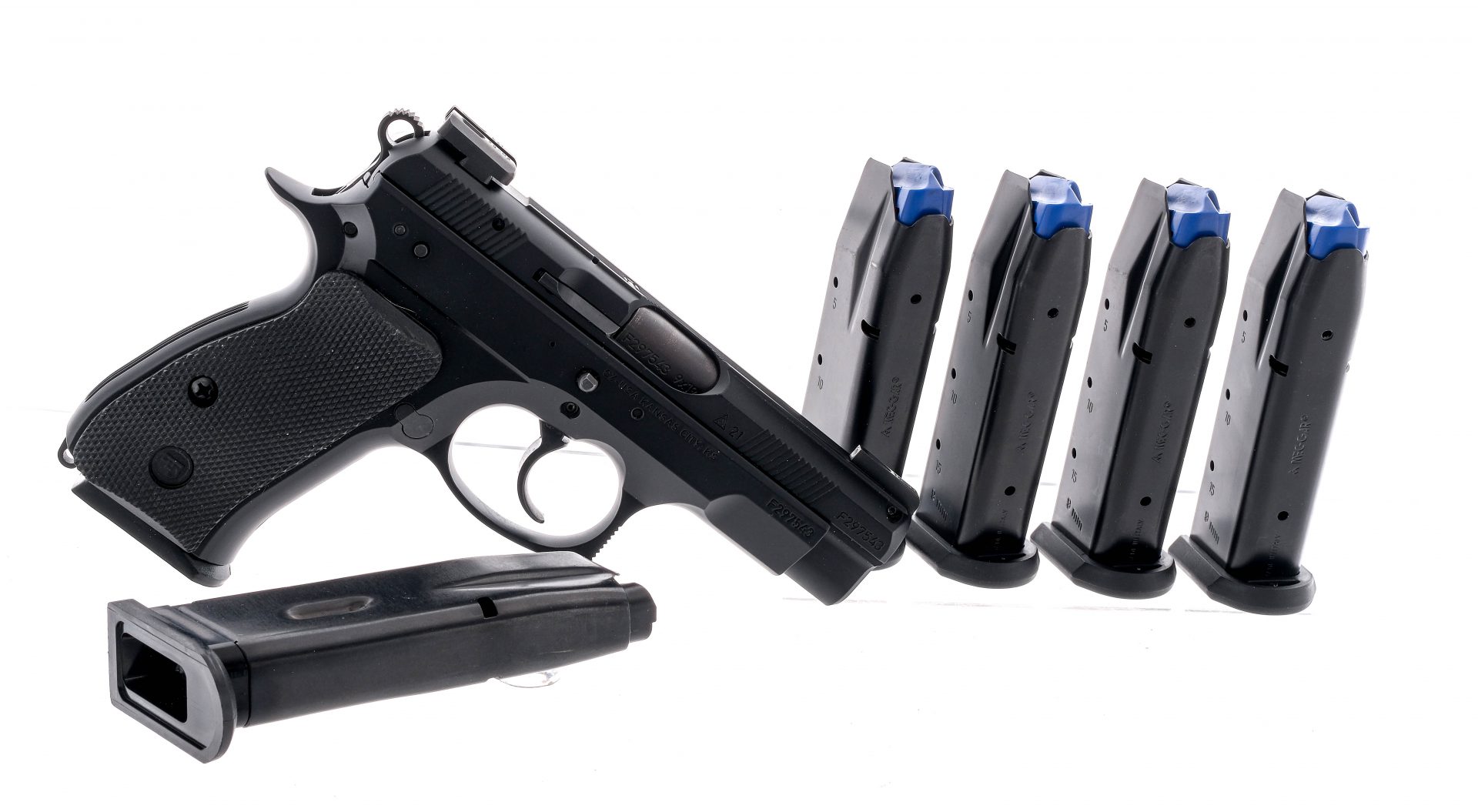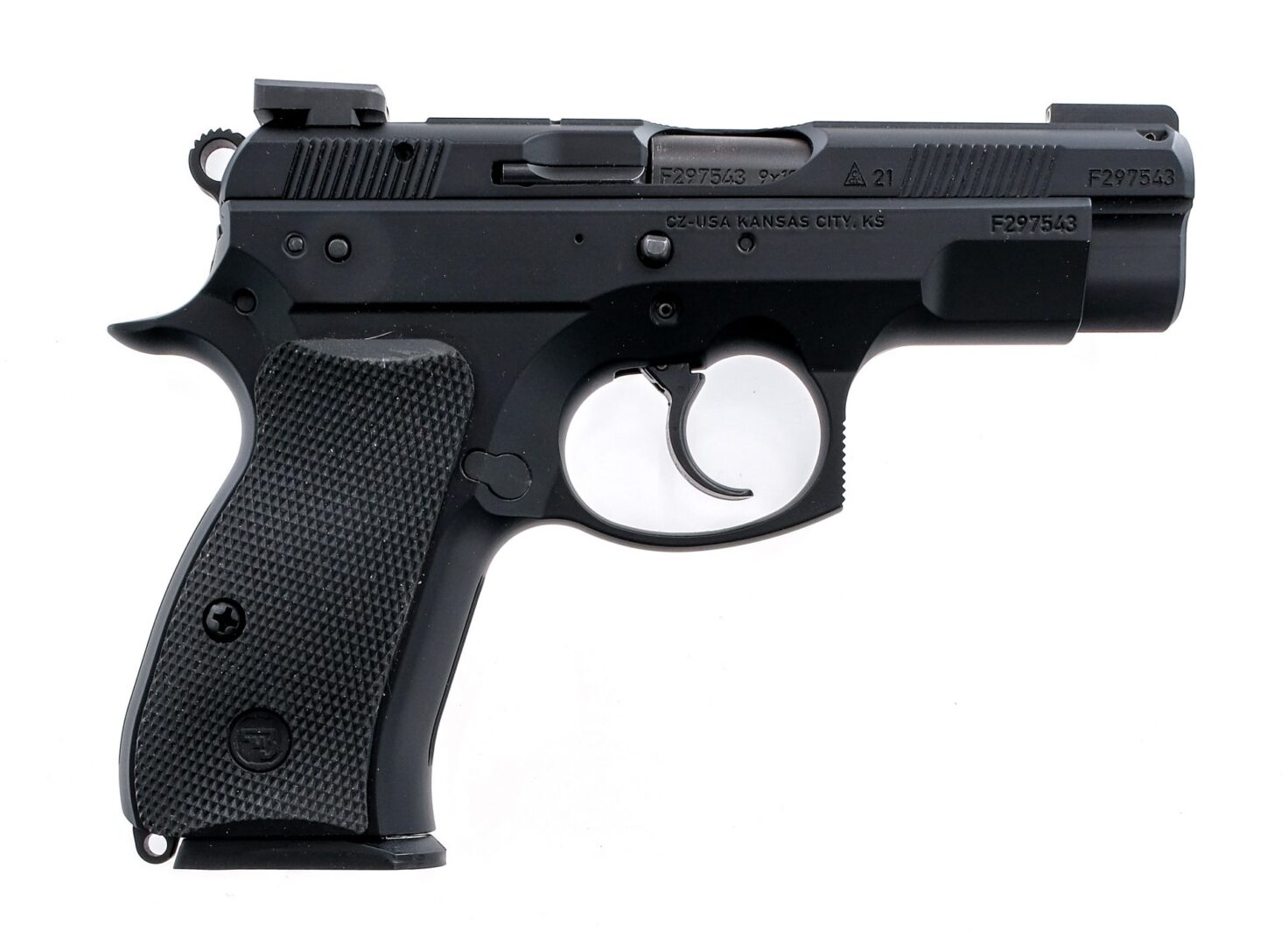 Description CZ 74 D Compact chambered in 9mm with four, fifteen round removable magazines, two, ten round removable magazines, and a 3.75″ col hammer forged barrel. Black finished aluminum frame with checkered rubber CZ grips. Double/single action trigger and hammer. Serrated push button magazine release and slide release. Frame mounted de-cocker. Black finished slide with front and rear cocking serrations. Green tritium three-dot iron sights. Comes in its factory box with factory paperwork, brush, lock, and six magazines. Must ship to a FFL holder. Check local laws regarding “High Capacity” magazines BEFORE bidding. Condition: Excellent with very light handling wear. Clean rifle bore. Barrel Length: 3.75″ Serial: F297543 Manufacturer: CZ Caliber: 9x19mm Parabellum Model: 75 D Compact Book# 03070