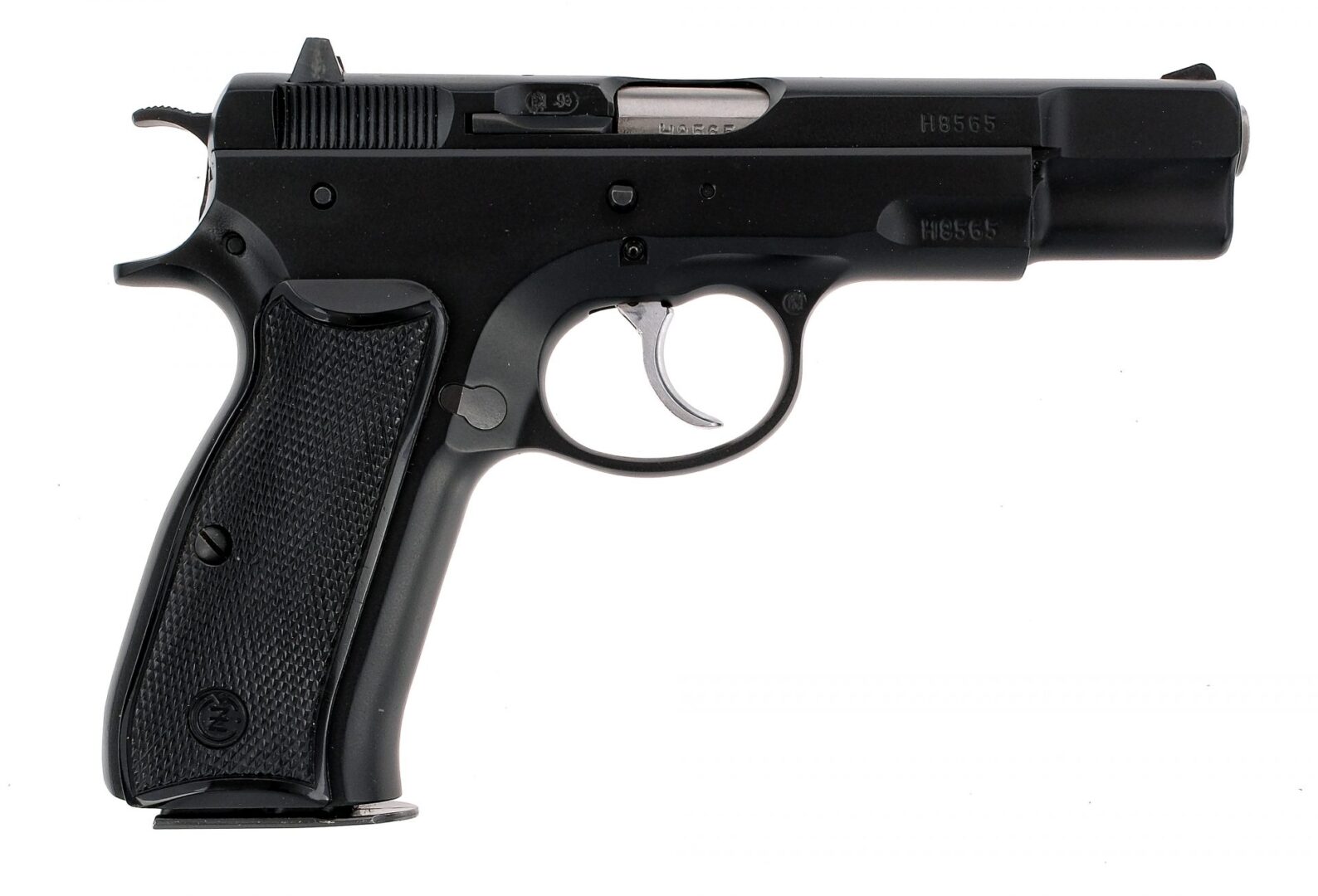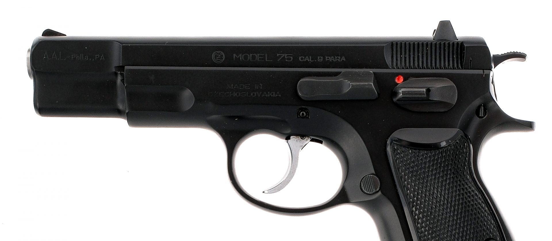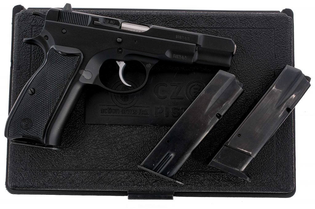 Description CZ 75 chambered in 9mm with two, fifteen round magazines, one, ten round magazine, and a 4.7″ barrel. Manufactured by CZ in Czechoslovakia and imported by A.A.L. Phila. PA, marked on the left side of the slide. Black finished steel frame with checkered polymer CZ grips. Stainless double/single action trigger and black hammer. Frame mounted manual thumb safety. Textured push button magazine release and slide stop. Fixed iron sights with two-dot rear and white ramp front. Comes in its factory CZ hard case with a cleaning brush and three magazines. Must ship to a FFL holder. Check local laws regarding “High Capacity” magazines BEFORE bidding. Condition: Excellent with light wear from normal handling/operation. Clean rifled bore. Barrel Length: 4.7″ Serial: H8565 Manufacturer: CZ Caliber: 9x19mm Parabellum Model: 75 Book# 04653