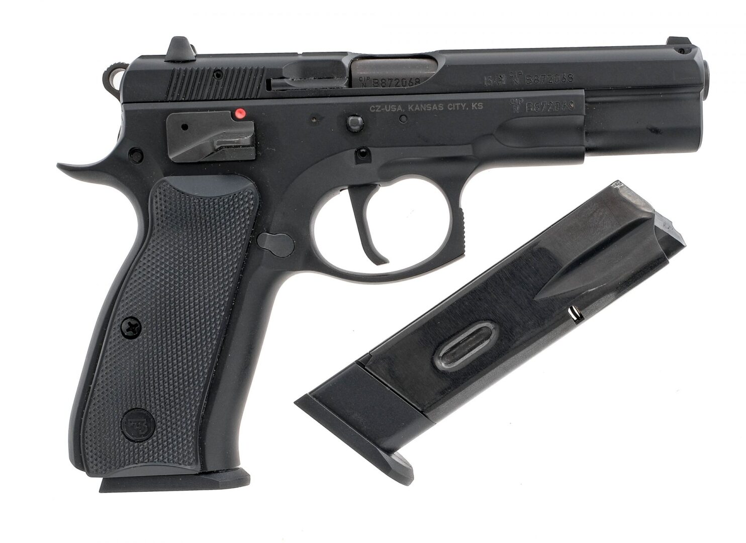 Description CZ 75B SA (Single Action) chambered in 9mm with two, magazines and a 4.5″ hammer forged barrel. Black finished steel frame with checkered polymer grips. Crisp single action trigger and hammer. Frame mounted ambidextrous manual thumb safety. Black finished steel serrated slide with white three-dot iron sights. Comes in its factory box with factory paperwork and two magazines. Must ship to a FFL holder. Condition: Very Good/Excellent with some light scratches and wear from normal handling and operation. Clean rifled bore. Barrel Length: 4.5″ Serial: B872068 Manufacturer: CZ Caliber: 9x19mm Parabellum Model: 75B SA Book# 03460