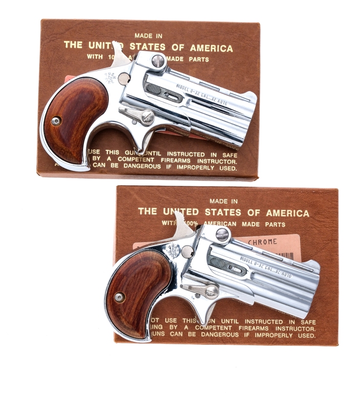 Description Davis Industries Model D-32 Sequential two piece set. Includes serial number 301341 and 301342 both in original boxes. In .32 ACP with a two round capacity and a 2.25″ over under barrel. Smooth wood grip plates. Chrome finished frames and barrels. Solid triggers and serrated hammers. Right side of frame barrel tip up lever. Right side of barrel extractor. Rear notch and front fixed blade sights. Both come in factory boxes with matching serial numbers and instruction manuals. Must ship to a FFL holder. Condition: Like New in box. Clean rifled bores. Barrel Length: 2.25″ 2.25″ Serial: 301341 301342 Manufacturer: Davis Industries Caliber: .32 ACP Model: D-32 Book# 07044 07045