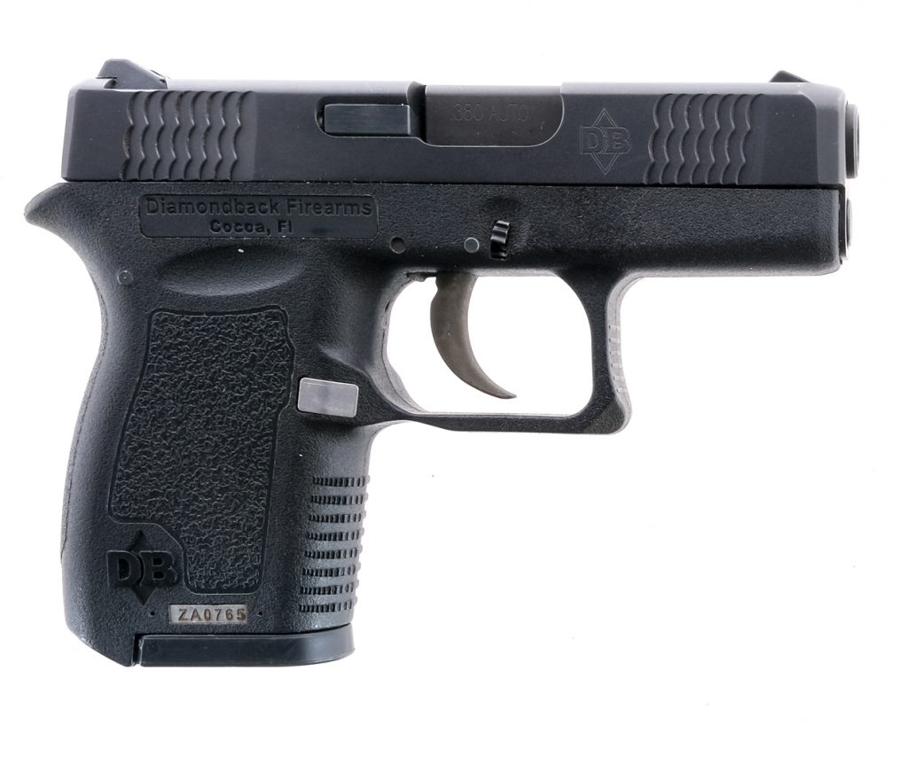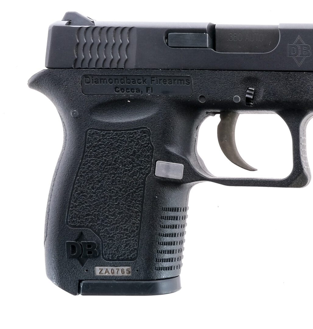 Description Diamondback Firearms DB380 in .380 caliber with one, six round removable magazine and a 2.75″ barrel. Textured grip on composite frame. Blued untextured trigger and serrated slide. Left side of frame serrated magazine release. Front and rear fixed sights. Comes in a Uncle Mikes size 36 soft belt holster. Must ship to a FFL holder. Condition: Good/Very Good with light scuffs and handling wear. Clean rifled bore. Barrel Length: 2.75″ Serial: ZA0765 Manufacturer: Diamondback Firearms Caliber: .380 ACP Model: DB 380 Book# 8-513