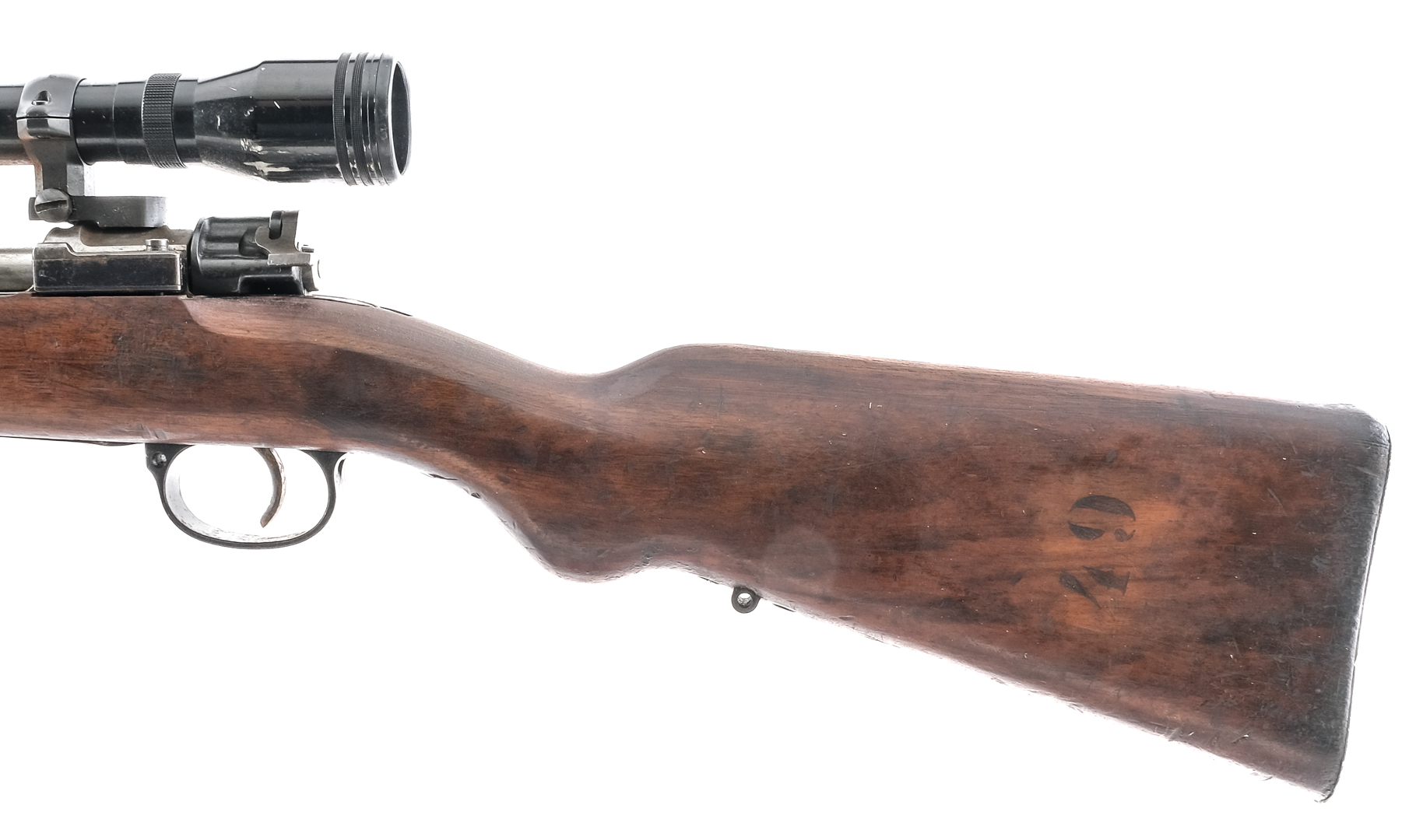 Description Deutsche Waffen Und Munitionsfabriken 1908 Brazilian Contract Mauser in 7x57mm with a five round capacity and a 29″ barrel. Metal butt plate. Smooth wood stock and front forend. Blued trigger guard, untextured trigger, receiver and barrel. Rear bolt safety switch. Rear left side of receiver located bolt release. Under barrel fixed bayonet lug. Metal loops for mounting a shoulder sling. Rear flip up adjustable and front fixed blade sight. Comes mounted with a Tasco Pronghorn 25×20 with clear glass and a duplex reticle. Import marked on the muzzle end of barrel by C.A.I. Left side of wood stock marked: 49. Must ship to a C&R or FFL holder. Condition: Good with scratches, finish wear/loss and rust. The rifled bore has rust with visible rifling. Barrel Length: 29″ Serial: B5494 Manufacturer: DWM Brazil Year: 1908 Caliber: 7x57mm Model: 1908 Book# 10-599