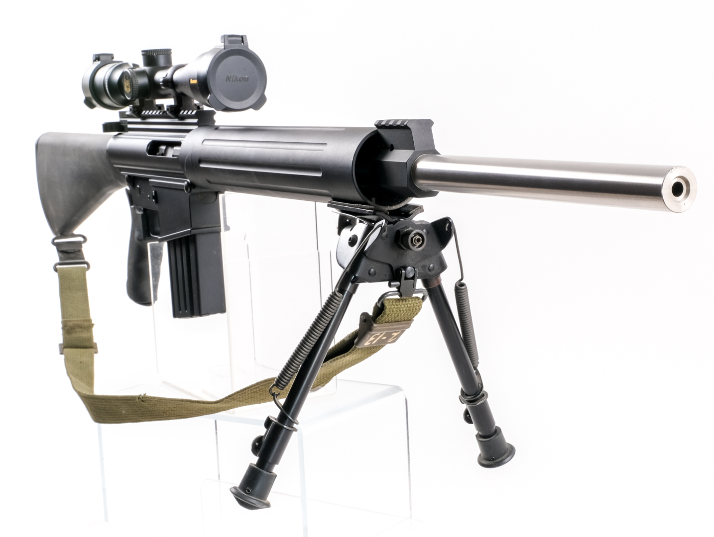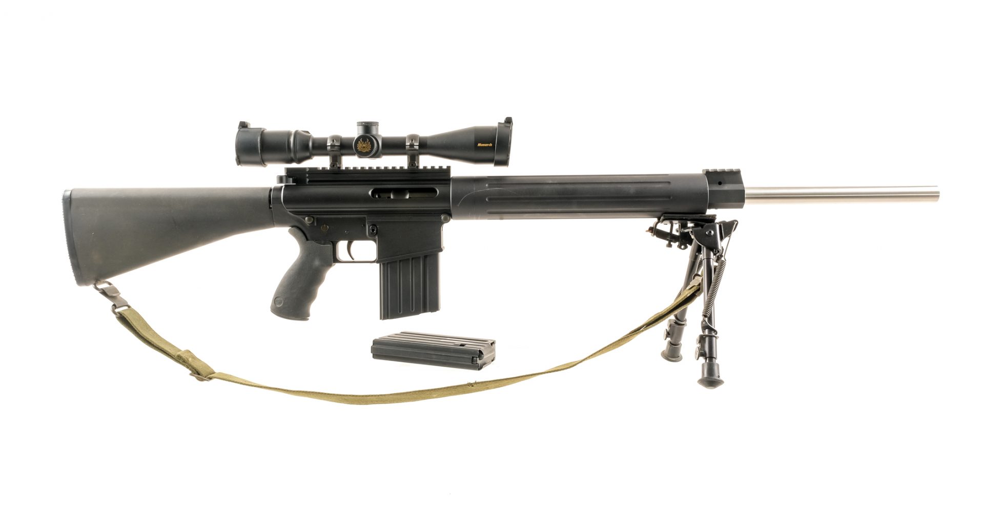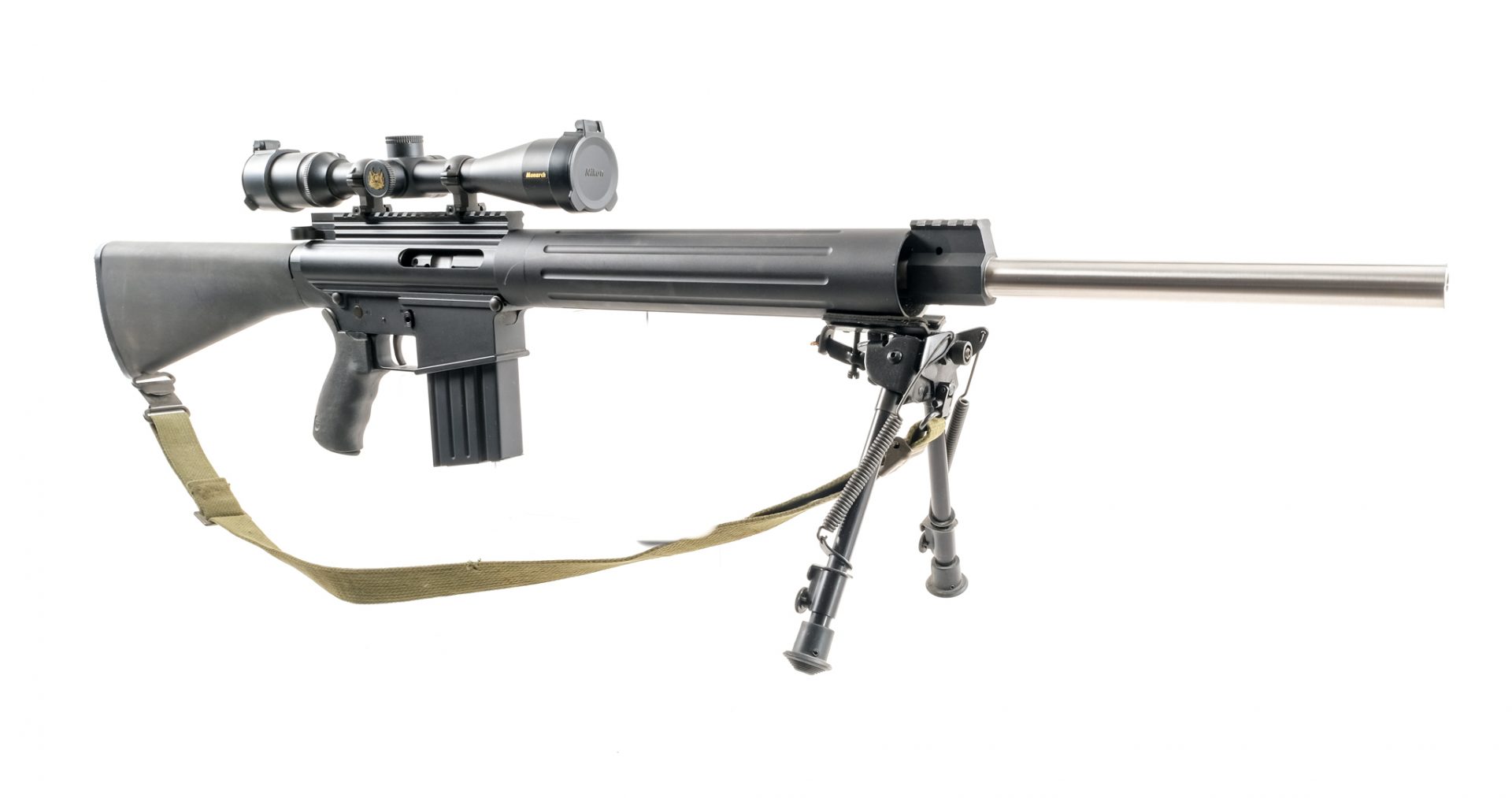 Description DPMS Panther Arms Model LR-308 in .308 with two, twenty round removable magazines and a 24″ heavy Bull barrel. This was sold a s a “Stripped Lower” and built with DPMS/other parts. DPMS marked barrel .308 1-10. Checkered butt plate. Composite butt stock with cleaning kit door, empty. Textured rubber pistol grip. Black finished lower and upper receiver. Left rear side of receiver charging handle. Left side of receiver serrated safety switch and action release. Top receiver optics rail and front top barrel optics/accessories rail. Foregrip mounted adjustable Harris SL bipod. Mounted with cloth shoulder sling, a Nikon Monarch 3-12×42 scope with clear glass and a duplex reticle. Comes with two, twenty round removable magazines. Check Local/State Laws for HIGH CAPACITY MAGAZINES and BANNED WEAPONS before bidding. Must ship to a FFL holder. Condition: Very Good/Excellent with light scratches and handling wear. Clean rifled bore. Barrel Length: 24″ Serial: 35045K Manufacturer: DPMS Panther Arms Caliber: .308 Model: LR-308 Book# 9-282