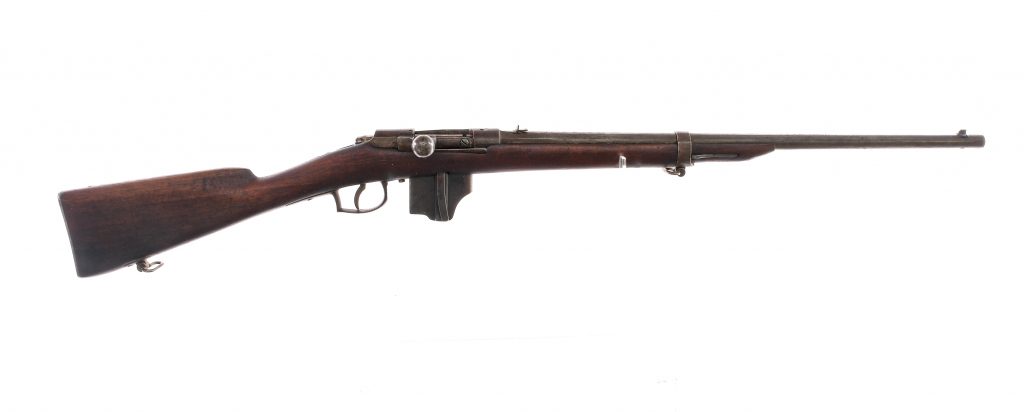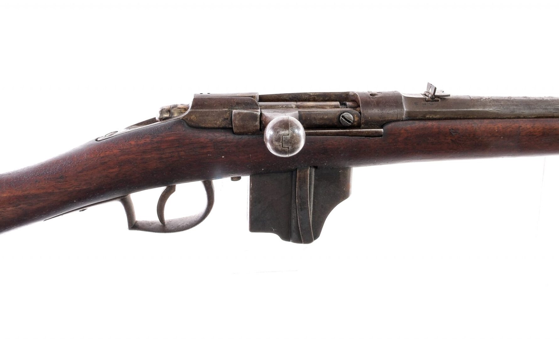 Description Dutch Beaumont Model 71-88 (Sporterized) in 11.3x50mm with a four round capacity and a 24″ barrel. Metal butt plate. Smooth wood stock. Finish worn trigger guard, trigger, receiver, bolt and barrel. Left side of receiver serrated magazine cut-off. Rear flip up and front fixed blade Lyman sight. Metal loops for mounting a shoulder sling. Left side of barrel has a number 52 stamped in and manufacture date 1873. Antique, No FFL required and ships to MOST buyers homes. Condition: Antique, Good with finish wear/loss, rust, scratches, missing the original rear adjustable sight and has a cut down stock and barrel. Clean rifled bore. Barrel Length: 24″ Serial: 891 Manufacturer: P. Stevens Year: 1873 Caliber: 11.3x50mm Model: 71-88