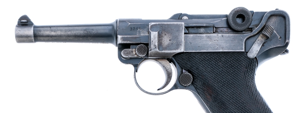 Description DWM 1914 Military P08 Luger chambered in 9mm with one, eight round magazine with wood base plate, and a 4″ barrel. Manufactured in 1916 with serial number 3266O. Imported by Century Arms, marked on the bottom of the barrel. Rust blued frame with stock lug, narrow trigger guard, and push button magazine release. Straw finished takedown lever, wide trigger, extractor, and serrated thumb safety marked “GESICHERT”. Matching checkered walnut grips. Rust blued barrel, chamber, and toggle with flat checkered toggle knobs. Front fixed “dorsal fin” blade and rear V-notch iron sights. The top of the bore is marked with the manufacture date of 1916. The top of the toggle is marked “DWM”. The barrel, toggle, and receiver are marked with German military proof marks. DWM acceptance mark is on the right side of the receiver. The bottom of the barrel is marked with “8,82”. All parts appear to be matching aside from the magazine. The magazine has a tin body with a wood base plate, may have been matching but the base plate has been sanded. Must ship to FFL or C&R holder. Condition: Fair with scratches, sharp edge wear, and general cosmetic handling wear. Spots of metal oxidation and finish patina. Finish thinning around the muzzle and on the contact points such as the front and backstrap .Most of the straw finished is in the white. Scratches in the grips with mostly worn but visible checkering. The bore has visible but worn rifling with spots of pitting throughout. Barrel Length: 4″ Serial: 32660 Manufacturer: DWM Year: 1916 Caliber: 9x19mm Parabellum Model: 1914 Military P08 Luger Book# 07046