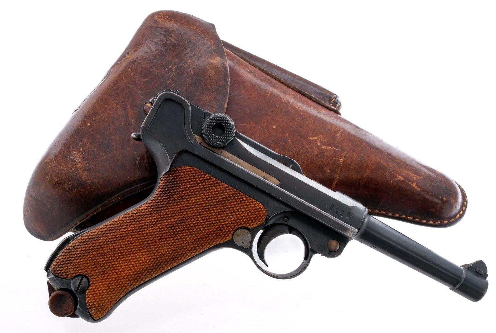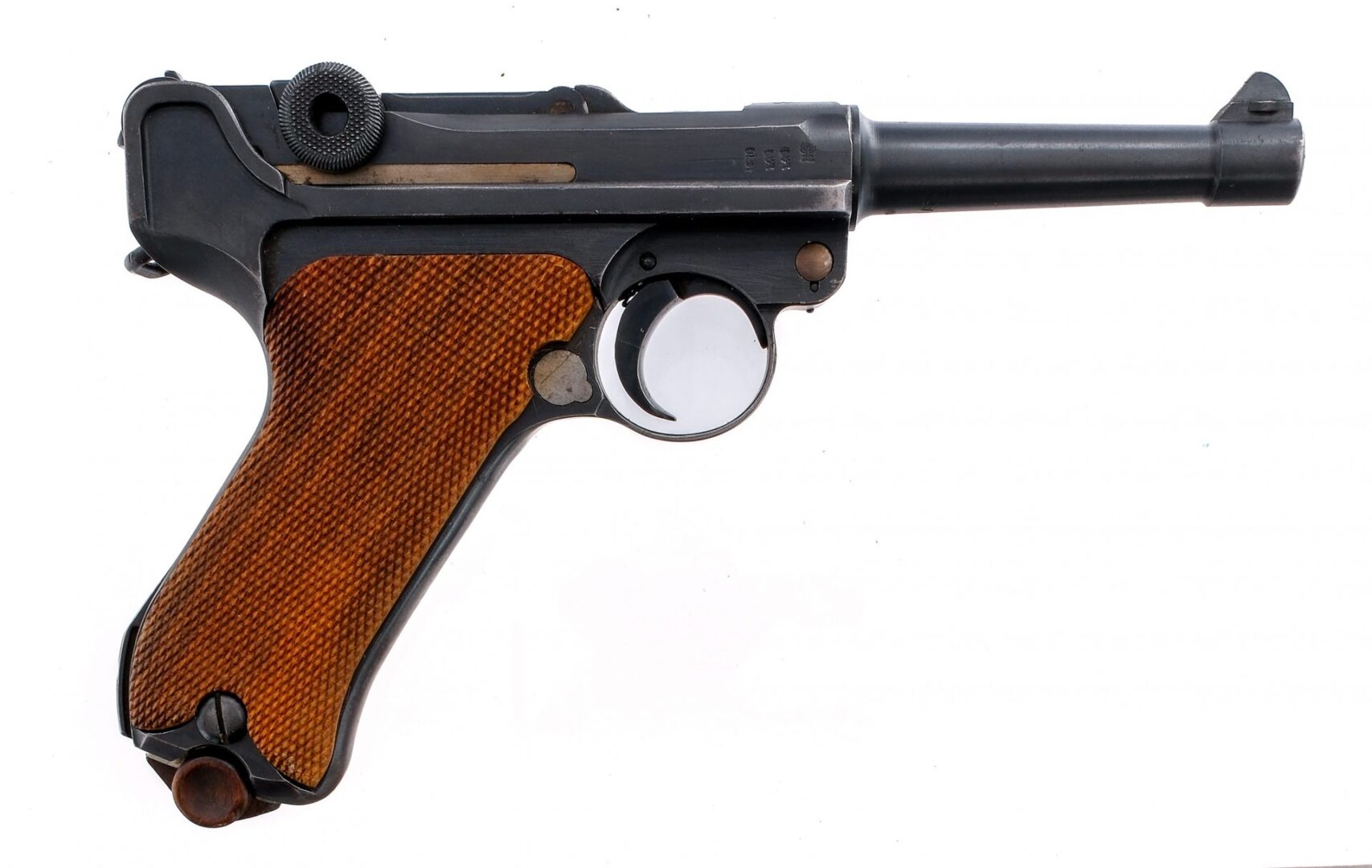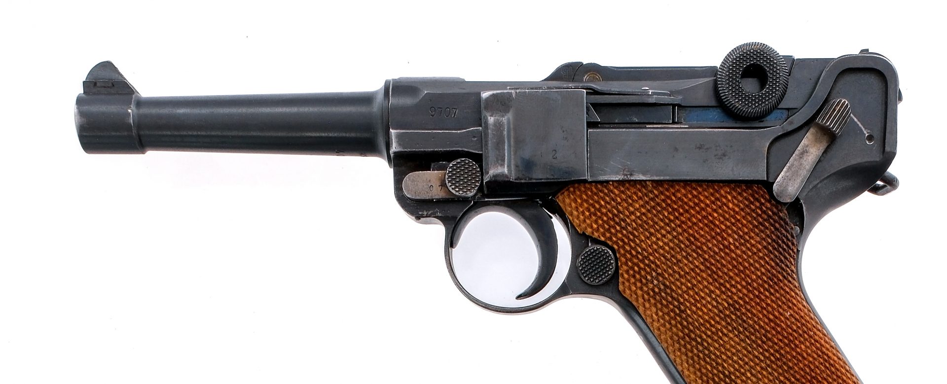 Description DWM 1914 Military model Luger chambered in 9mm with an eight round removable magazine and a 4″ barrel. Features serialized “9707” take-down lever, frame, barrel, breach, toggle links, and safety lever. Trigger stamped with a “6” and the trigger plate stamped “2”. Stainless magazine features wooden base plate serialized “9269”. Wooden grips appear to be aftermarket with a portion of the left grip plate chipped off under the safety lever. Top proof marks and “GESICHERT” partially filled with white paint. Includes leather Luger holster stamped Karl Barth Waldbrol, WaA727, 1939 SD, and includes unmarked multitool. Must ship to FFL or C&R holder Condition: Good, Very Good, with some operational and handling wear. Some finish loss on high edges, line from safety lever, and light scratches under takedown lever. One scratch along right side of frame and magazine release. Some light oxidization on lower left side of frame. Magazine has some light oxidization on surfaces. Holster is in decent shape, aside from one belt loop hole being stretched. Bright clean bore with visible rifling. Barrel Length: 4″ Serial: 9709 Manufacturer: DWM Year: 1918 Caliber: 9mm Model: 1914 Military P08 Luger Book# 02931