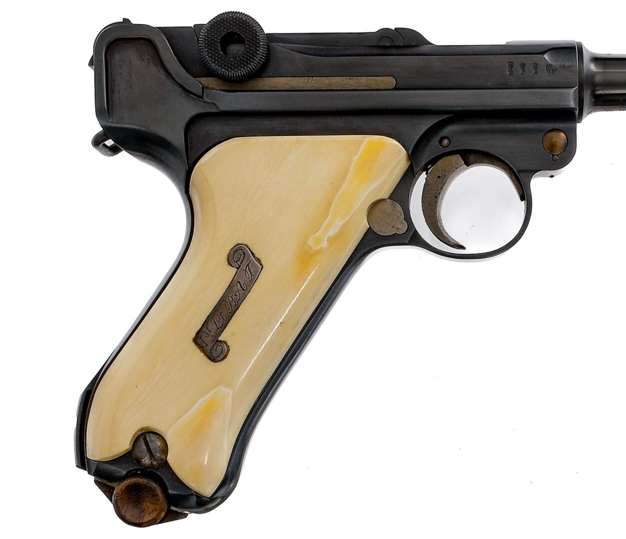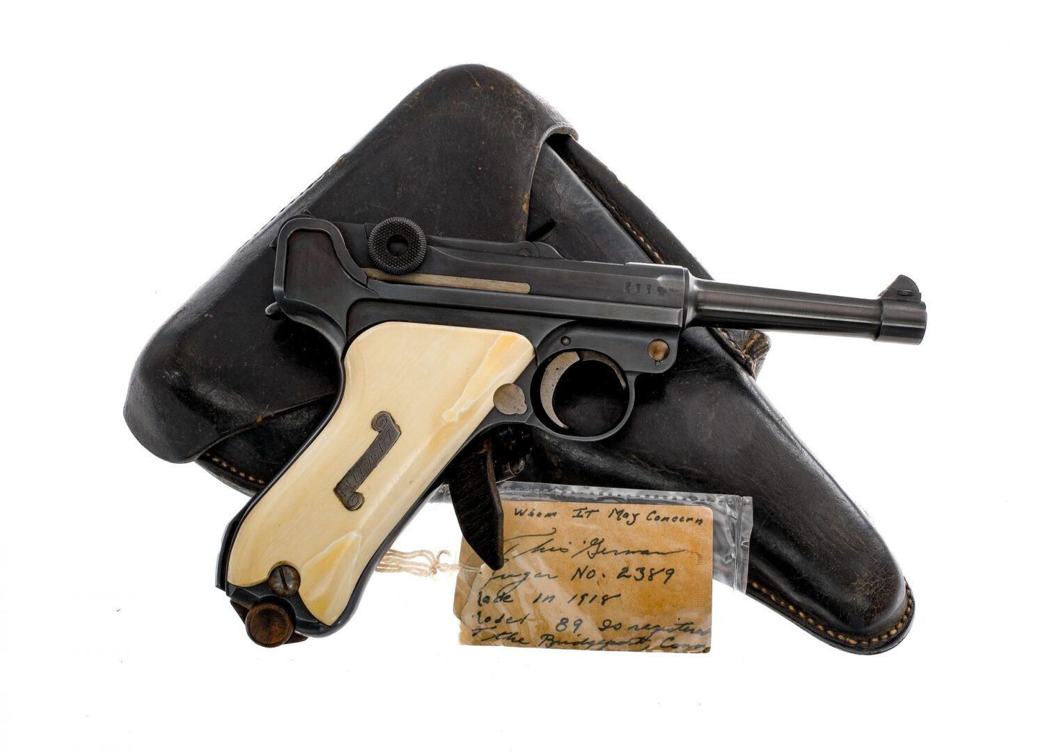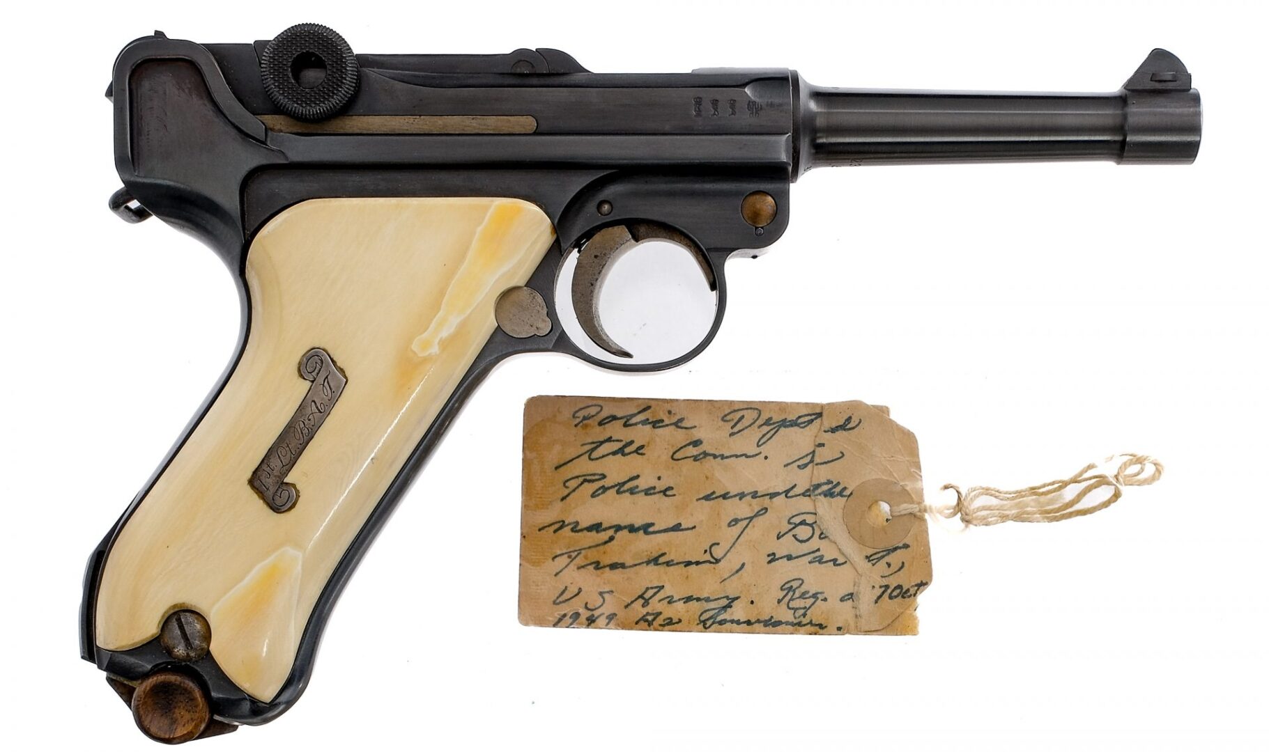 Description DWM 1918 Luger P08 semi auto pistol chambered in 9mm. This numbers matching example including firing pin, but with the exception of magazine and grips, features a 4″ barrel with dovetailed front blade and v-notch rear sight, blued finish, and bone grips with one of two scroll silver inlays present which looks to read “1st Lt. B.A.T. Appears to be some type of presentation piece or GI bring back. Includes WWII era “cxb / 1941″ leather holster as shown. Ships to FFL/C&R only. Condition: Excellent with the exception of the mismatched grips, one of which is missing an inlay. The bore is bright with sharp rifling and the action functions as expected. Barrel Length: 4” Serial: 2389 Manufacturer: DWM Year: 1918 Caliber: 9mm Model: P-08